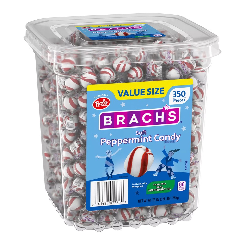 Brach's Soft Peppermints are truly unique, made with invert sugar giving each piece a smooth, consistent texture that melts in your mouth, and flavored with triple distilled peppermint oil. Product Features: One container of 350 pieces of Brach's Soft Peppermint Candy Made with real peppermint oil Individually wrapped Perfect post-meal treat Fat-free and gluten-free Includes soft peppermint candies, 350 ct. Ingredients: Sugar, Peppermint Oil, Red 40, Red 40 Lake. Product Warnings and Restrictions: Safety Warning: Small Objects Such As Hard And Soft Candies May Inadvertently Become Lodged In The Throat.