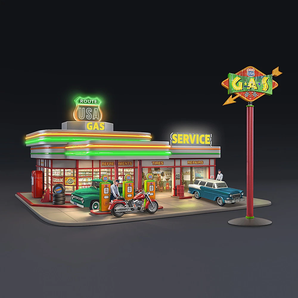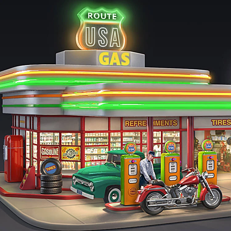 This exclusive collectible illuminated gas station sculpture from The Bradford Exchange features: Evoke the nostalgic feel of classic American road trips with the Route U.S.A. Gas Station Sculpture, a first available exclusively from The Bradford Exchange, Hawthorne Village Division Meticulously handcrafted with artist's resin, this illuminated gas station sculpture is set upon a fully sculpted display base with fueling pumps, vending machines and signage inspired by gas and car service advertisements Lights up! Retro-style, neon-like lighting illuminates around the station and the "ROUTE USA" sign, while the station interior and exterior also lights up Fully sculpted, hand-painted vintage vehicles (which fit in the garage bays) and gas attendant figures are removable, giving you the joy to arrange the scenes to your liking A standing gas sign is posed separately, and has a "weathered" look for period authenticity Vintage-inspired retro-style gas station sculpture makes a fine addition to any 1950s decor Certificate of Authenticity Measures approximately 8-1/2" W x 4-1/2" H x 8" D; 21.6 cm W x 11.4 cm H x 20.3 cm D