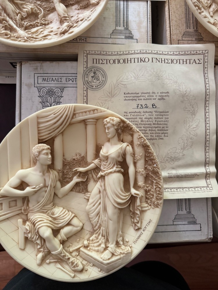 Absolutely stunning set of collector plates! The intricate Greek-inspired designs and elegant beige tones make them a perfect display piece. The marble-like material adds a touch of classic sophistication, and the 1980s art pottery vibe gives them a unique charm. A must-have for collectors who appreciate timeless craftsmanship and cultural artistry. Love how they elevate any space!