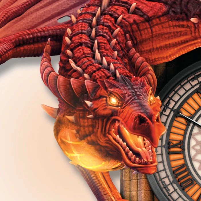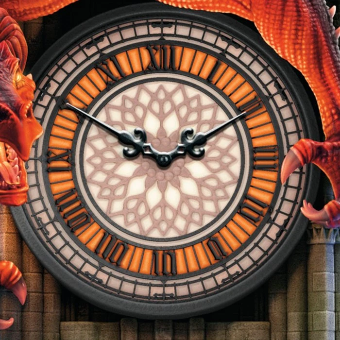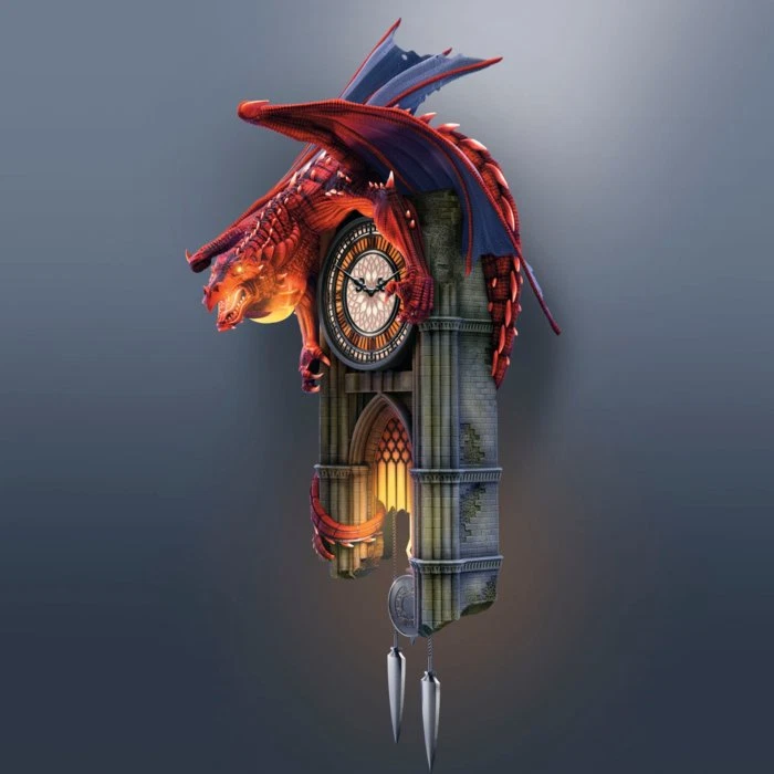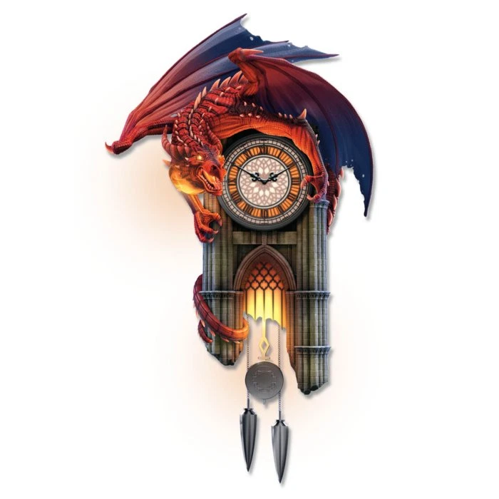 This exclusive collectible Reign of Fire wall clock from The Bradford Exchange features: Hang a triumph of art inspired by mythical dragons on your wall with this Reign of Fire Dragon Wall Clock, exclusively from The Bradford Exchange Lights and sound on the hour! The stained glass-style clock face, arched cathedral window, dragon's eyes and breath all light up as if on fire while the mighty dragon lets out a fierce roar every hour Fully sculpted, this illuminated wall clock features meticulously hand-painted lifelike details, from the scales on the dragon to the aging stones of the Gothic cathedral-shaped clock case Two spear-shaped weights and a pendulum tick in the time while the dragon waits for each hour to strike This captivating dragon home decor masterpiece is powered by a precise quartz movement for accurate time-keeping Arrives ready to hang Requires 1 "AA" battery (not included) Edition limited to 295 casting days, so order now! Hand-numbered with matching Certificate of Authenticity Measures 17" H x 4-1/2" D including pendulum and weights; 43.2 cm H x 11.4 cm D
