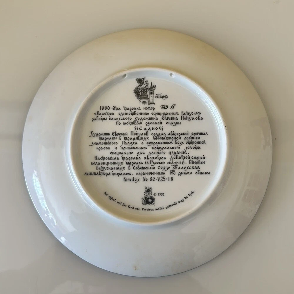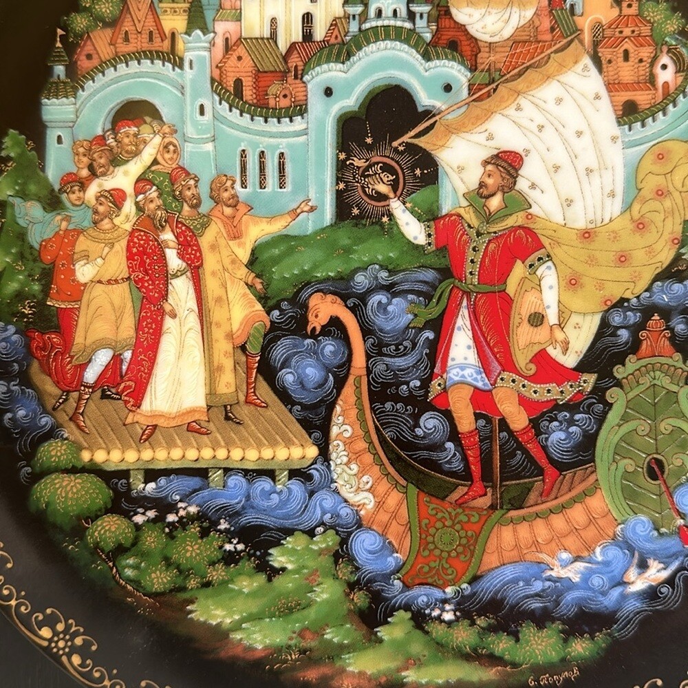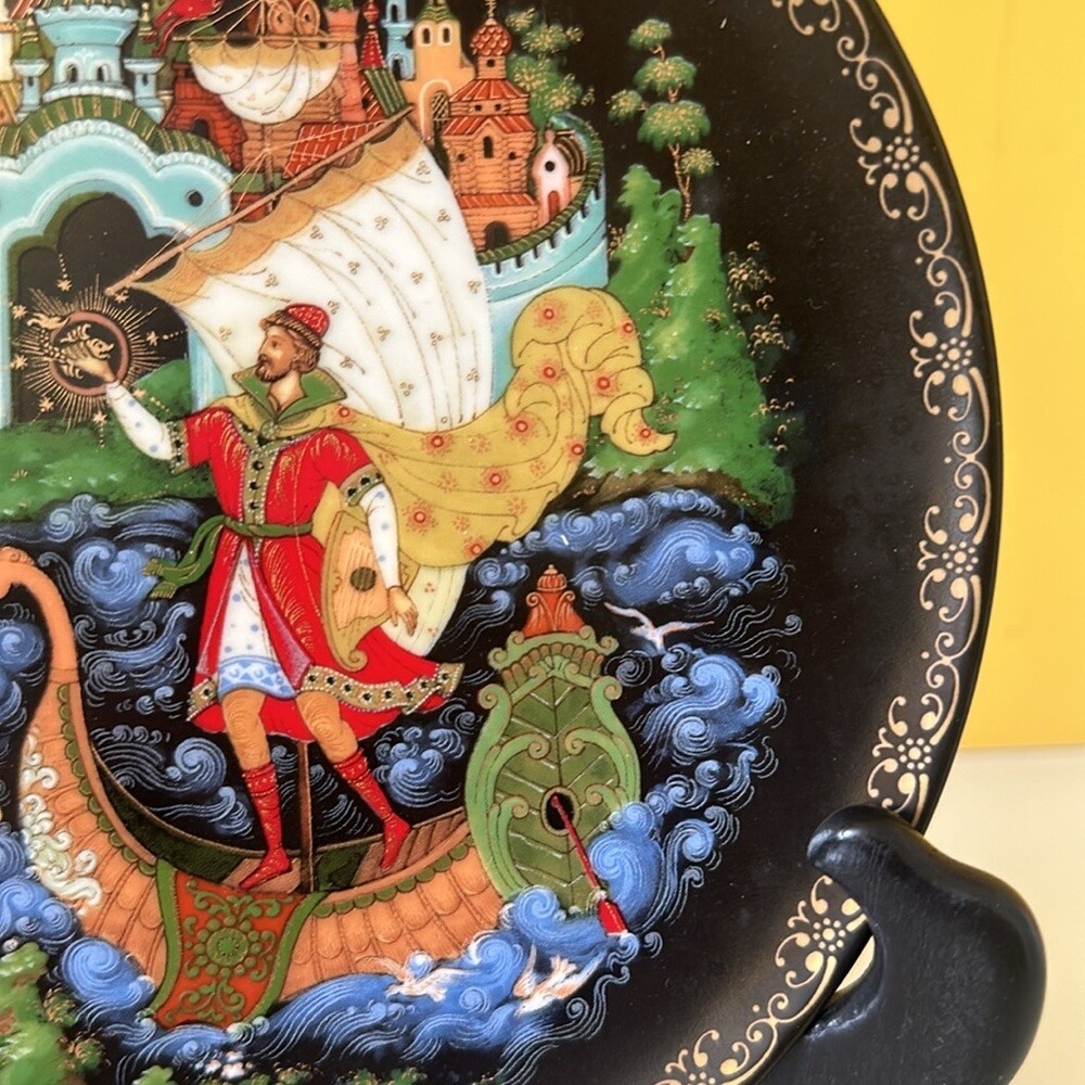 Vintage Porcelain Plate “Sadko" from the Russian Legends Collection, Plate # 9 Ninth plate in the Series from the Russian Legends Collection of limited edition plates by Artisan Evgeniy Polupov. Year / Name: 1990 Sadko Artist: Evgeniy Polupov Maker/ Manufacturer: Palekh Medium: Porcelain Signed The plate is 8 inches in diameter. Excellent preowned condition: no cracks, no chips. The plate will come as-is. Stand, box or booklet is not included.