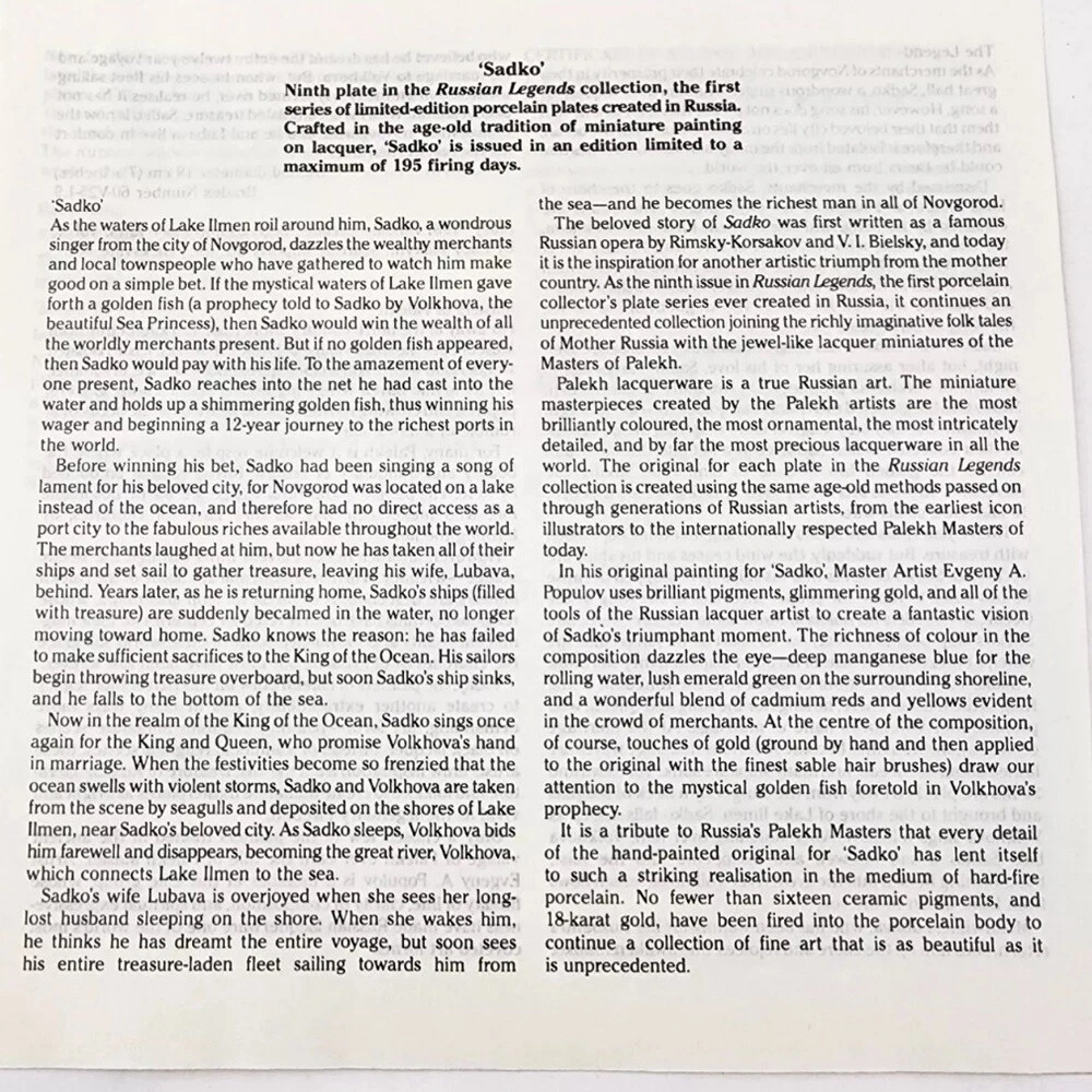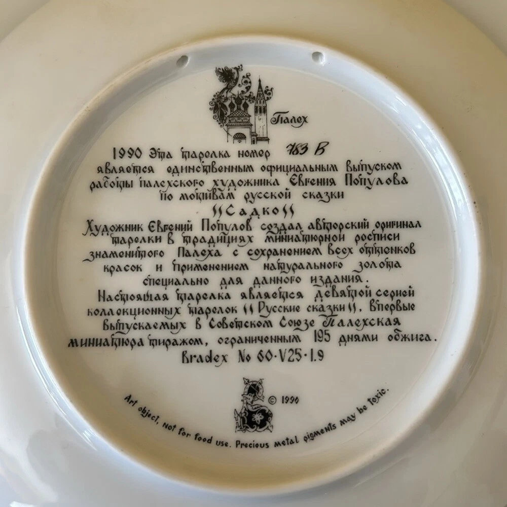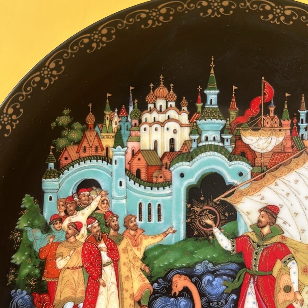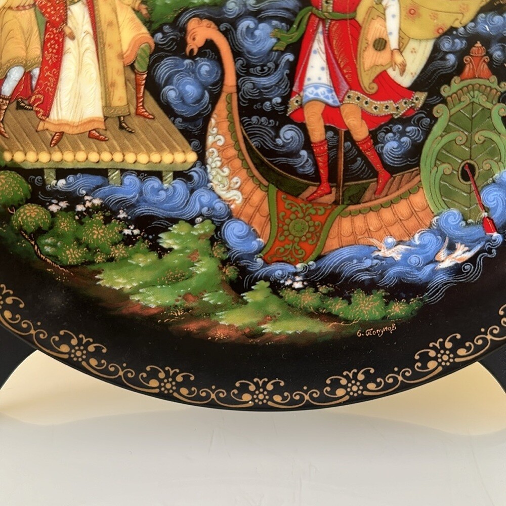 Vintage Porcelain Plate “Sadko" from the Russian Legends Collection, Plate # 9 Ninth plate in the Series from the Russian Legends Collection of limited edition plates by Artisan Evgeniy Polupov. Year / Name: 1990 Sadko Artist: Evgeniy Polupov Maker/ Manufacturer: Palekh Medium: Porcelain Signed The plate is 8 inches in diameter. Excellent preowned condition: no cracks, no chips. The plate will come as-is. Stand, box or booklet is not included.