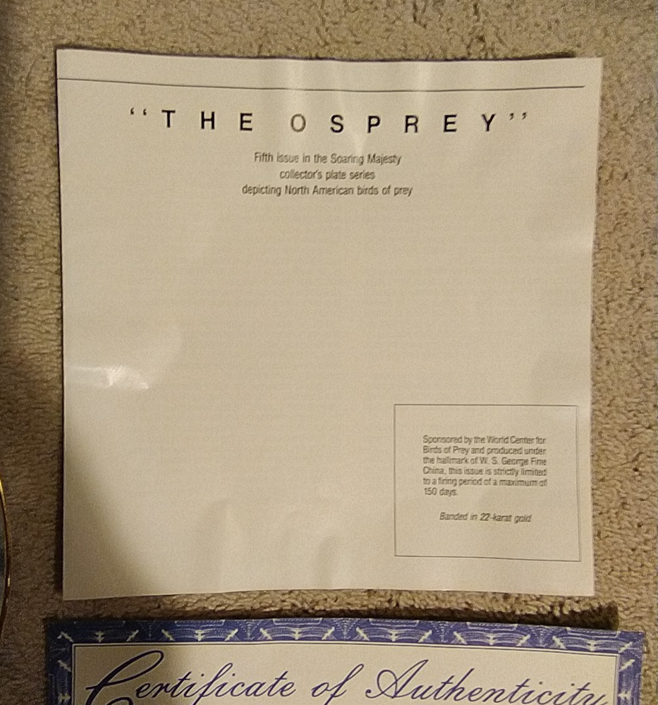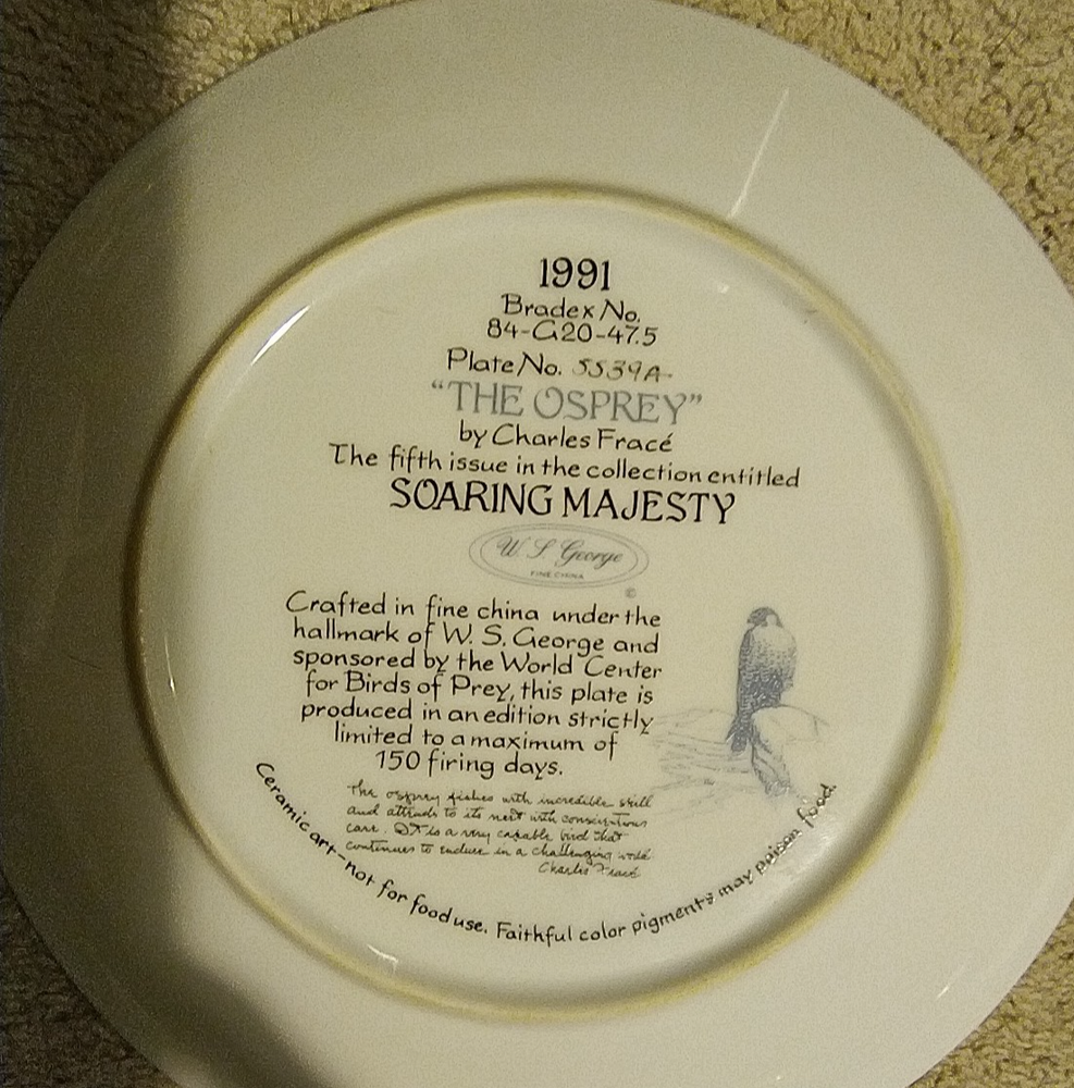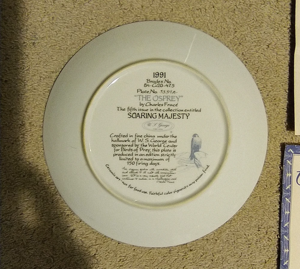 Elevate your collection with the Bradford Exchange Soaring Majesty decorative plate, featuring the exquisite artwork of Charles Frace. This round ceramic collector's item, measuring 8.5 inches in diameter, showcases a vibrant multicolor palette that brings the majestic allure of an osprey in flight to your display. Crafted in the 1990s, this piece embodies the artistry and quality synonymous with the Bradford Exchange brand. The plate is a testament to the decorative style of the late 20th century, with a design that celebrates American culture and the beauty of wild animals. Complete with a stand for easy display, it's an ideal keepsake for all occasions that will resonate with enthusiasts of art pottery and vintage collectibles alike. You Will Receive The Item(s) Pictured. We Do COMBINE SHIPPING So Take A Look At Our Other Items. If You Would Like To Take Advantage Of The COMBINED SHIPPING Please Wait For Invoice Before Payment. If You Have Any Questions We Will Be Happy To Answer Them.