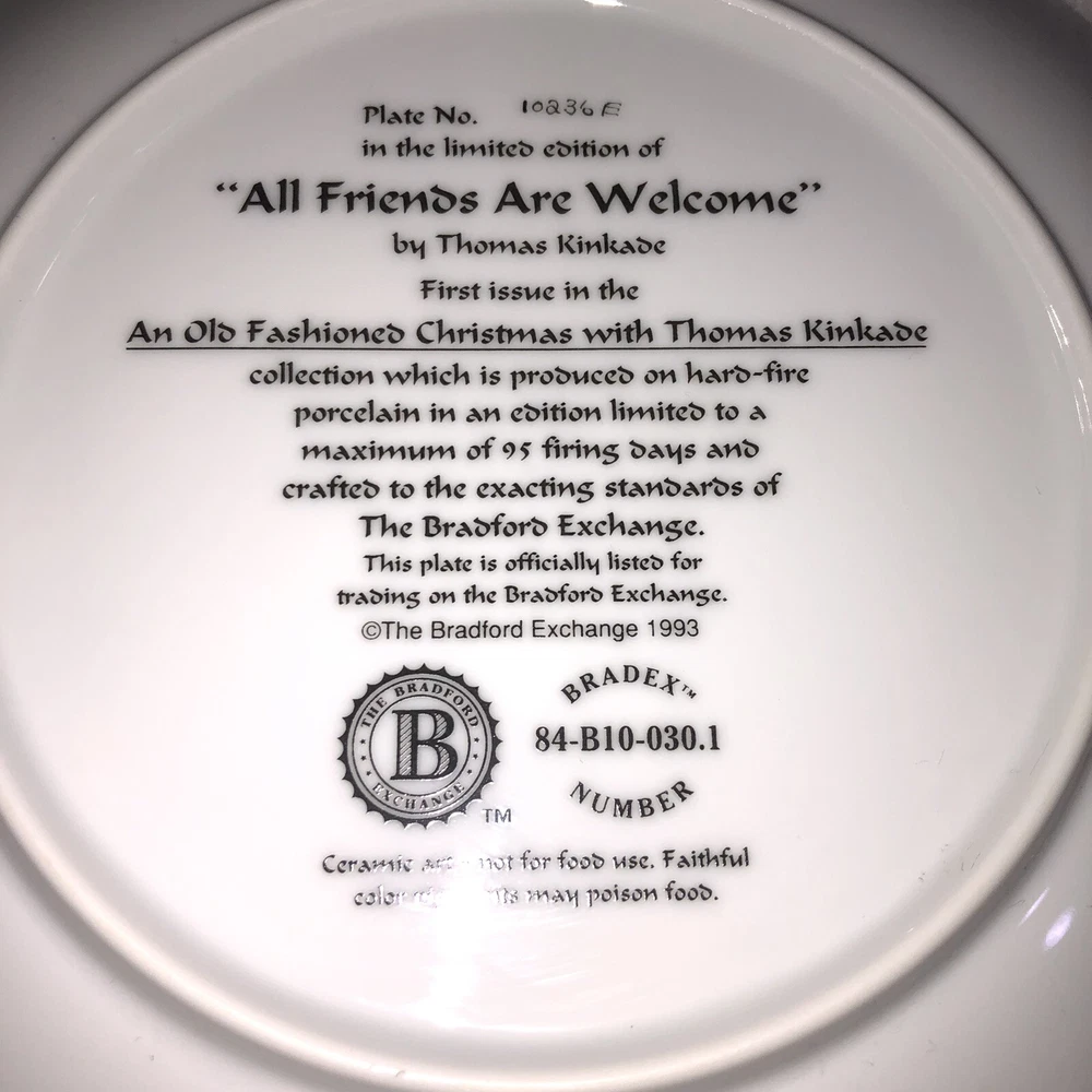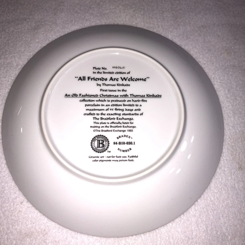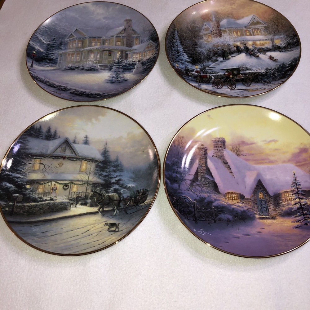 This is a stunning lot of 4 Bradford Exchange decorative plates by Thomas Kinkade. These plates are from his "An Old Fashioned Christmas" series. They date from 1993 and 1994. Included in the lot are: -1993 All Friends Are Welcome, the first issue in the series. The plate is numbered 10236E and has a BRADEX NUMBER of 84-B10-030.1 - 1993 Winter Memories, the second issue in the series. The plate is numbered 16598A and has a BRADEX NUMBER of 84-B10-030.2 -1994 Christmas Tree Cottage, the fourth issue in the series. The plate is numbered 5990A and has a BRADEX NUMBER of 84-B10-030.4 - 1994 The Best Tradition, the fifth issue in the series. The plate is numbered 7739A and has a BRADEX NUMBER of 84-B10-030.5 The plates are edged in a gold trim and measure approximately 8 inches. They are in good vintage pre-owned condition. There are no nicks, chips, cracks or repairs. Gold trim shows little to no wear. These no longer include their original boxes or certificates. This is a plates only listing. Please review and enlarge all photos for additional details, views and measurements. Shipped via USPS Ground Advantage.