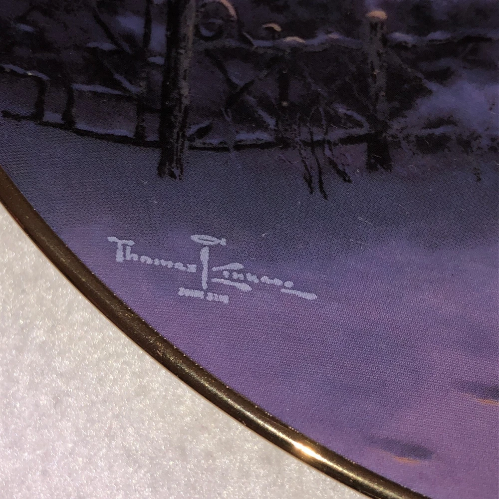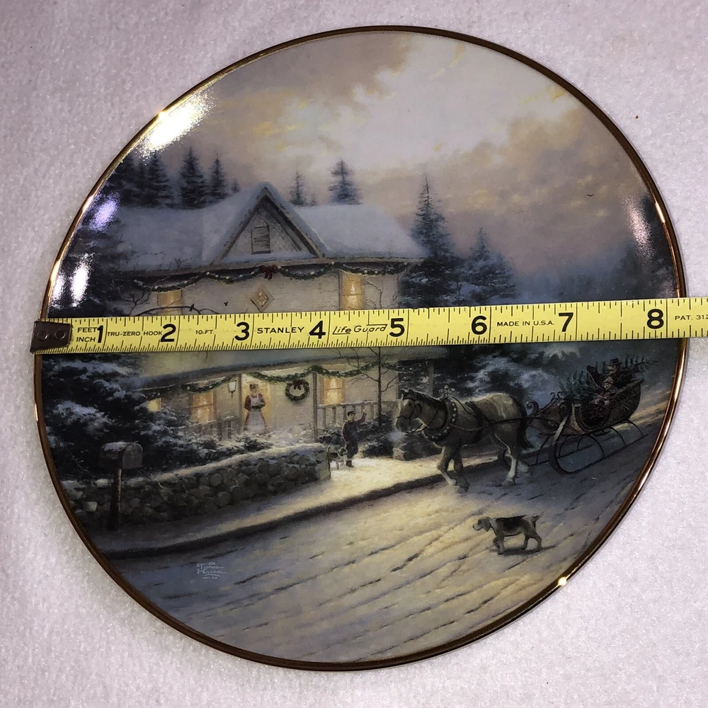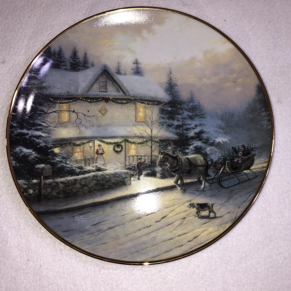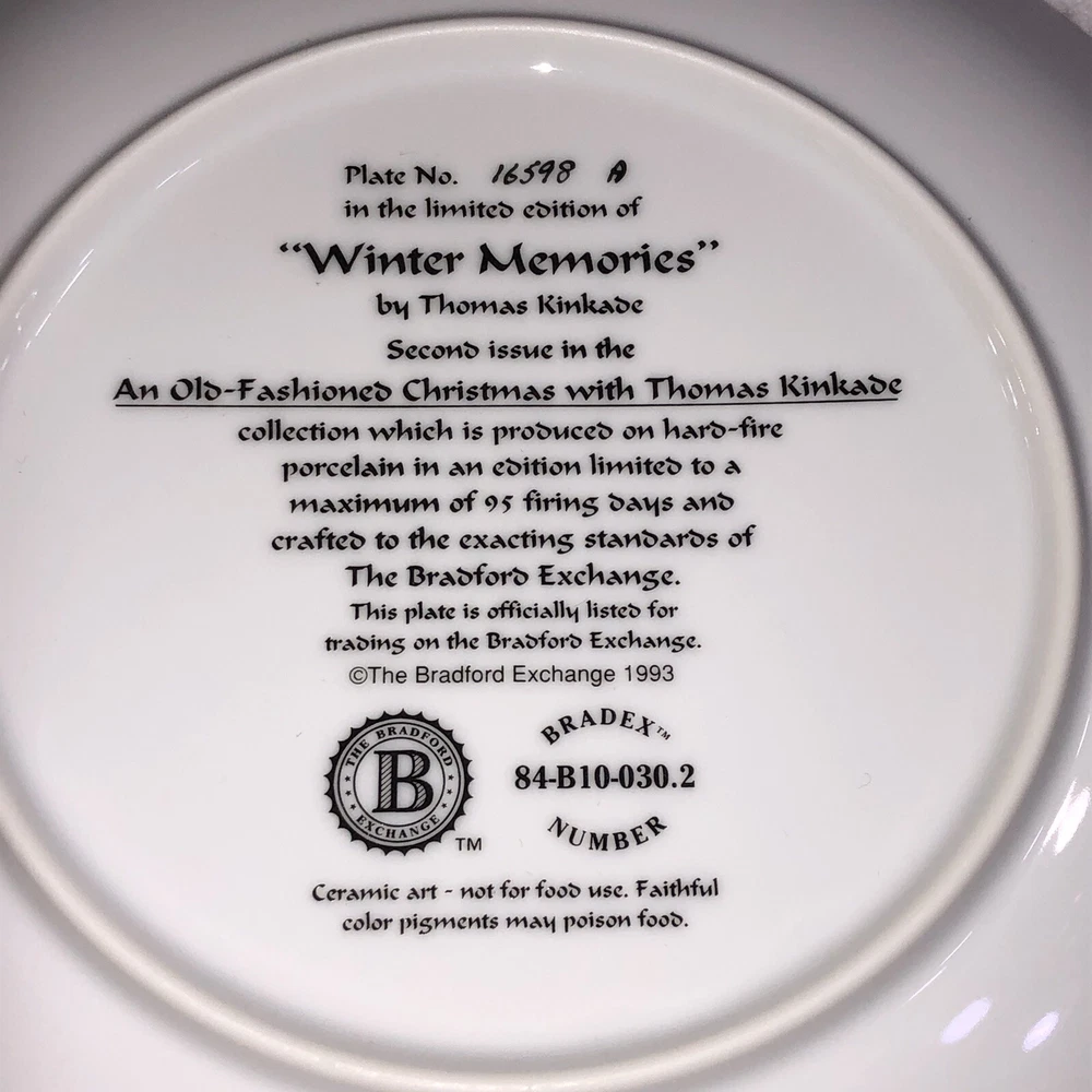 This is a stunning lot of 4 Bradford Exchange decorative plates by Thomas Kinkade. These plates are from his "An Old Fashioned Christmas" series. They date from 1993 and 1994. Included in the lot are: -1993 All Friends Are Welcome, the first issue in the series. The plate is numbered 10236E and has a BRADEX NUMBER of 84-B10-030.1 - 1993 Winter Memories, the second issue in the series. The plate is numbered 16598A and has a BRADEX NUMBER of 84-B10-030.2 -1994 Christmas Tree Cottage, the fourth issue in the series. The plate is numbered 5990A and has a BRADEX NUMBER of 84-B10-030.4 - 1994 The Best Tradition, the fifth issue in the series. The plate is numbered 7739A and has a BRADEX NUMBER of 84-B10-030.5 The plates are edged in a gold trim and measure approximately 8 inches. They are in good vintage pre-owned condition. There are no nicks, chips, cracks or repairs. Gold trim shows little to no wear. These no longer include their original boxes or certificates. This is a plates only listing. Please review and enlarge all photos for additional details, views and measurements. Shipped via USPS Ground Advantage.