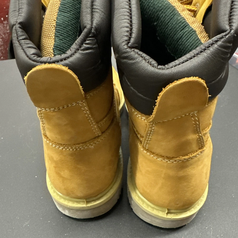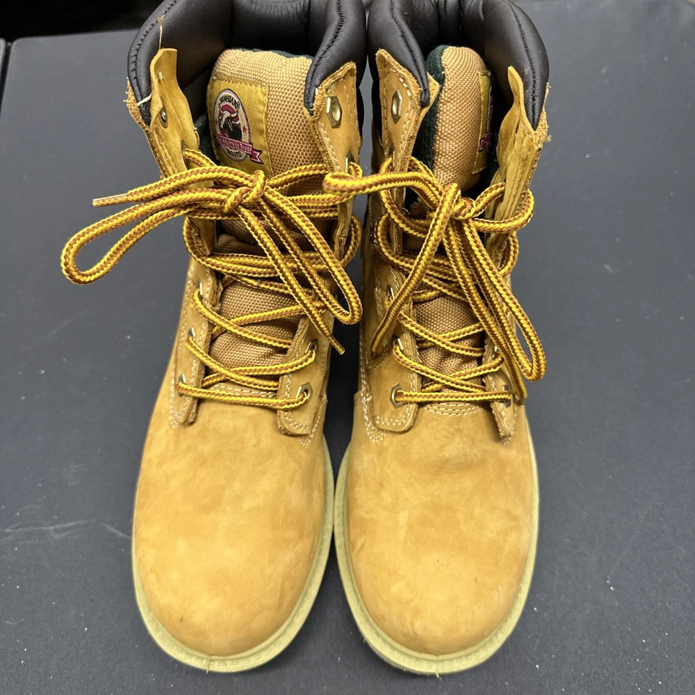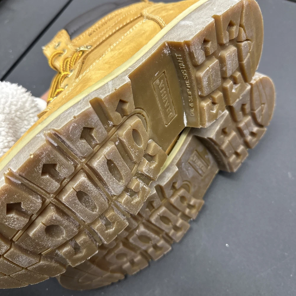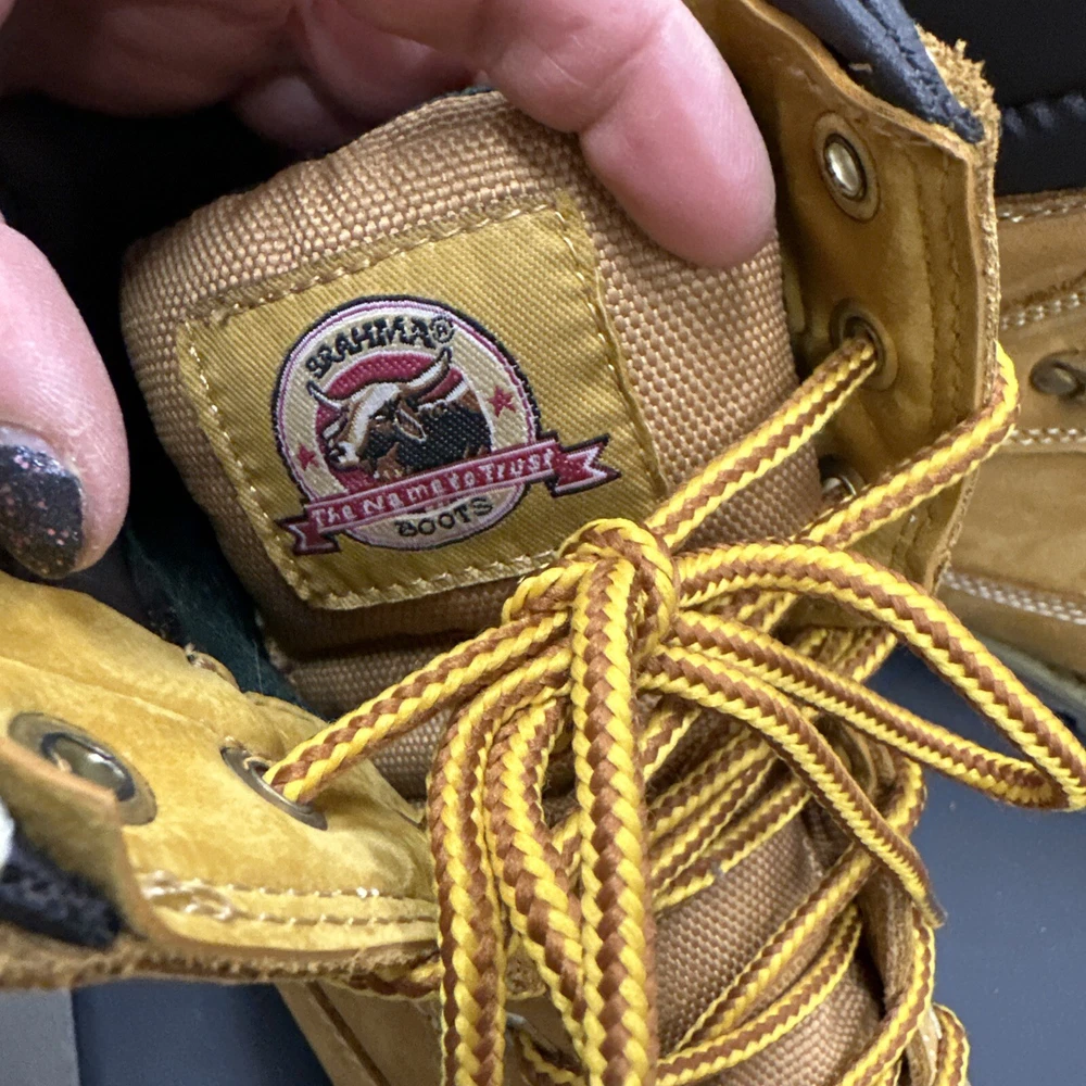 This product is a pair of Brahma men's leather work boots in size 8.5 extra wide. The boots come in a caramel/wheat color and feature a solid pattern with a durable leather upper material. They are designed for work environments, with oil and slip-resistant outsoles for safety. Additionally, the boots are waterproof, breathable making them suitable for hiking and various outdoor activities. PLEASE NOTE. Boots are never been used but have some wear from storage like little stains and little dirty sole. ( please check pictures) what you see its what you will get.