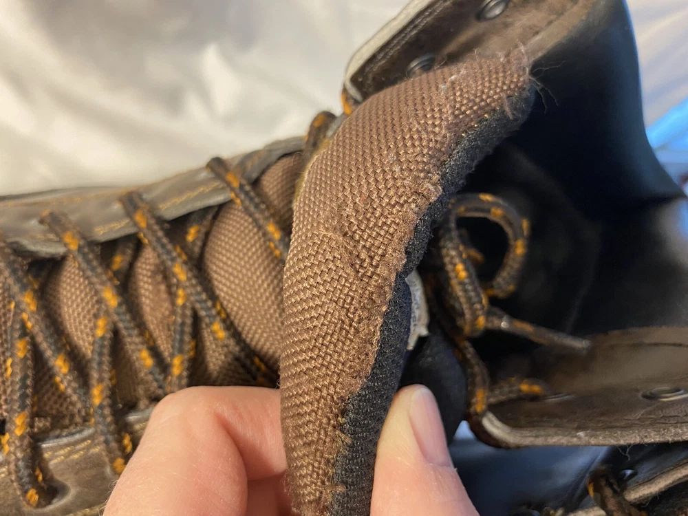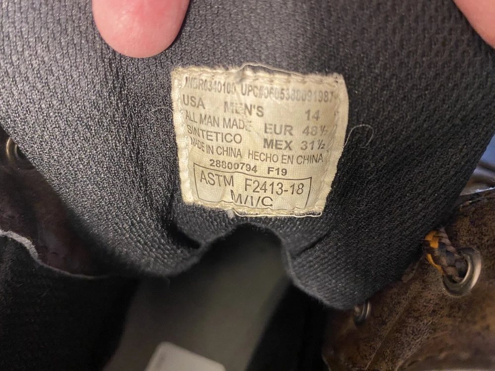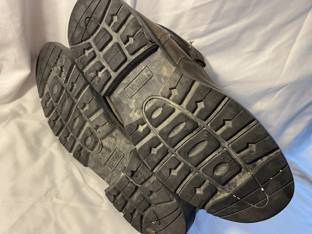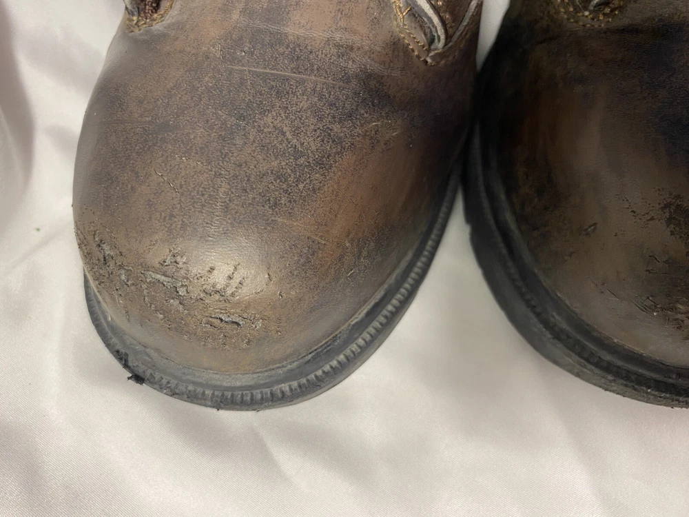 The Brahma Men's Size 14 Steel Toe Work Boots are designed with a round toe shape and lace-up closure for a secure fit. These mid-calf combat-style boots feature a steel toe for added protection in a work environment. The brown boots are suitable for casual or workwear occasions and have accents of laces. Made from man-made materials with a synthetic insole, these boots are sturdy and durable for outdoor activities in all seasons. Some wear on the boots, as seen in pictures.