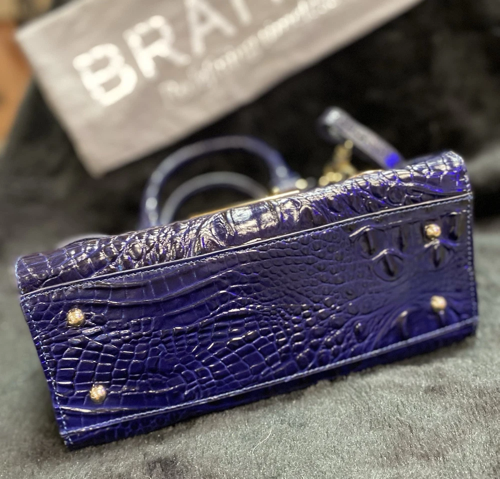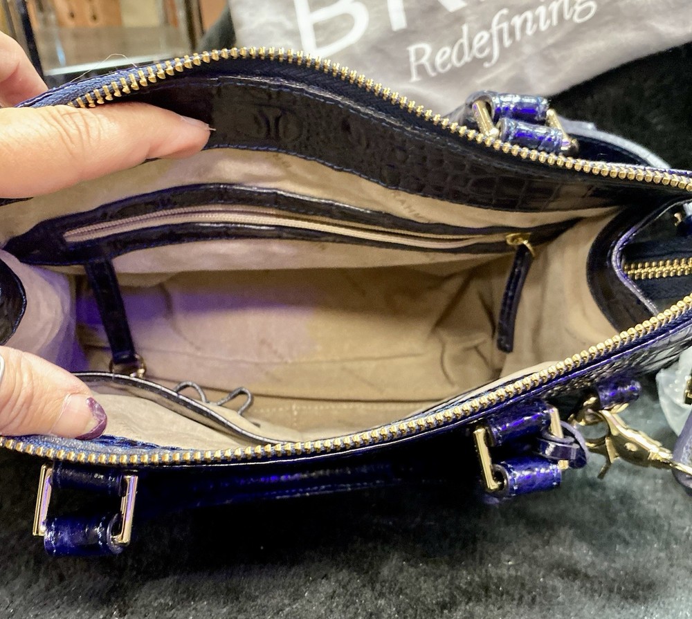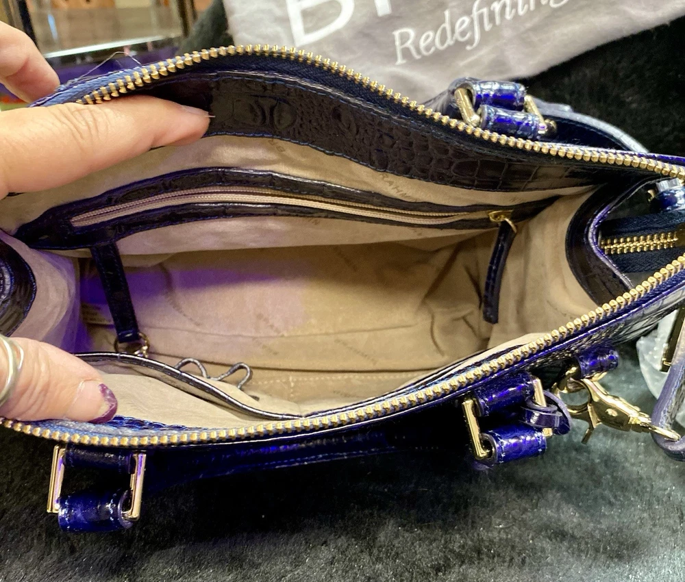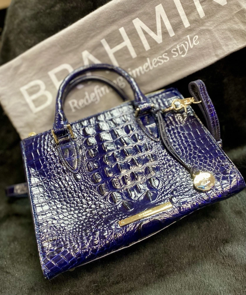 This Brahmin satchel is absolutely stunning! The ultraviolet ombre leather is rich and eye-catching, with gorgeous gold hardware and croc embossing. The double rolled handles and adjustable strap make it super versatile, while the interior is spacious with plenty of pockets. The matching wallet is a perfect touch—love the card slots and zippered pocket. Feels luxurious and brand new, plus the dust bag is a nice bonus. A must-have for any handbag lover!