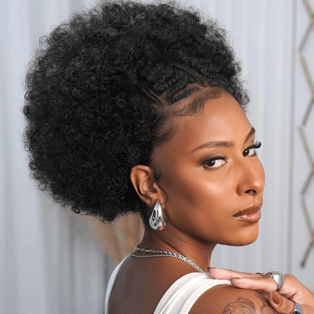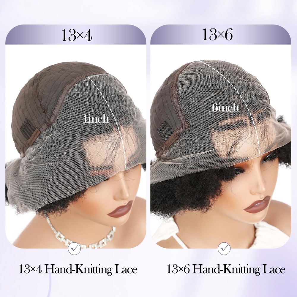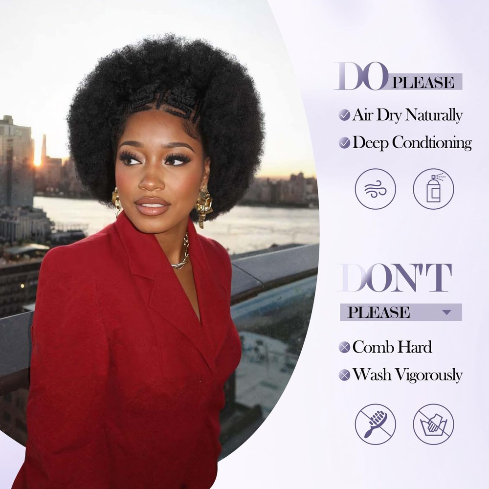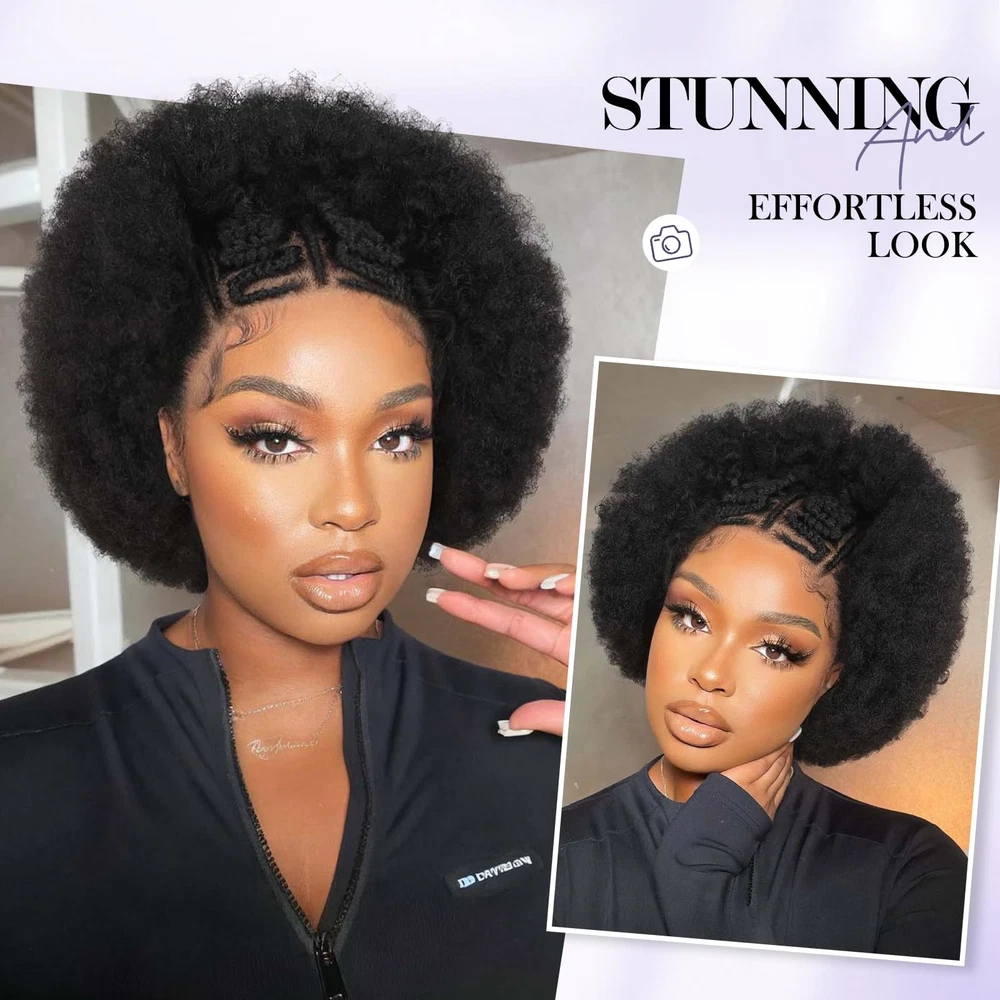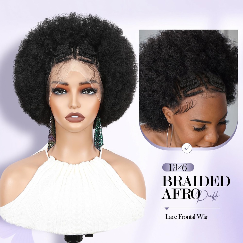 【Unique Lace Front】Achieve a stunning and effortless look with our short braided afro kinky curly wigs. this wig features a 13x6 HD transparent lace frontal, ensuring a natural and seamless hairline, soft and transparent. Suitable for any skin tone. Hand-woven braid, neat and tight. Pre plucked baby hair makes afro puff wig look more natural. 【Hair Material】The material of this afro curly wig is selected from the imported synthetic fiber, soft and light, not easy to break or shed, with natural human hair luster. People who are allergic to wig products can also the wig with confidence. 【Lace Frontal Cap】The kinky curly 13X6 lace frontal hair will be more authentic to wear, as natural as your own hair. In order to fit more women's head circumference, the wig cap adopts a uniform medium size. A hairnet is included in the package and can be used directly. It is the perfect choice for black women facing hair loss and low hair volume. 【Product Specifications】This braidded lace hair is only about 160 grams, super lightweight. There is no any discomfort to attend any occasion with it. Installation and removal are quite simple, easy to operate, saving time and effortless. 【Hair Care Tips】Handmade lace wigs may have a small amount of hair loss, please don't comb hard. When washing, don't rub vigorously, hang naturally to dry, avoid direct sunlight please.