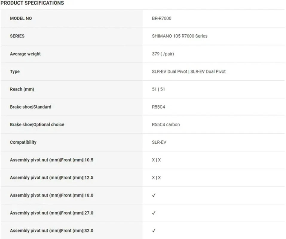 105 Dual-Pivot Brake Caliper BR-R7000 105- Dual-Pivot - Brake Caliper - SLR-EV - Rim Brake Available in silver and black, the SHIMANO 105 R7000 caliper stops with a predictable, linear braking curve thanks to its sleek design. It is compatible with 28mm tires and both traditional and direct mount options. FEATURES Clear contact feeling with balanced rigidity, weight and stopping power More predictable, linear braking curve Sleek design Narrower gap between arms Wider clearance with larger tire sizes Compatible with wider 28C tire size