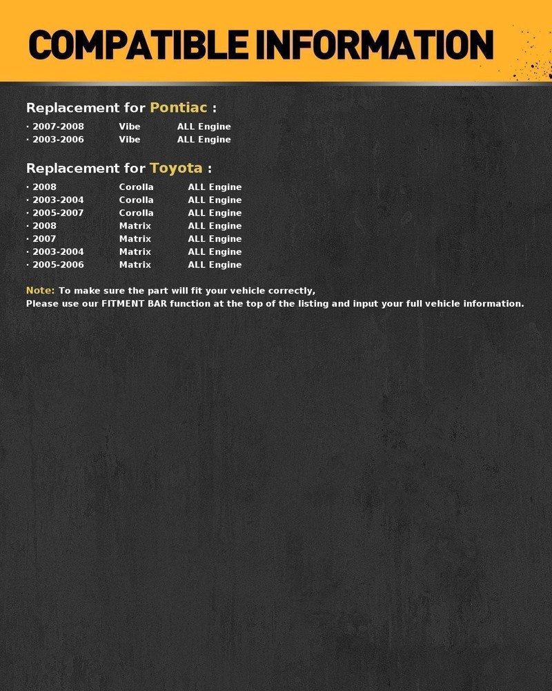 Compatibility: AC Condenser For 2003-2004 Toyota Corolla Matrix 1.8L 4Cyl With Drier Aluminum Compatibility: 2003-2004 Toyota Corolla 2003-2004 Toyota Matrix Features: -Aluminum construction to ensure heat transfer efficiency -Louvered aluminum fins and tubes are bonded through a unique furnace-brazing process with premium quality aluminum for maximum heat dissipation -Each product is quality inspected and 100% tested -Lightweight Direct Bolt-On OEM Fitment or Replacement -Guaranteed Exact Fit for easy installation Know about the AC Condenser: AC Condenser: The condenser is part of the A/C system. It receives the hot, high-pressure gaseous refrigerant from the compressor and cools it to a warm liquid state, although still under high pressure. Location: The Condenser is located right in front of the radiator. High pressure (hot) refrigerant travels through it and cools off as air passes through. Most late-model condensers cannot be flushed due to multiple flow paths, and must be replaced if restricted. Check: If testing proves that your condenser is leaking, restricted, or otherwise damaged, don’t pay the high dealer price for a replacement, when you can get an OE quality condenser for much less from Replace. Package: 1pc of brand new ac condenser Item Specifics Brand KAX Features 25.69 x 15.38 x 0.63 in. Core Size Fitment Type Direct Replacement Interchange Part Number 73085 Manufacturer Part Number KVAC3085 Manufacturer Warranty 5 Years Material Aluminum Notes With Receiver Drier; Color/Finish may vary and won't affect the p OE Number 8845002170 OE/OEM Part Number 8845002170 Part Link Number TO3030184 Part Name A/C Condenser Partslink Number TO3030184 Quantity Sold individually Returns Policy 60-Day Return Policy Superseded Part Number 73085 Universal Fitment No Payment FREE SHIPPING on all products within 50 States USA! USA Sales & Support - We are a 100% USA Seller! We ship 5 Days a week (Mon-Friday) excluding major Holidays. Tracking Number will be uploaded to eBay and or / Emailed to you typically within 24 hours of shipment. International Customers may be subject to customs fees that are out of our control. International shipments may take longer than the eBay specified time due to country customs. We only accept Paypal. Quantity orders are welcome! Shipping USA Sales & Support - We are a 100% USA Seller! We ship 5 Days a week (Mon-Friday) excluding major Holidays. Tracking Number will be uploaded to eBay and or / Emailed to you typically within 24 hours of shipment. International Customers may be subject to customs fees that are out of our control. International shipments may take longer than the eBay specified time due to country customs. We only accept Paypal. Quantity orders are welcome! Returns 1. All our product share 1-year warranty. If incorrect or defective item when you receive it, please feel free to contact us via eBay message. We promise no extra charges, we will pay return shipping fee and arrange replacement ASAP. 2. If buyer want to return the product without any problem, buyer should pay return shipping fee. The item must be returned in good condition and its original packaging and accessories, never installed or mounted. We will not accept returns after 30 days of delivery date. Contact Us 1. Any problem, complaint or suggestion happened during transaction, please contact us before leaving any feedback. We are committed to resolve all issues in a friendly and satisfactory manner. 2. We will solve your problem during working time (except weekends and public holidays). Thank you! DESCRIPTION PAYMENT SHIPPING RETURN POLICY CONTACT US Shop Category Store Home Starter Alternator Headlights Assembly Brake Pads Brake Rotors Power Steering Pump Timing Belt Kit & Water Pump Tires Radiator Other Excellent Delivery Hot Item Air AC A/C Compressor For Sanden SD508 For 1985-1990 Jeep Wrangler CO9537C USD 99.99 Set of 4 Ignition Coil For 2009-2013 Hyundai Santa Fe Kia Forte Optima L4 UF611 USD 28.49 Radiator For 2000 2001 2002 2003 2004 Nissan Pathfinder Infiniti QX4 V6 3.5L USD 74.99 Starter For Acura RSX Type-S Coupe 2-Door 2.0L 2002 DSDH9 17886 31200PRBA01 USD 51.99 AC COMPRESSOR CLUTCH KIT COIL PULLEY FITS: 2015 - 2019 SUBARU WRX 4 CYL 2.0L USD 43.99 New List Item For 09-2012 Toyota RAV4 L+R Pair Clear Bumper Fog Lights Driving Lamps+Switch USD 40.84 For 2007-2013 GMC Sierra 1500/2007-2014 2500HD 3500HD Bumper LED Fog Lights Kit USD 32.99 New Starter Fits Kia 2.7L Sportage 2005 2006 2007 2008 36100-37210 17764 12V USD 48.99 6726 SR111022 Starter For Chevrolet Aveo 1.6L 4 Cyl 2004 2005 2006 2007 2008 USD 49.99 Clear Bumper Fog Light for 2007-2013 Chevy Silverado 1500 2500 HD Tahoe USD 34.19 Help & Info Payment Policy Shipping Policy Return Policy FAQ About Us Brake Master Cylinder For 03-07 Toyota Corolla 03-06 Pontiac Vibe with Sensor Features & Details Brand: KAC Port Quantity: 2 Interchange Part Number: M630413,4720102310,88971207 OE/OEM Part Number: 88971207,4720102310 Sensor Included: Yes Items Included: 1x Master Cylinder - M630413 Material: Aluminium Superseded Part Number: M630413,4720102310,88971207 Reservoir Included: Yes Master Cylinder Bore Diameter: 20.7(MM) Rearward Outlet Size: M10 x 1.0 Key Benefits - Designed with high-quality aluminium for superior durability and corrosion resistance, ensuring long service life. - Comes complete with a sensor and reservoir included, making the brake system maintenance efficient and straightforward. - Engineered to match OE specifications, ensuring optimal fitting and reliable performance on compatible vehicles. - Suitable for usage in diverse models, increasing compatibility, particularly fits for 2005-2007 Toyota Corolla All engine, 2003-2004 Toyota Corolla All engine, and 2003-2006 Pontiac Vibe All engine. - Precision-crafted with a 20.7mm bore diameter, providing reliable brake pressure and improving overall vehicle safety. Compatibility For Toyota: Toyota Corolla 2003-2004 All engine Toyota Corolla 2005-2007 All engine