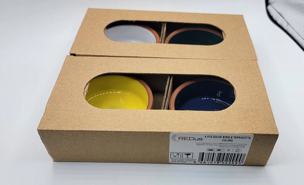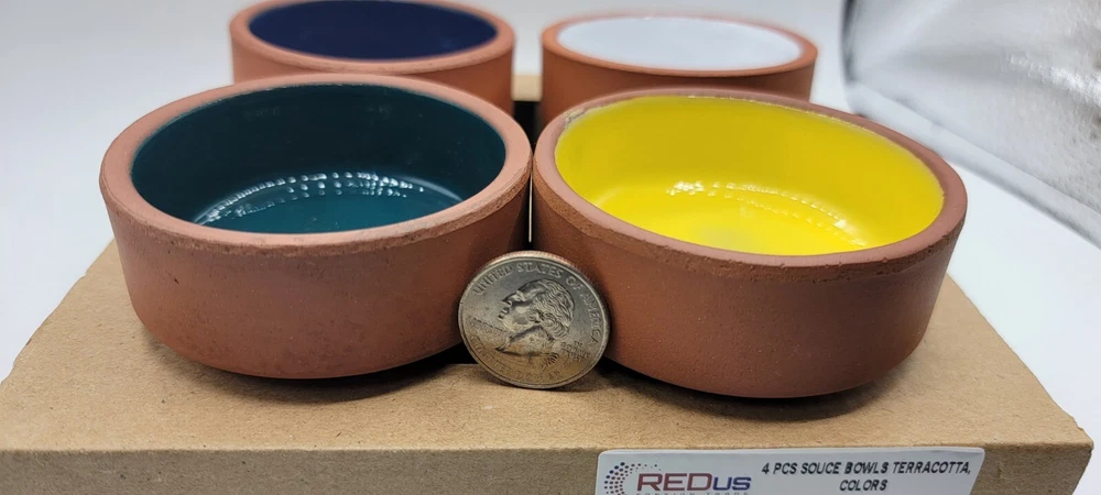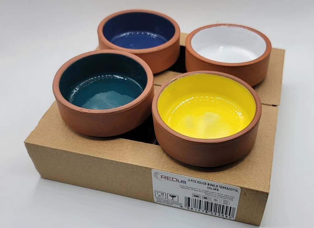 Brand NEW 4Pcs Ceramic Set of Terracotta, Yellow , White, Green and Blue Bowls. CLEARANCE SALE !! Bowls are great for Sauces / Serving / Dipping / Cooking. * Size : 1 1/4 inches deep & 2 3/4 inches wide * This product is in compliant with USA FDA * Usable in Microwave, Oven, Freezer & Dishwasher * Made in Turkey CLEARNCE SALE !!! NO RETURNS / NO REFUNDS / NO EXCHANGES !!!! All of our items are AUTHENTIC / 100% GENUINE. Check our feedback, save big $ and bid with confidence !!! Please ask for all questions BEFORE you bid, to eliminate any misunderstandings. All items will be shipped within 2 business day after cleared full payment . Emails and questions will be answered during regular business hours. No international Shipping. Local USPS Shipping ONLY.
