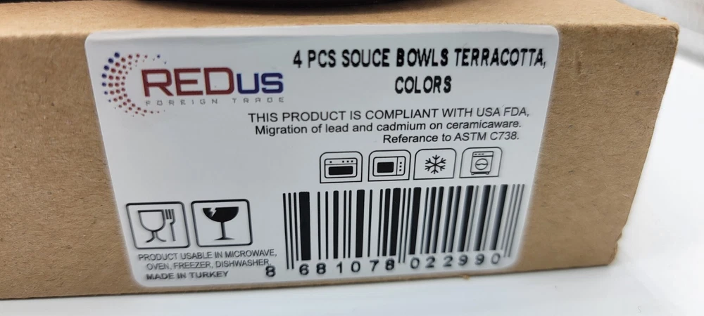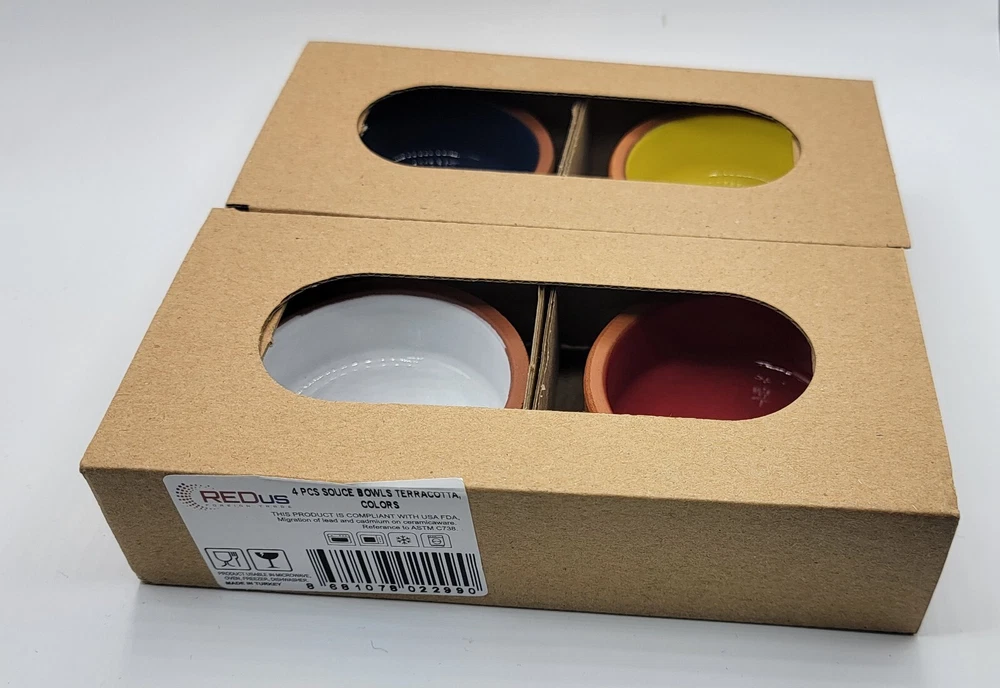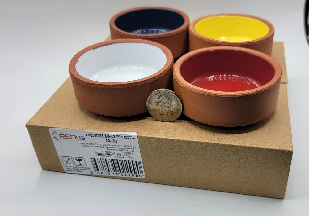 Brand NEW 4Pcs Ceramic Set of Terracotta, Yellow , White, Red and Blue Bowls. CLEARANCE SALE !! Bowls are great for Sauces / Serving / Dipping / Cooking. * Size : 1 1/4 inches deep & 2 3/4 inches wide * This product is in compliant with USA FDA * Usable in Microwave, Oven, Freezer & Dishwasher * Made in Turkey CLEARNCE SALE !!! NO RETURNS / NO REFUNDS / NO EXCHANGES !!!! All of our items are AUTHENTIC / 100% GENUINE. Check our feedback, save big $ and bid with confidence !!! Please ask for all questions BEFORE you bid, to eliminate any misunderstandings. All items will be shipped within 2 business day after cleared full payment . Emails and questions will be answered during regular business hours. No international Shipping. Local USPS Shipping ONLY.