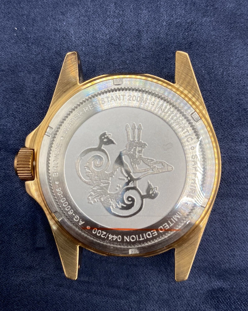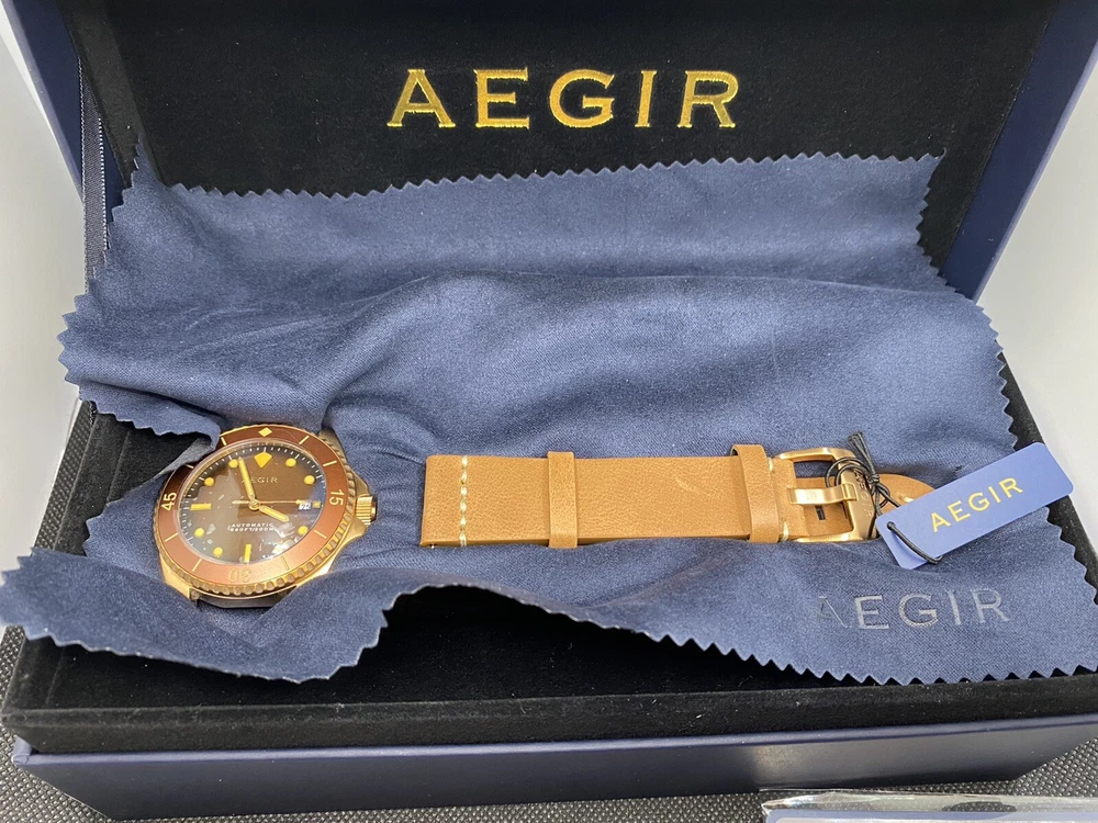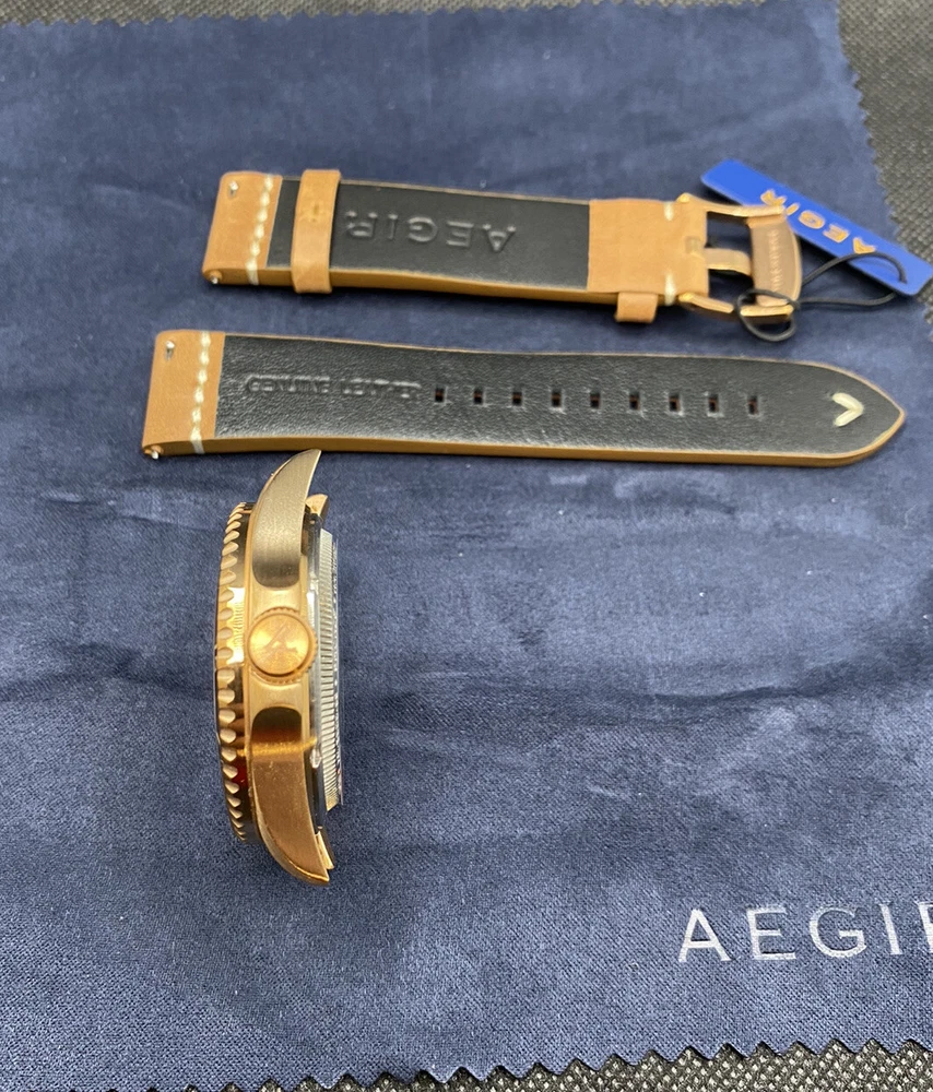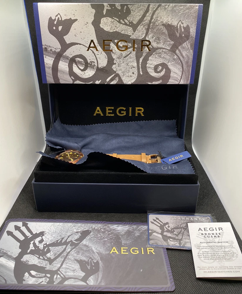From Aegir Website about the Kriger watch: " The Kriger is a hard wearing, tough yet resolutely built timepiece. Crafted out of genuine bronze, the watch is destined to change colour, with an organic patina that will characterize the watch over years and over the elements." This is watch 044/200 for this collection. This limited edition watch is brand new with the plastic still on, tags still on, in case, with the instruction manual, the 2 year warranty card, the certificate of authenticity, polishing cloth, and outer box. This watch has an anti-reflective sapphire crystal with a Japanese Miyota 8215 Automatic Movement. Watch has never been worn. The watch comes brand new with the strap not attached to the watch. Please let me know after you purchase this watch if you would like me to attach the band before shipping. MSRP - $800 Thanks for looking! Take a look at other watches I am selling on my page and let me know if you have any questions, thanks!