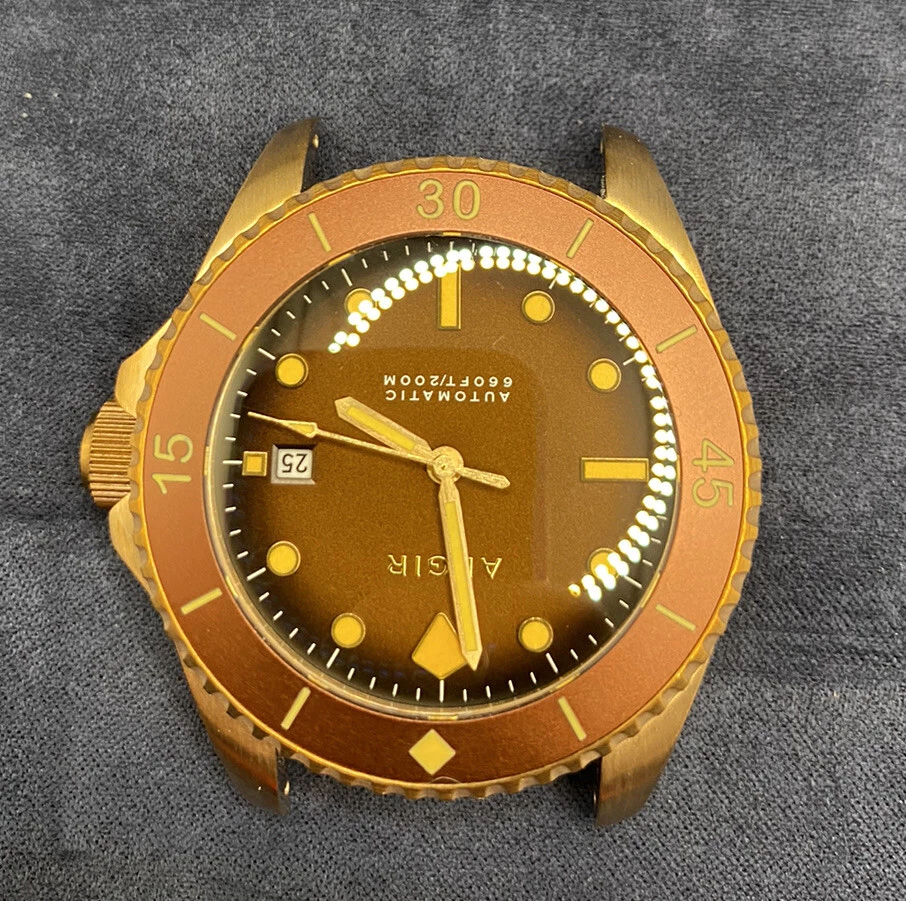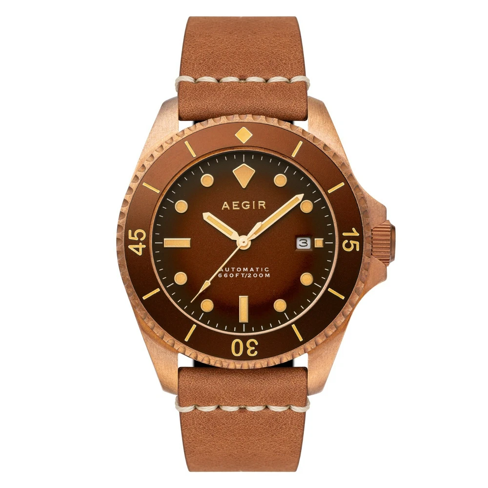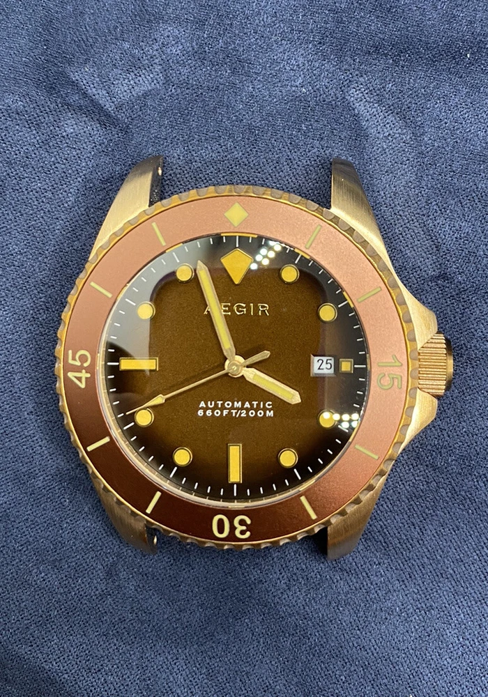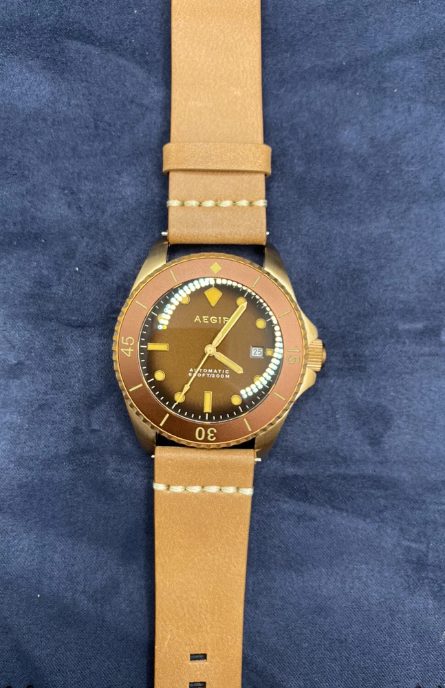 From Aegir Website about the Kriger watch: " The Kriger is a hard wearing, tough yet resolutely built timepiece. Crafted out of genuine bronze, the watch is destined to change colour, with an organic patina that will characterize the watch over years and over the elements." This is watch 044/200 for this collection. This limited edition watch is brand new with the plastic still on, tags still on, in case, with the instruction manual, the 2 year warranty card, the certificate of authenticity, polishing cloth, and outer box. This watch has an anti-reflective sapphire crystal with a Japanese Miyota 8215 Automatic Movement. Watch has never been worn. The watch comes brand new with the strap not attached to the watch. Please let me know after you purchase this watch if you would like me to attach the band before shipping. MSRP - $800 Thanks for looking! Take a look at other watches I am selling on my page and let me know if you have any questions, thanks!