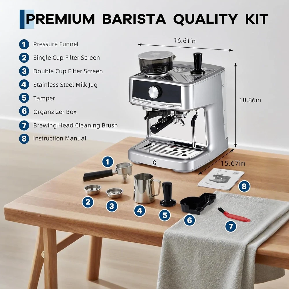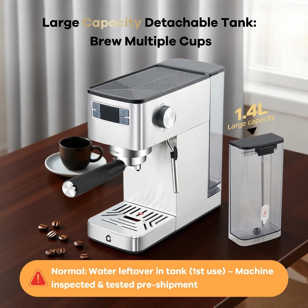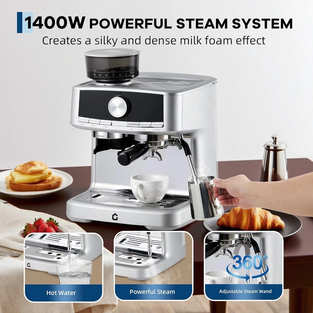 Product description 20-BAR Pressure & 1350W Motor – Italian pump delivers stable pressure to extract bold flavors from fresh grounds via the built-in grinder, creating espresso with rich crema. Adjustable settings let you customize shot strength/volume. The steam wand easily froths milk for lattes, cappuccinos, or flat whites—perfect for home/office use. 30-Setting Precision Grinder – Customize coarseness for optimal extraction with 30 adjustable grind settings. The built-in bean hopper lets you grind directly into the portafilter, saving time and ensuring fresh, consistent grounds for every brew—no pre-measuring needed. Ideal for home baristas seeking versatility and convenience. Detachable Design for Effortless Upkeep – The professional espresso maker features a removable water tank and drip tray, allowing quick cleaning and hassle-free refilling. ETL-certified for safety, it ensures reliable performance whether you’re brewing at home or the office. The user-friendly design minimizes maintenance time, so you can focus on enjoying your perfect cup—no tools required for disassembly. Customizable Grinding & Shot Volume – Effortlessly tailor your brew with adjustable grind time and single/double shot volume settings, ensuring a perfectly personalized espresso experience. Whether you prefer a strong single shot or a bold double, easily adapt the machine to match your taste—from rich, full-bodied espresso to smooth lattes. Ideal for home baristas who long for control over every detail of their coffee ritual. 1-Year Warranty & Lifetime Support – All espresso machines (purchased via authorized channels) come with a 1-year limited warranty and free lifetime tech support. Simply contact us for hassle-free support. Built **durably** and backed by a commitment to quality. 1 GRIND SETTING 2 PRE-INFUSION 3 WATER TANK 4 DIY QUANTIFICATION