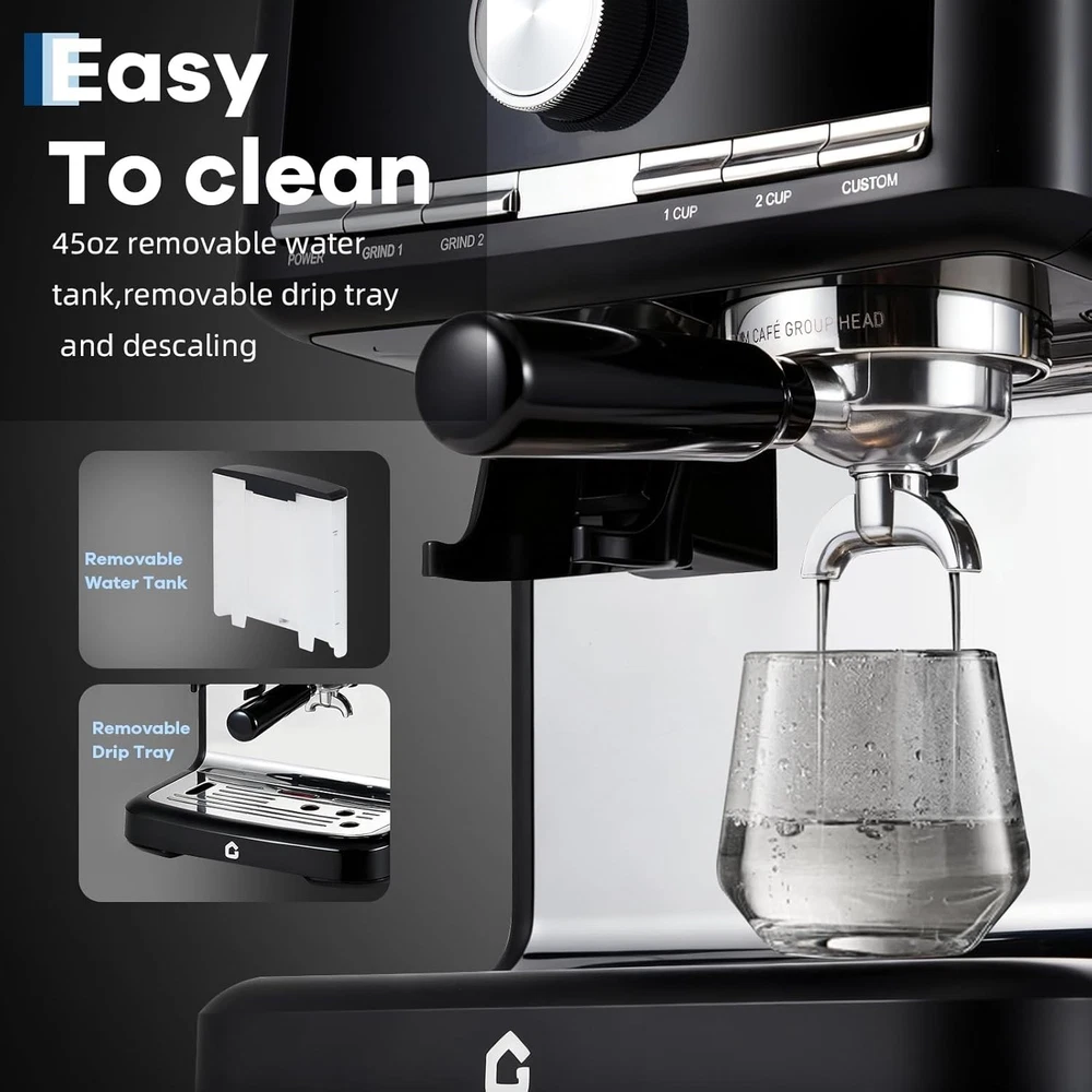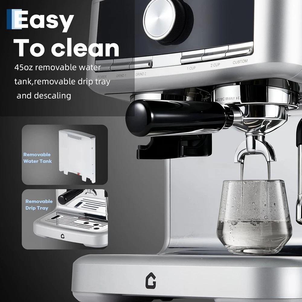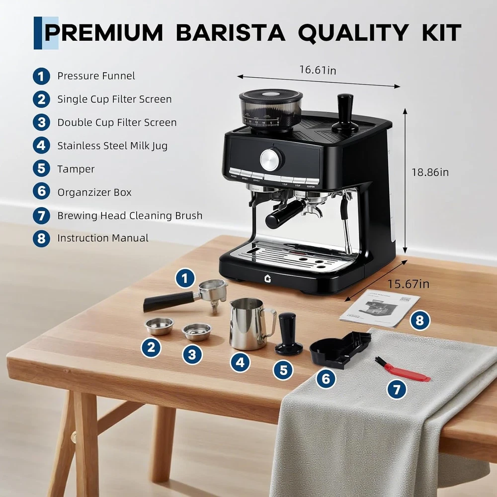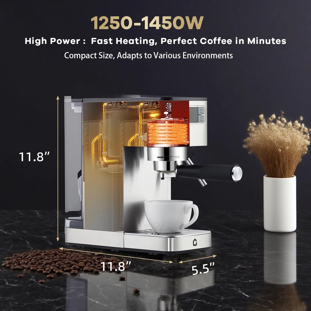 Product description 20-BAR Pressure & 1350W Motor – Italian pump delivers stable pressure to extract bold flavors from fresh grounds via the built-in grinder, creating espresso with rich crema. Adjustable settings let you customize shot strength/volume. The steam wand easily froths milk for lattes, cappuccinos, or flat whites—perfect for home/office use. 30-Setting Precision Grinder – Customize coarseness for optimal extraction with 30 adjustable grind settings. The built-in bean hopper lets you grind directly into the portafilter, saving time and ensuring fresh, consistent grounds for every brew—no pre-measuring needed. Ideal for home baristas seeking versatility and convenience. Detachable Design for Effortless Upkeep – The professional espresso maker features a removable water tank and drip tray, allowing quick cleaning and hassle-free refilling. ETL-certified for safety, it ensures reliable performance whether you’re brewing at home or the office. The user-friendly design minimizes maintenance time, so you can focus on enjoying your perfect cup—no tools required for disassembly. Customizable Grinding & Shot Volume – Effortlessly tailor your brew with adjustable grind time and single/double shot volume settings, ensuring a perfectly personalized espresso experience. Whether you prefer a strong single shot or a bold double, easily adapt the machine to match your taste—from rich, full-bodied espresso to smooth lattes. Ideal for home baristas who long for control over every detail of their coffee ritual. 1-Year Warranty & Lifetime Support – All espresso machines (purchased via authorized channels) come with a 1-year limited warranty and free lifetime tech support. Simply contact us for hassle-free support. Built **durably** and backed by a commitment to quality. 1 GRIND SETTING 2 PRE-INFUSION 3 WATER TANK 4 DIY QUANTIFICATION