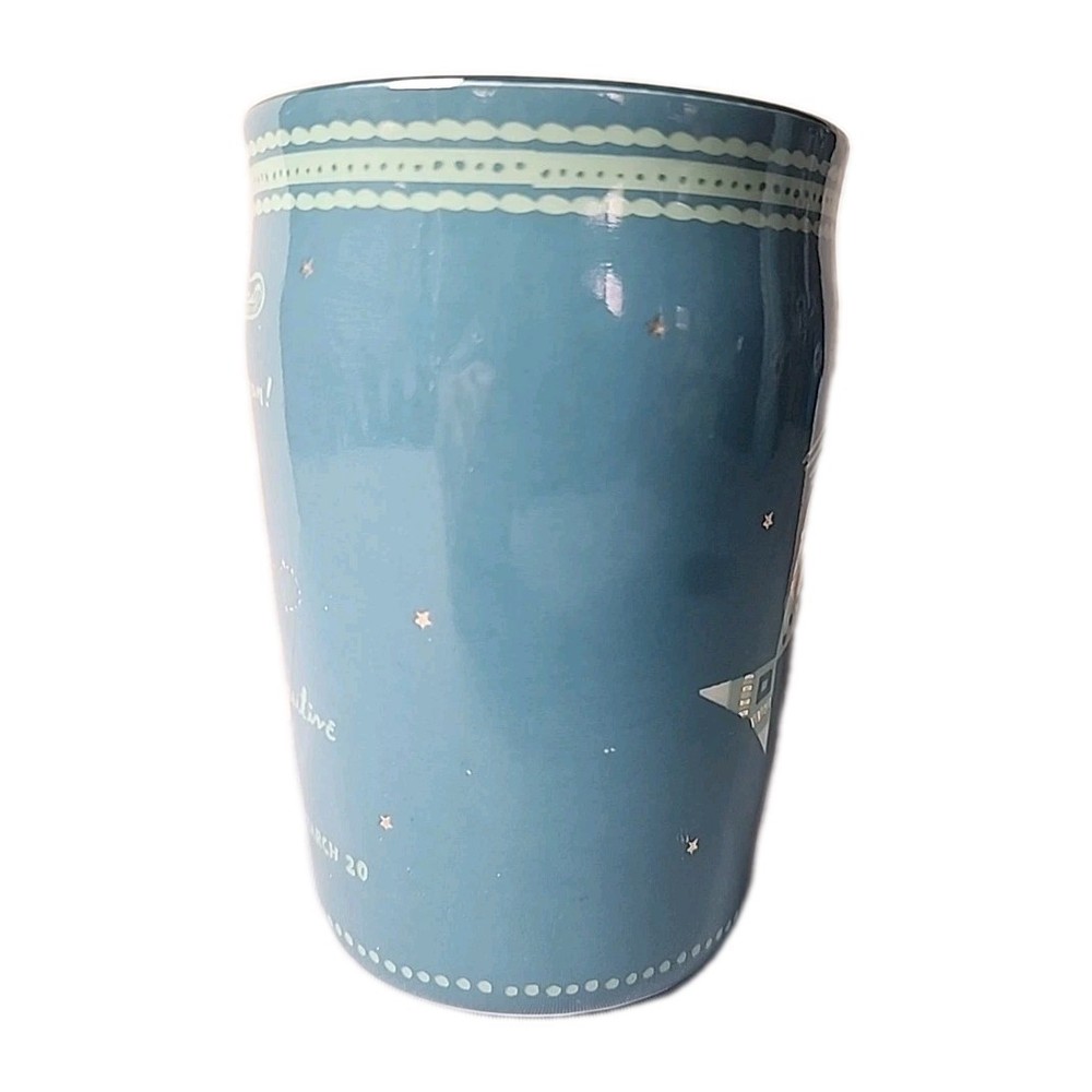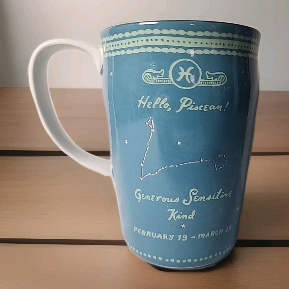 The Danielle Kroll Anthropologie Pisces coffee mug is a stylish and contemporary piece that features a zodiac pattern with a fish theme. Made of ceramic, this 16oz mug in teal blue color is decorated with celestial and horoscope designs, making it perfect for all occasions. The rounded shape and decorated features add a touch of elegance to your kitchen or dining area while being suitable for hot beverages. This unique mug is sure to be a standout piece in your collection, representing the Pisces zodiac sign with its fish motif.