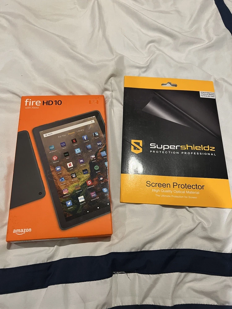 This Amazon Fire HD 10 tablet is the perfect device for all your entertainment needs. With an octa-core processor and 3GB of RAM, it can handle all your apps and games with ease. The 10.1-inch screen has a maximum resolution of 1920 x 1200, providing crystal-clear visuals. The tablet comes with 32GB of storage and supports Wi-Fi and Bluetooth connectivity. It also has built-in front and rear cameras, an accelerometer, ambient light sensor, and built-in microphone. The tablet runs on Fire OS and has a battery run time of 7 hours. Brand new in box. Box is a bit damaged on the side but it’s never been opened :)) comes with 3 screen protectors as well!
