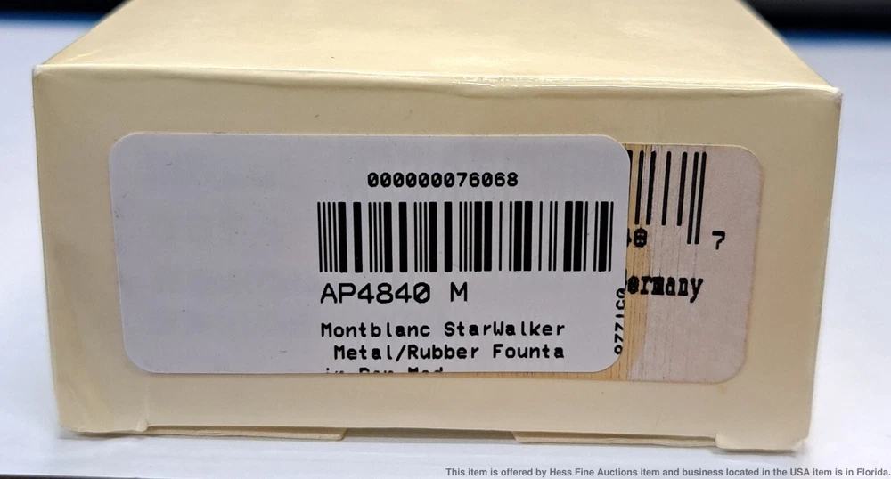 Brand New Never Used 14k Gold Nib Montblanc Starwalker Pen W/ Box Brand New Never Used 14k Gold Nib Montblanc Starwalker Pen W/ Box Click images to enlarge Description Described & Photographed by: Mike NED 61216 Title: Brand New Never Used 14k Gold Nib Montblanc Starwalker Pen W/ Box Description: A beautiful pen ready to use! Comes with original box. Happy bidding! Pen Box & Papers Yes or No: Box: Yes Color of Pen: Black and Silver Manufacturer of Pen: Montblanc Pen Length: 5.5 inches Overall Condition of Pen: Brand new Condition of Nib: Brand new (Nib is 14k White Gold) Condition of Clip: Brand new Method Cap is attached (screw or slip): Screw Estimated size of package: 12x10x3,1lb Additional Info: If the winning bidder would like to arrange to pick up their item at our store then please notify us by email & we will make the appropriate shipping adjustments. Condition: Used Condition Notes: Described & Photographed by: Mike NED 61216 Title: Brand New Never Used 14k Gold Nib Montblanc Starwalker Pen W/ Box Description: A beautiful pen ready to use! Comes with original box. Happy bidding! Pen Box & Papers Yes or No: Box: Yes Color of Pen: Black and Silver Manufacturer of Pen: Montblanc Pen Length: 5.5 inches Overall Condition of Pen: Brand new Condition of Nib: Brand new (Nib is 14k White Gold) Condition of Clip: Brand new Method Cap is attached (screw or slip): Screw Estimated size of package: 12x10x3,1lb Additional Info: If the winning bidder would like to arrange to pick up their item at our store then please notify us by email & we will make the appropriate shipping adjustments. Payment Paypal Shipping Shipping Options: Domestic shipping: Weight based Shipping Charges. Domestic Carriers are: Usps Ground Advantage I will ship to: United States Weight: 1 lbs. Shipping and Handling: Please check eBay's Shipping & Payment tab Customer Service Policy: Please note in bidding or buying this auction you are entering into a binding contract. In bidding or buying you are agreeing to all policies stated below and comply with Florida State laws. Sales Tax applies to all Florida sales unless you have a valid dealers license. Legal Shipping High value items require restricted delivery with only the addressee being able to sign for it. * Shipping is calculated by eBay and shown in the auction. Legal Jurisdiction. HessFineAuctions is a division of Hess Fine Art, and is registered in Pinellas County, FL, USA. It is agreed that all parties will abide by the laws of the State of Florida in all matters relating to this agreement. And that in the case of any dispute, the legal jurisdiction of resolution shall be Pinellas County, Florida. The buyer acknowledges that any items not returned within 30 days of receipt of the refund will be deemed appropriated by the buyer and buyer also acknowledges their intent to deprive from seller, either temporarily or permanently, the right to the property or the benefit from the property. Resale certificates must match buyer name or company and address * The auctions contain only what is described. Do not assume something comes with a used item if it is not stated in the auction verbiage. Many items will be marked with serial numbers or identifying numbers items may not be accepted for return if these numbers are not present. * Photographs often disclose condition far better than verbiage as many people have different ideas on what terms may mean. * If an identifying mark, inclusion or defect is visible in the images it is considered DISCLOSED to the buyer. * Gold items have been tested with a Kee gold tester M-509GM and tested as stated in the auction. * All Items are shipped insured. If an item has arrived damaged we will require images and a damage affidavit. CUSTOMS AND INTERNATIONAL BIDDER POLICIES International bidders - you are agreeing to the following when you place a bid with us: * If your total purchase including shipping exceeds $200.00 US and you pay with a credit card then your only delivery option is UPS signature delivery. This is because credit cards require both a signature and tracking. * If you pay with PayPal and the total price including shipping is less than $750.00 US then we can ship USPS to most countries. Please contact us with eBay’s message system before you pay for an amended invoice. * The following applies if you are shipping to or from these countries. CANADA, Australia, Belgium, Brazil, Croatia, Denmark, France Germany, Great Britain and Northern Ireland, Israel, Netherlands New Zealand Spain and Switzerland, Estonia, Finland, Gibraltar, Hungary, Italy, Latvia, Lithuania, Luxembourg, Malaysia, Malta, Portugal, and Singapore. We will be able to offer you USPS International shipping if you are paying with PayPal and the item and shipping are less than $750.00 US. We may be able to ship 1st Class USPS International if you are shipping to or from the countries listed above. * If you wish your item sent to a colleague with a US address we are of course willing to do so but the address must be verified with PayPal Credit card company and in the eBay invoice. * We declare all items for the winning bid amount. * It is common for countries to charge some form of customs duties, taxes, VAT, or brokerage fees on items being shipped from the USA. These costs, along with country-specific importing rules and delays caused by customs, are the buyer’s responsibility. * We do not falsify customs documents to assist you in evading your lawful taxes. Hess Fine Auctions Hess Fine Auctions can be reached during working hours of 9 to 5 PM EST. Legal Shipping Vendio Images: More than just a pretty image. 250+ Mobile Responsive & Active Content Free Listing Templates with Vendio Sales Manager. Vendio provides powerful selling automation for sellers of all sizes. Get business information that counts! - Vendio Counters are active content free.