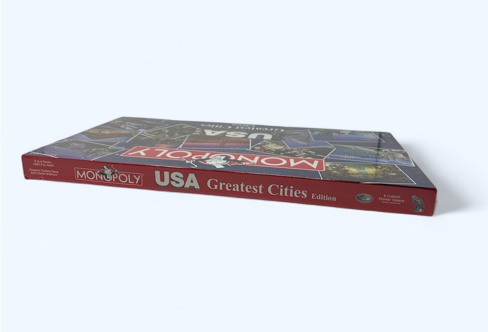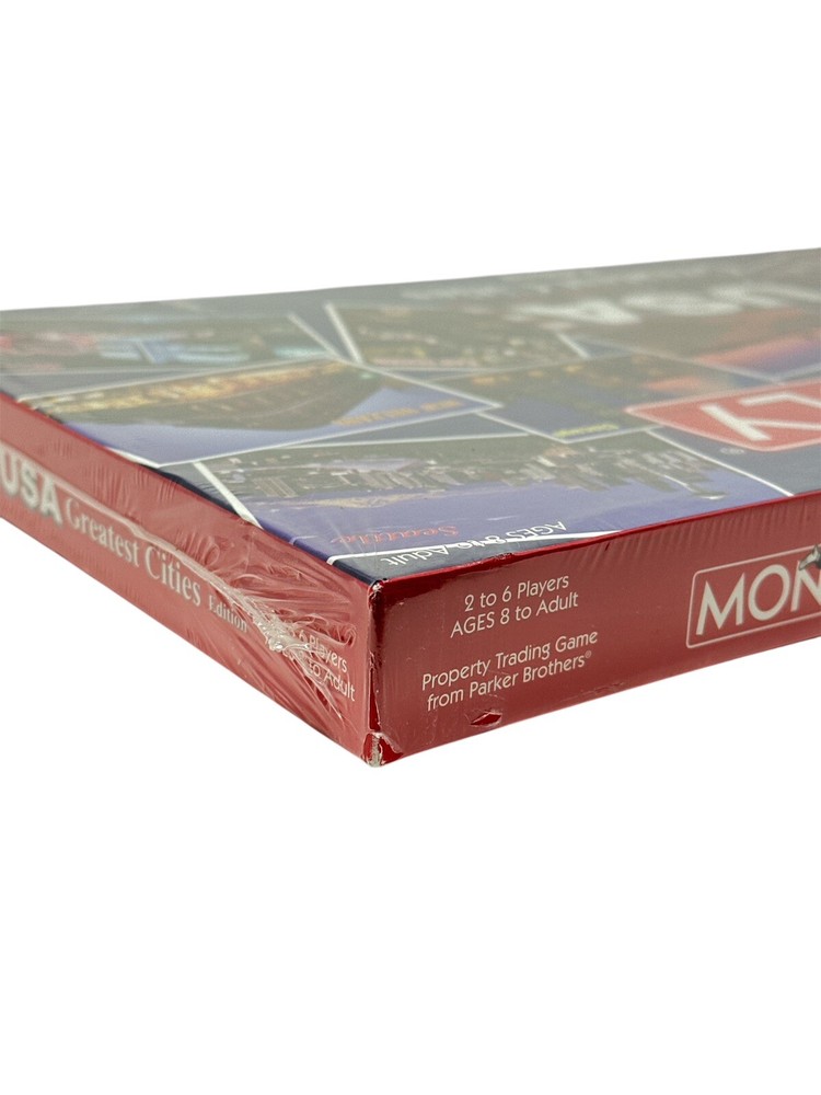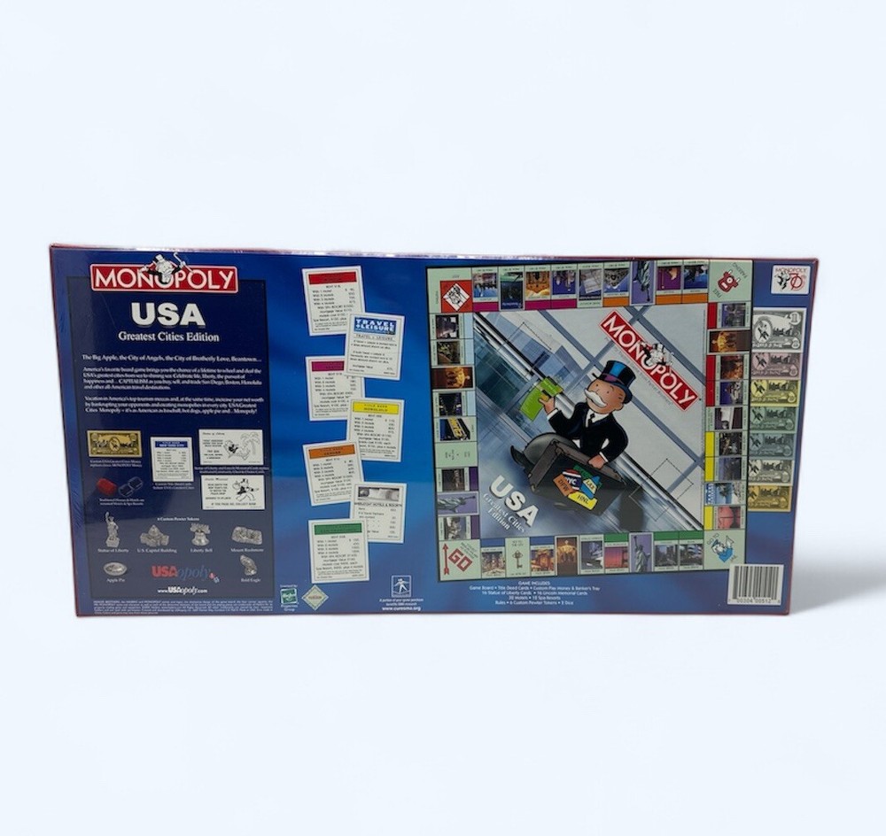 The product is a brand new and sealed Monopoly board game, specifically the USA Greatest Cities Edition released by Hasbro in 2005. It is a classic board game designed for 2 or more players, with a theme centered around finance. This version of Monopoly features various cities from the United States as the properties to be bought and traded. This game is part of the Toys & Hobbies category and is a contemporary manufacture of the popular board game. Brand New sealed. Please note minor wear on one of the corners. Images are part of the item description, please see all images for more details. Thank you