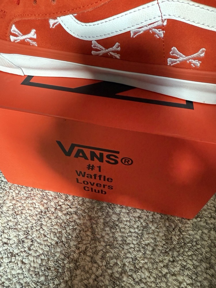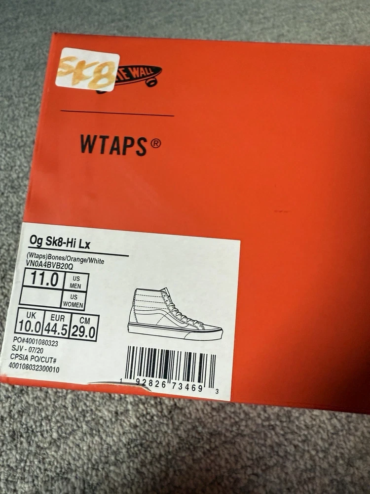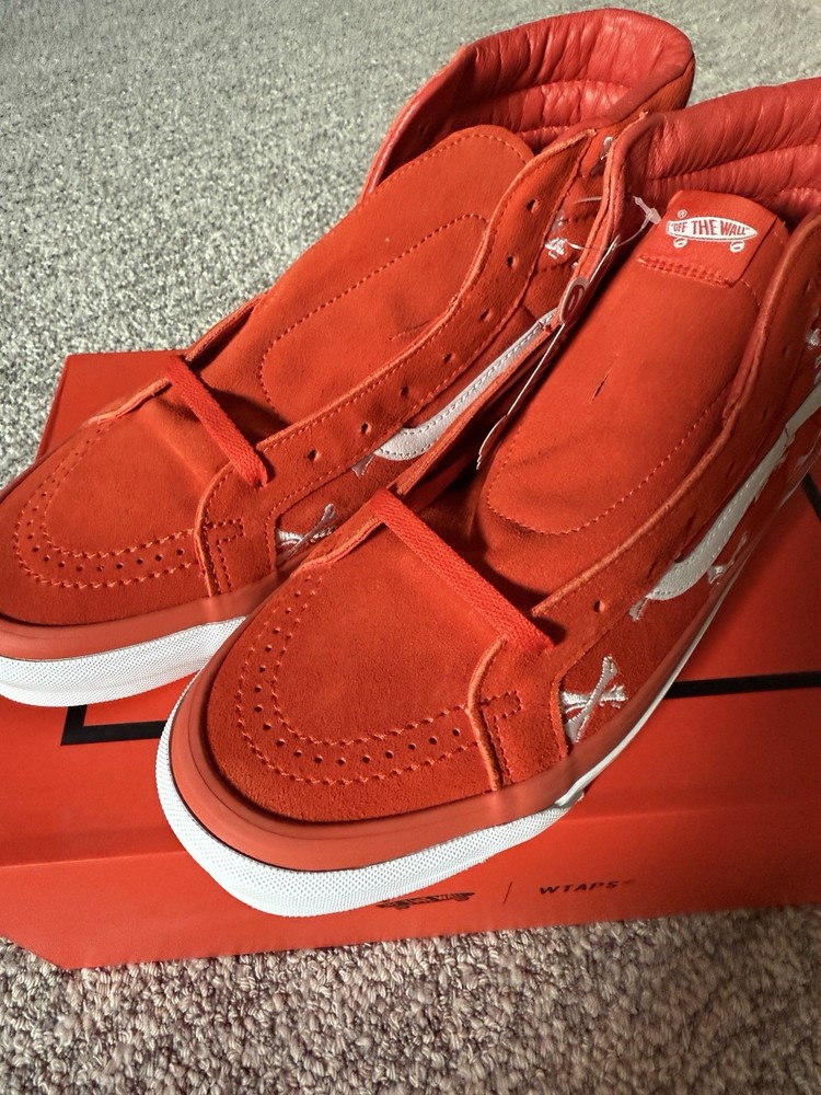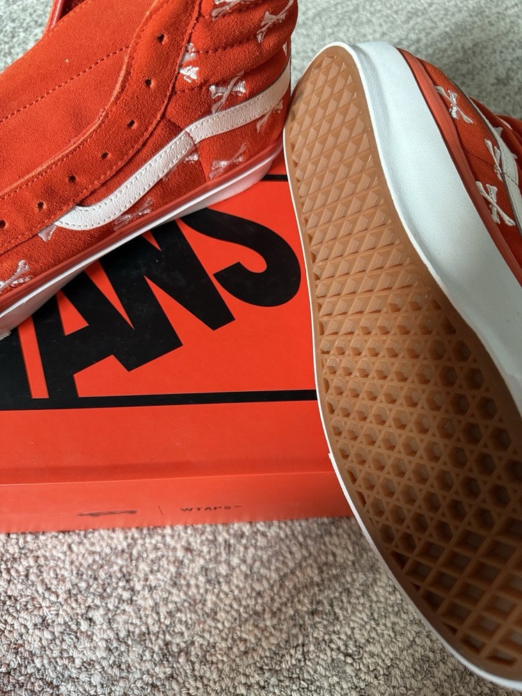 The product is a brand new pair of VANS Sk8-Hi x WTAPS sneakers in size 11. This collaboration between VANS and WTAPS offers a high top style with an orange color scheme, making it a unique and stylish addition to any athletic shoe collection. The release year is 2020, and these sneakers are sure to ship out the next day for quick delivery to any fashion-forward man looking to add a pop of color to their footwear assortment.