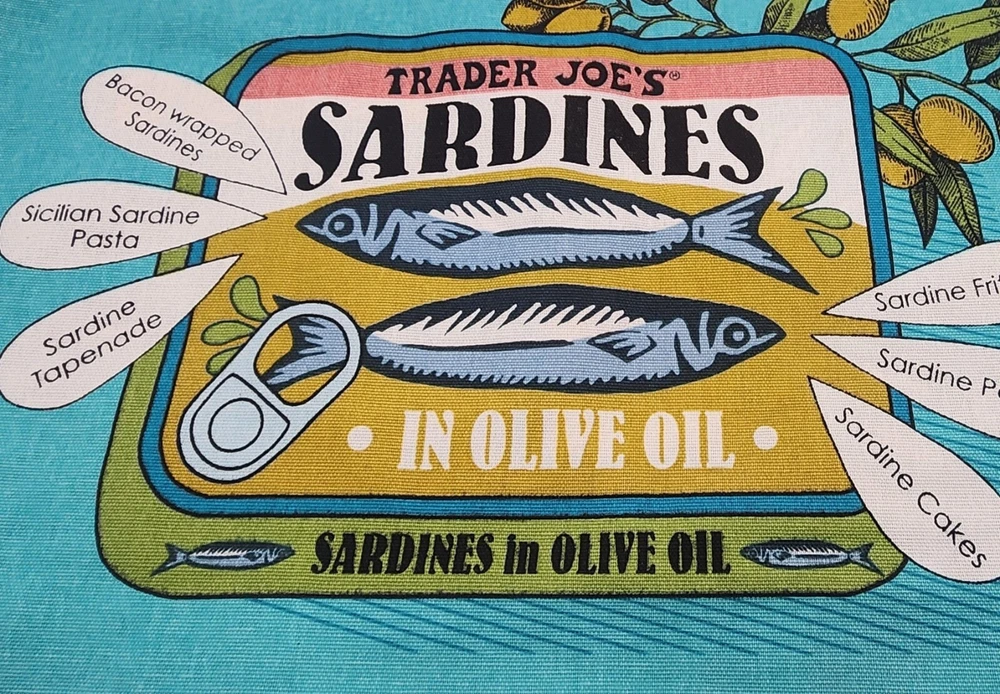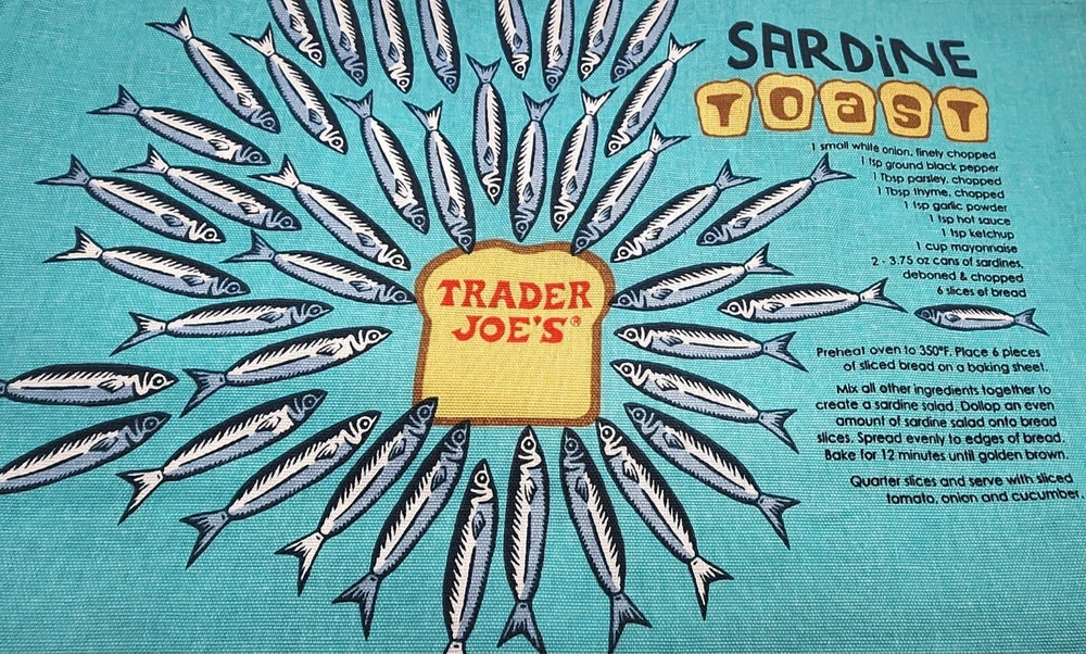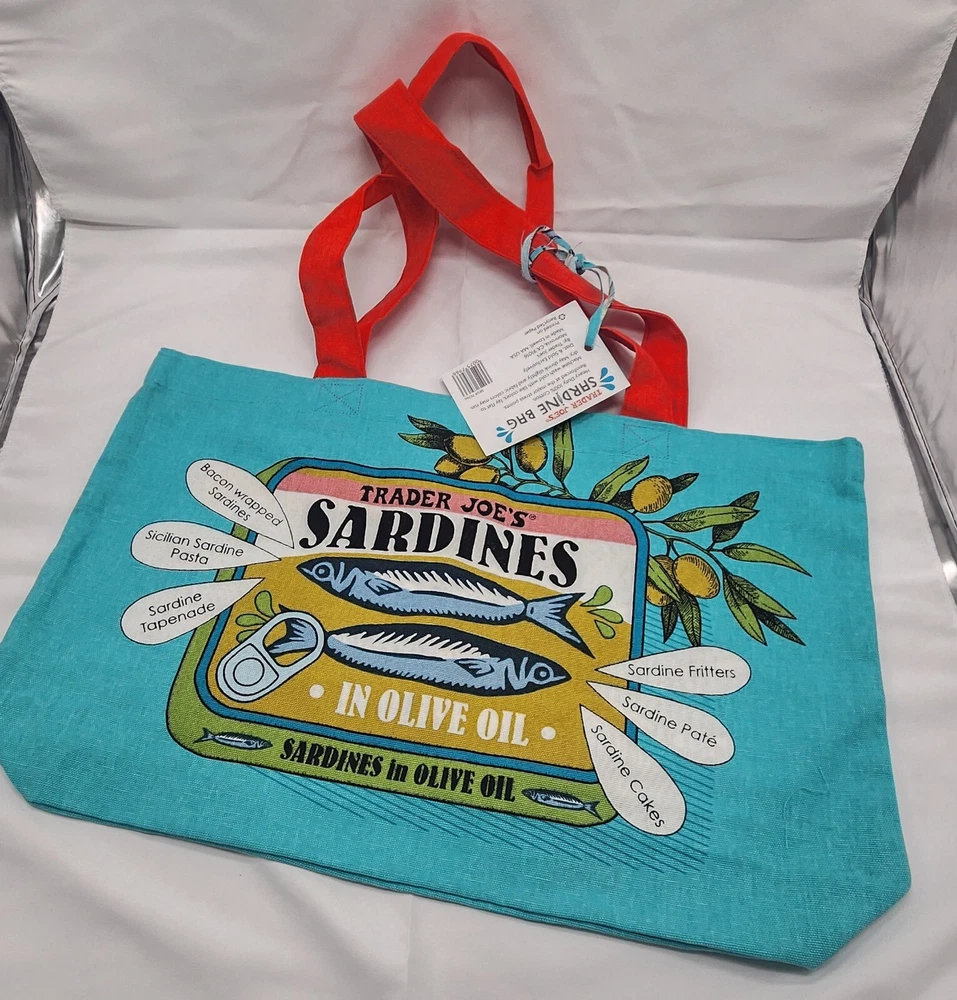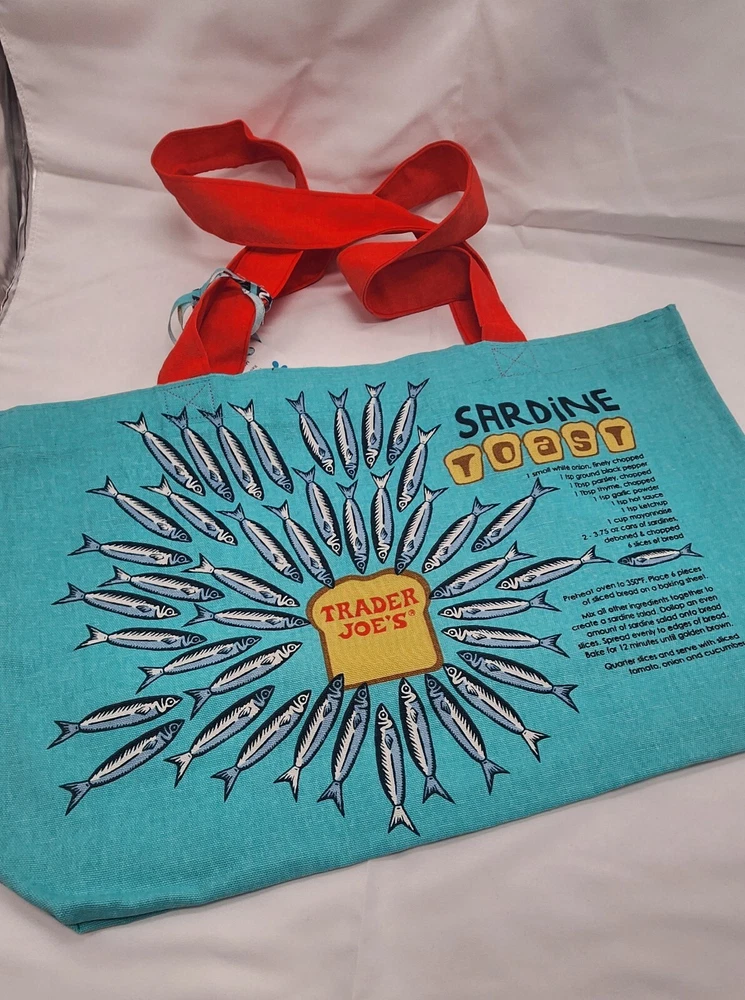 **See my other Trader Joe listings for some special bundles!** Ships same day when ordered before 6pm EST Priced to sell! Brand new, never used. With Tags. This limited edition Trader Joe's canvas tote bag is perfect for your grocery shopping needs. The spacious bag features a beautiful light blue color with a pattern of Sardines in olive oil. It is made of durable material and is 19 inches long, 11 inches high, and 4 inches wide. The bag is also foldable for easy storage when not in use. This reusable shopping bag is perfect for farmer's markets or any place you need to carry items. It is an original model from Trader Joe's and comes with free shipping. This bag is a must-have for anyone who is eco-conscious and wants to make a positive impact on the environment.