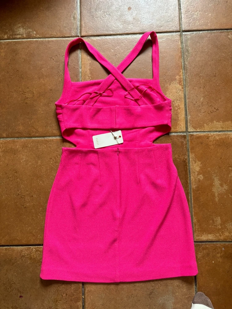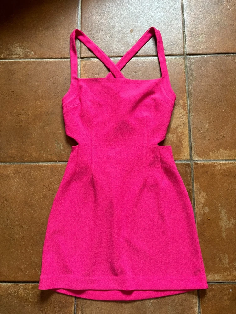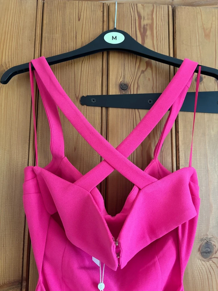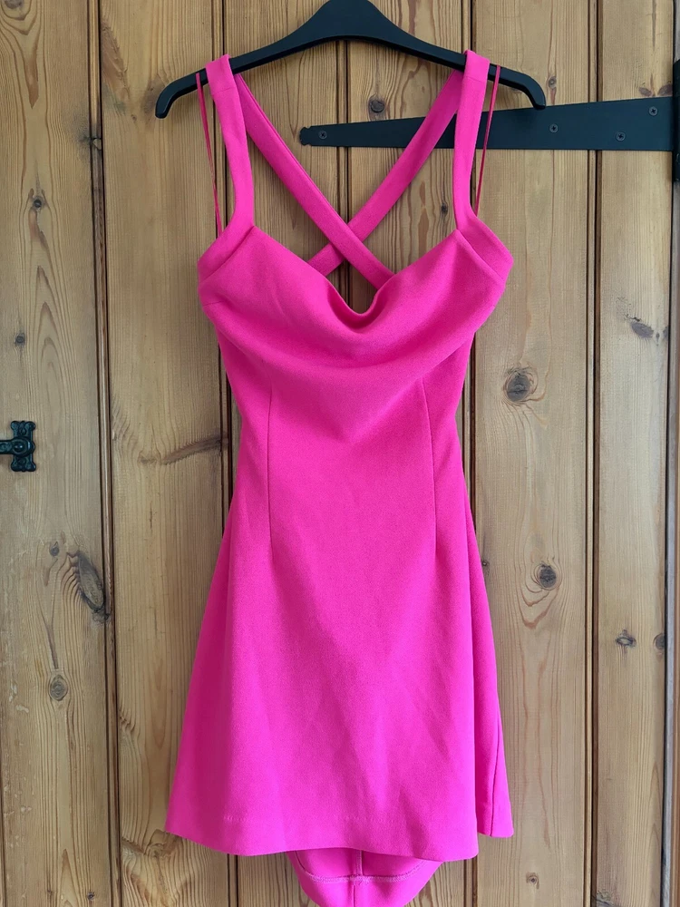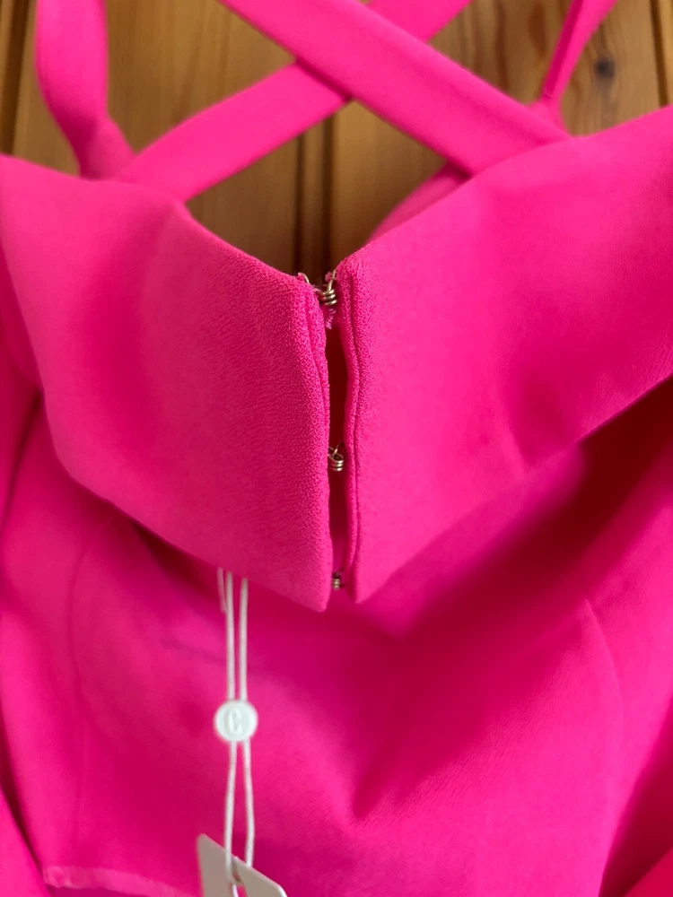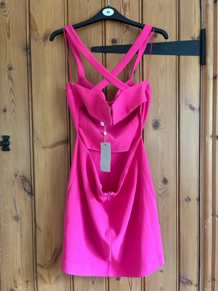 Brand new Coast bright pink cross back mini dress Size 10 Still with tag Length (from underarm to hem) - approx 23" Criss-cross straps at back Opening at back 95% polyester, 5% elastane Zip down back