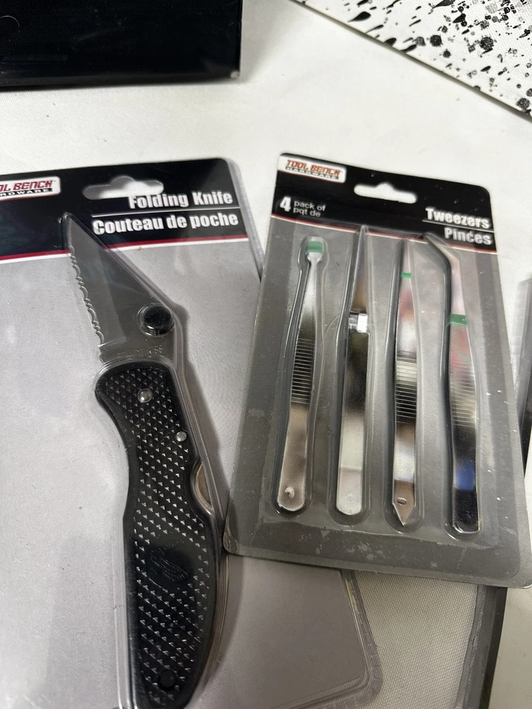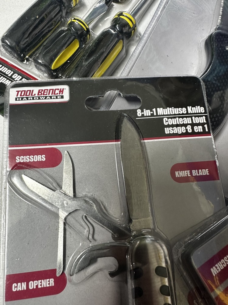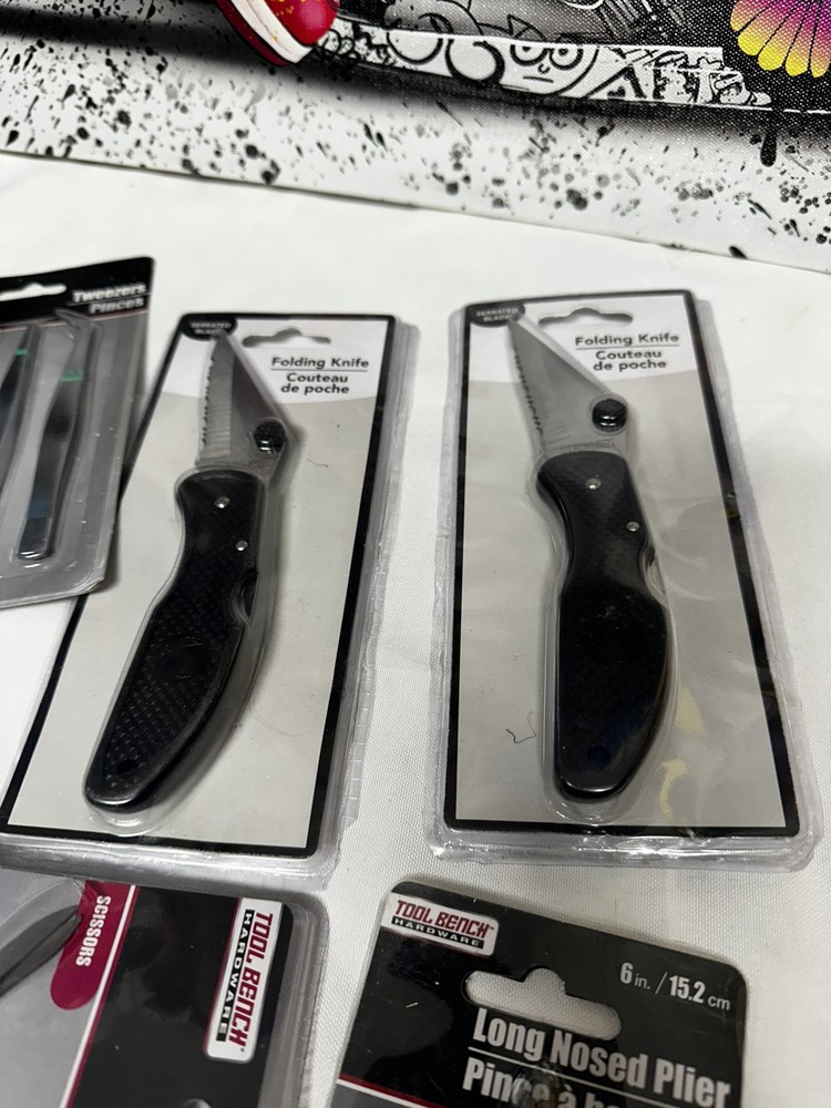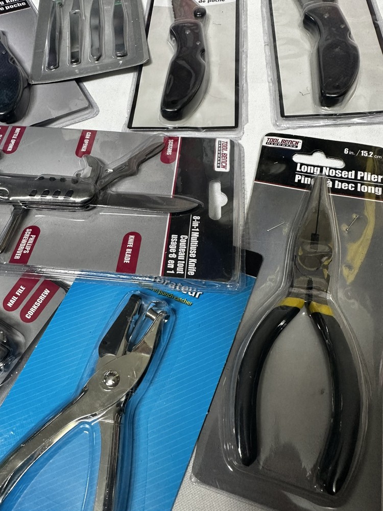 Six knives, a set of tweezers, a set of small screwdrivers, whole puncher, and pliers