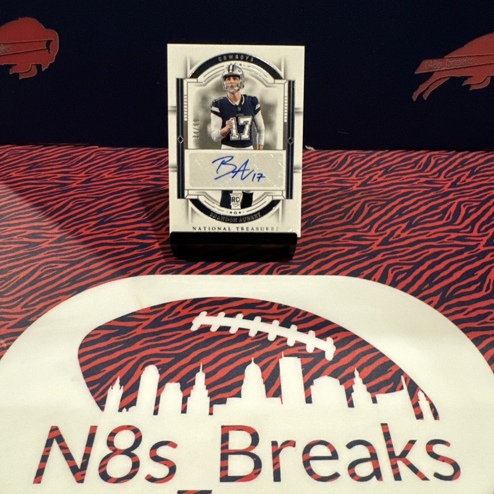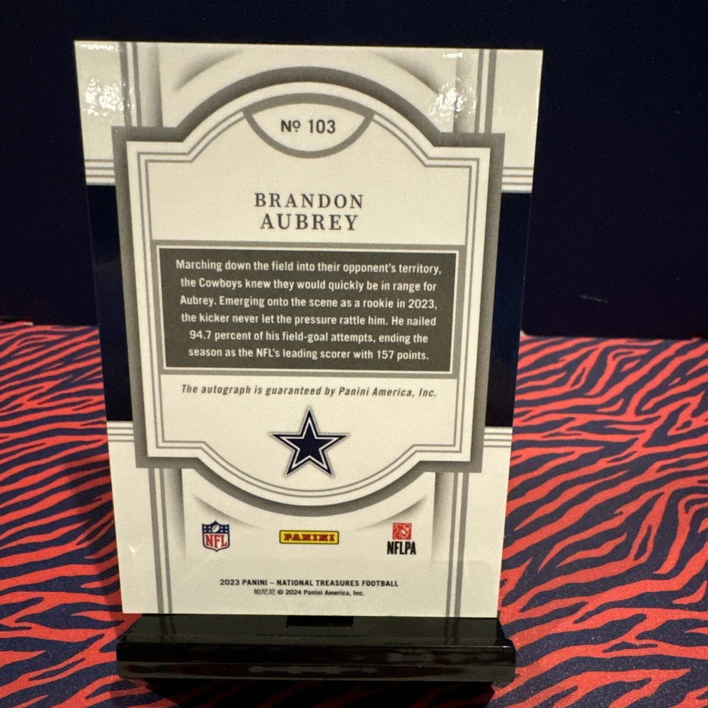 This is a rare and valuable 2023 Panini National Treasures sports trading card featuring Brandon Aubrey, a Dallas Cowboys player. The card is autographed and has a print run of only 99, making it a highly sought-after collectible. It is a rookie card and has a serial number, making it even more valuable. The card is part of the Signatures parallel/variety and is an insert, adding to its uniqueness. The card is from the 2023 season and manufactured by Panini. It is a short print, which means it is not easy to find. The card features the player's autograph and is categorized under Sports Mem, Cards & Fan Shop and Sports Trading Cards. This is a must-have for any collector or fan of the Dallas Cowboys or National Football League (NFL).