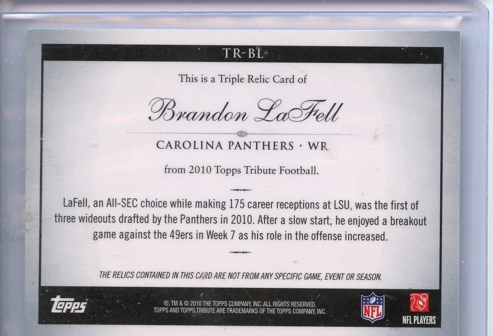 The item is a 2010 Topps Tribute Triple Relics trading card featuring Brandon LaFell, a player for the Carolina Panthers in the National Football League (NFL). This single-insert card is a Rookie edition with a serial number of 32/45, making it a limited edition collectible. It includes memorabilia from LaFell, adding to its value and appeal to collectors. The card is part of the Relic parallel/variety, showcasing a piece of LaFell's gear, and is an original Topps product from 2010. It's a sought-after piece for fans of football trading cards, especially those focusing on rookie memorabilia.