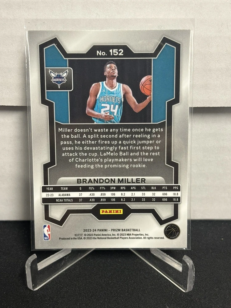 Brandon Miller 2023-24 Panini Prizm Rookie RC Base Hornets #152. Condition is Ungraded. Shipped with eBay Standard Envelope for Eligible Items up to $20.