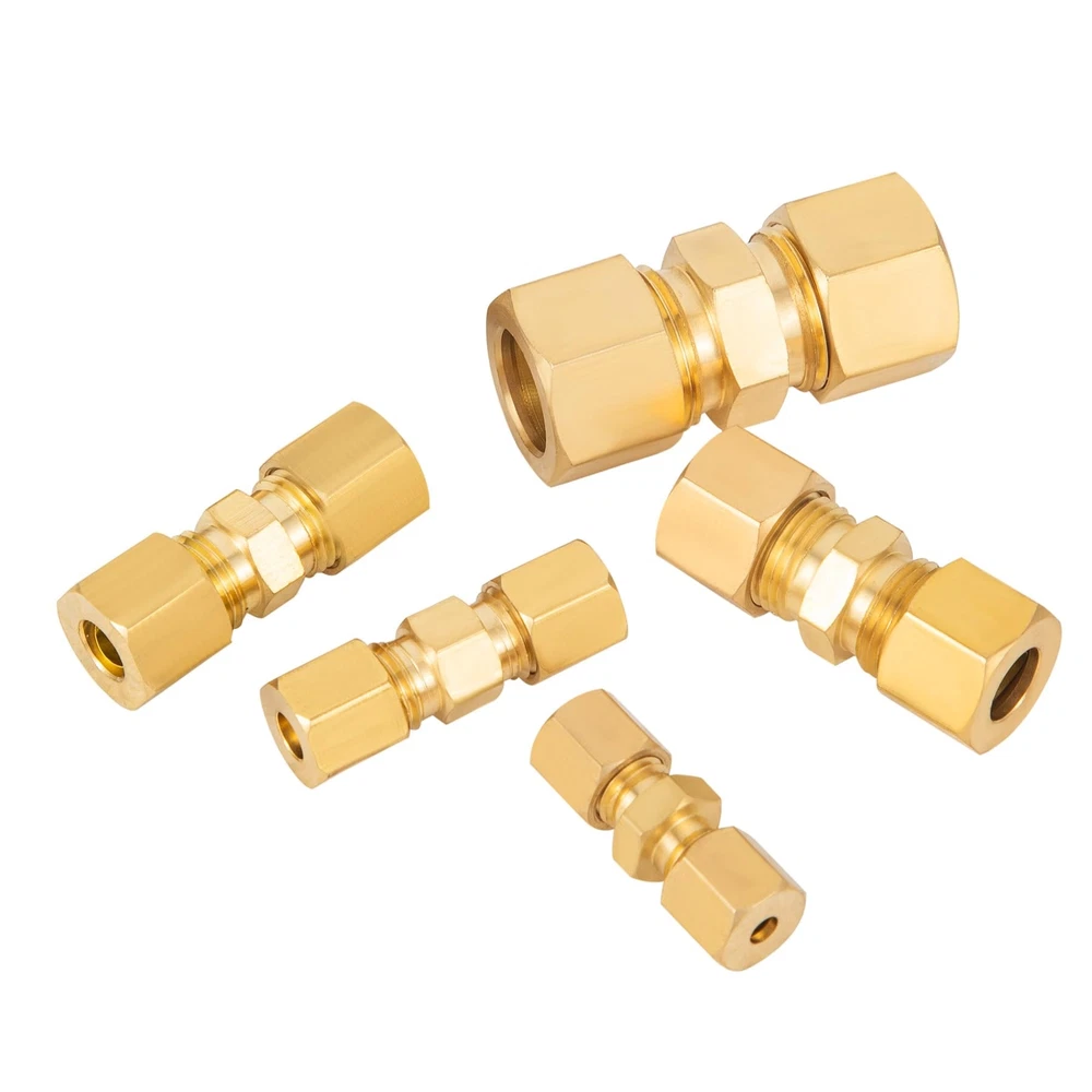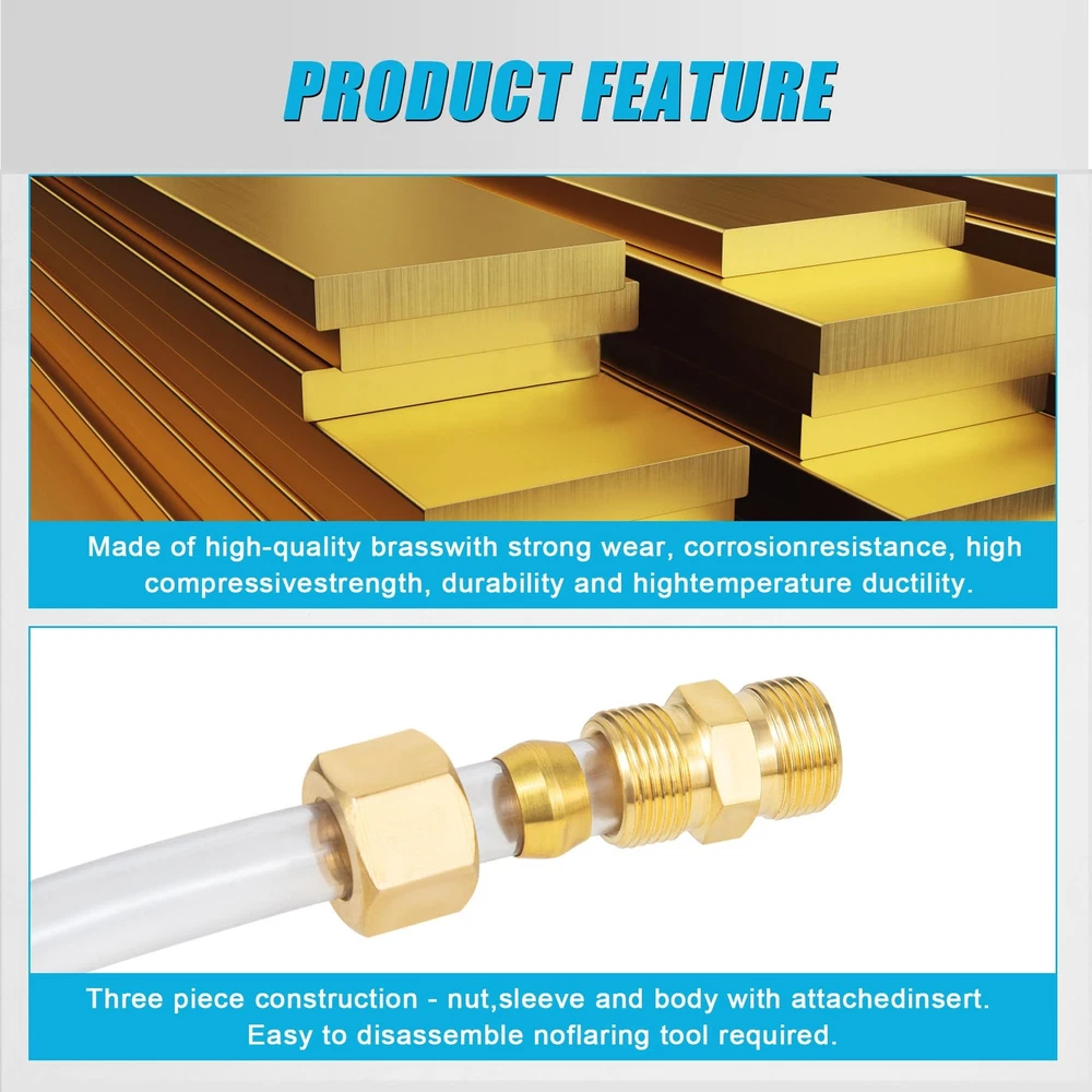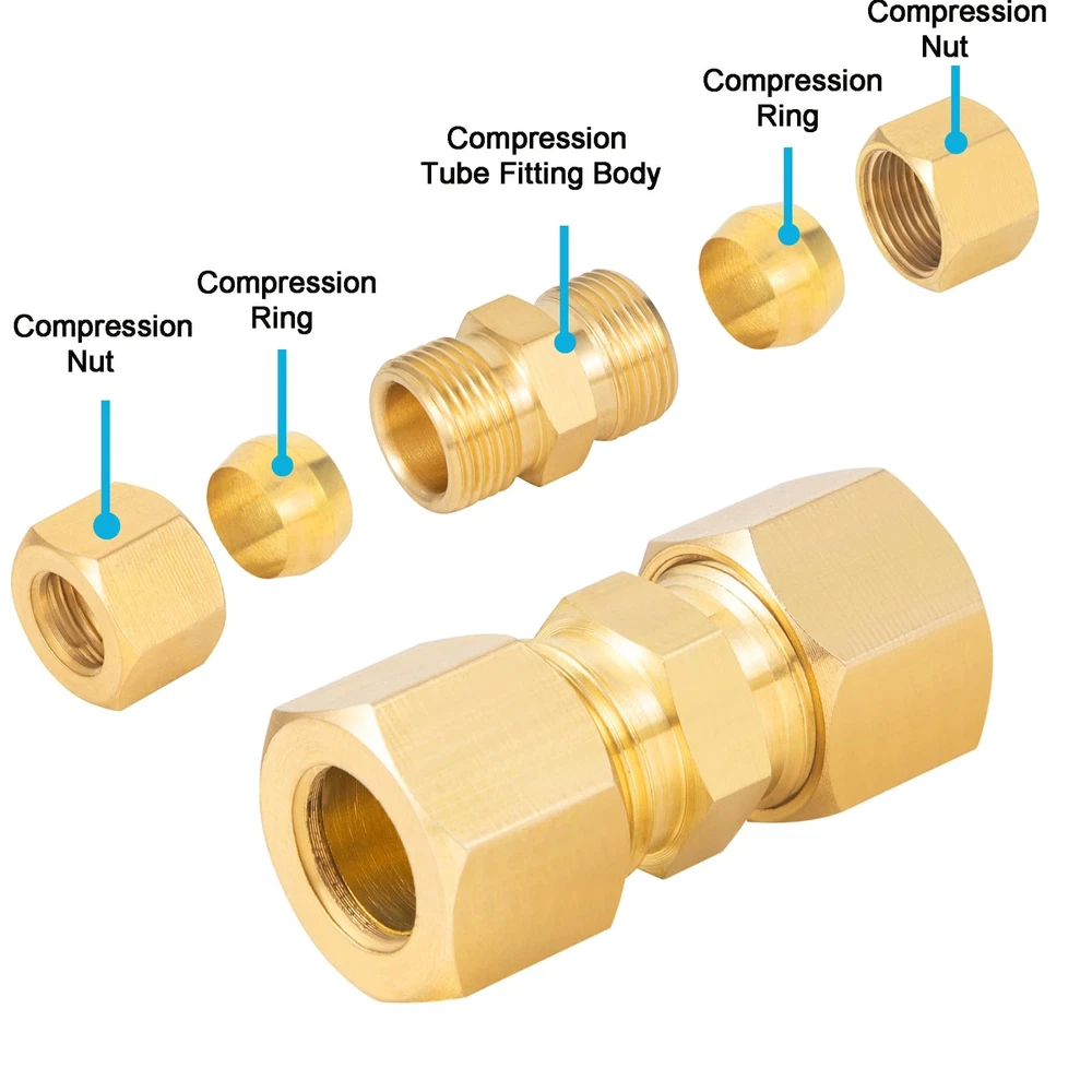 Brass Compression Fitting,1/4 3/16 1/8 5/16 3/8 1/2 -Inch OD Compression Union,Brass Compression Tube Fitting High quality brass with corrosion resistance, high temperature ductility and low magnetic permeability. Tube Size: 1/8", 3/16", 1/4", 5/16", 3/8" & 1/2" OD Kit contains 6sizes: 1/8"(2 pcs), 3/16"(10 pcs), 1/4"(4 pcs), 5/16"(2 pcs), 3/8"(2 pcs) and 1/2" (2 pcs)compression coupling,Brass Compression Sleeves Ferrules ,teflon tape,Comes with 1 year . Meets specifications and standards of ASA, ASME asn SAE.Compression unions for joining copper, plastic tubing,brass, or aluminum tubing. Each category contains a specific collection of fast-moving accessories that can be carried to increase your efficiency when using your car's hydraulic braking system.Compression Fittings do not require any flaring, soldering or other type of tubing preparation.