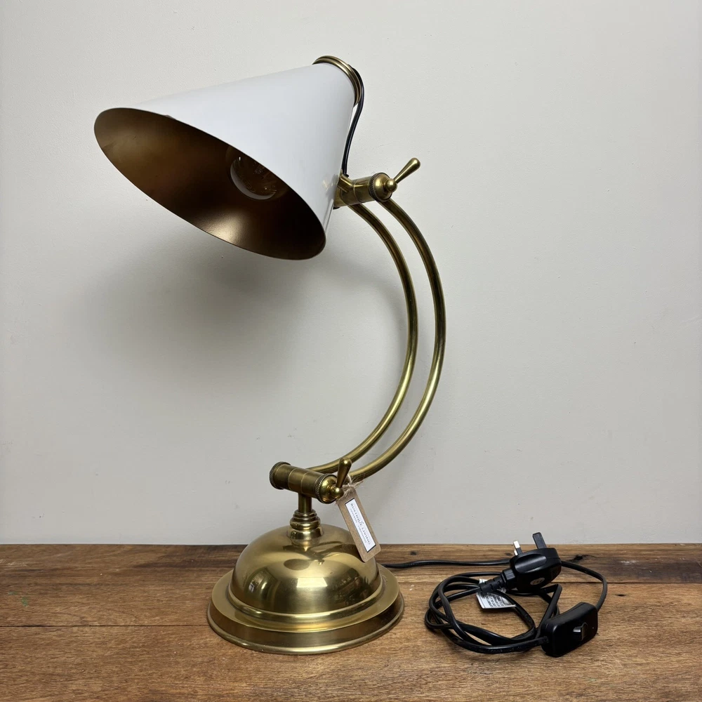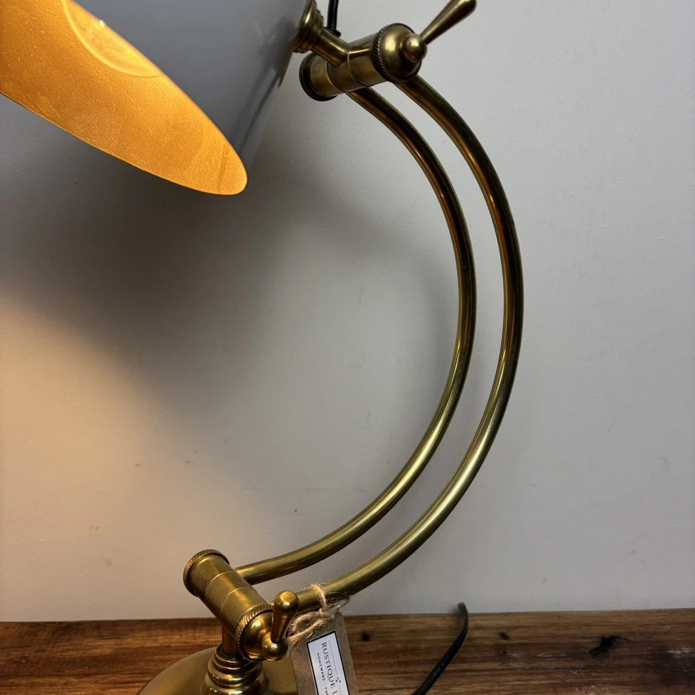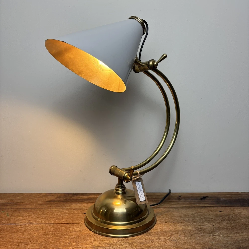 Brass Desk Lamp An incredibly aesthetic desk lamp that blends an antique brass look with a contemporary shade. The main body has a traditional and somewhat vintage look that is contasted with the more modern style shade. This contrast creates a lamp that feels homely and unique. There are two levers to adjust the lamp. One adjusts the angle of the arm and the other adjusts the angle of the shade. These are super tactile and a great feature to adjust the lamp to any space. These come complete with LED bulb and built in, in-line switch. *Please note that this lamp is ex-display. This does have a small imperfection where the paintwork on the shade is chipped. This is therefore offered at a heavily discounted rate. So if you can live with this imperfection, you’ll be grabbing a bargain!* Measurements: Height: 50cm Base Diameter: 18cm Shade Diameter: 20cm Free U.K. delivery via Royal Mail. Please enquire for more details.