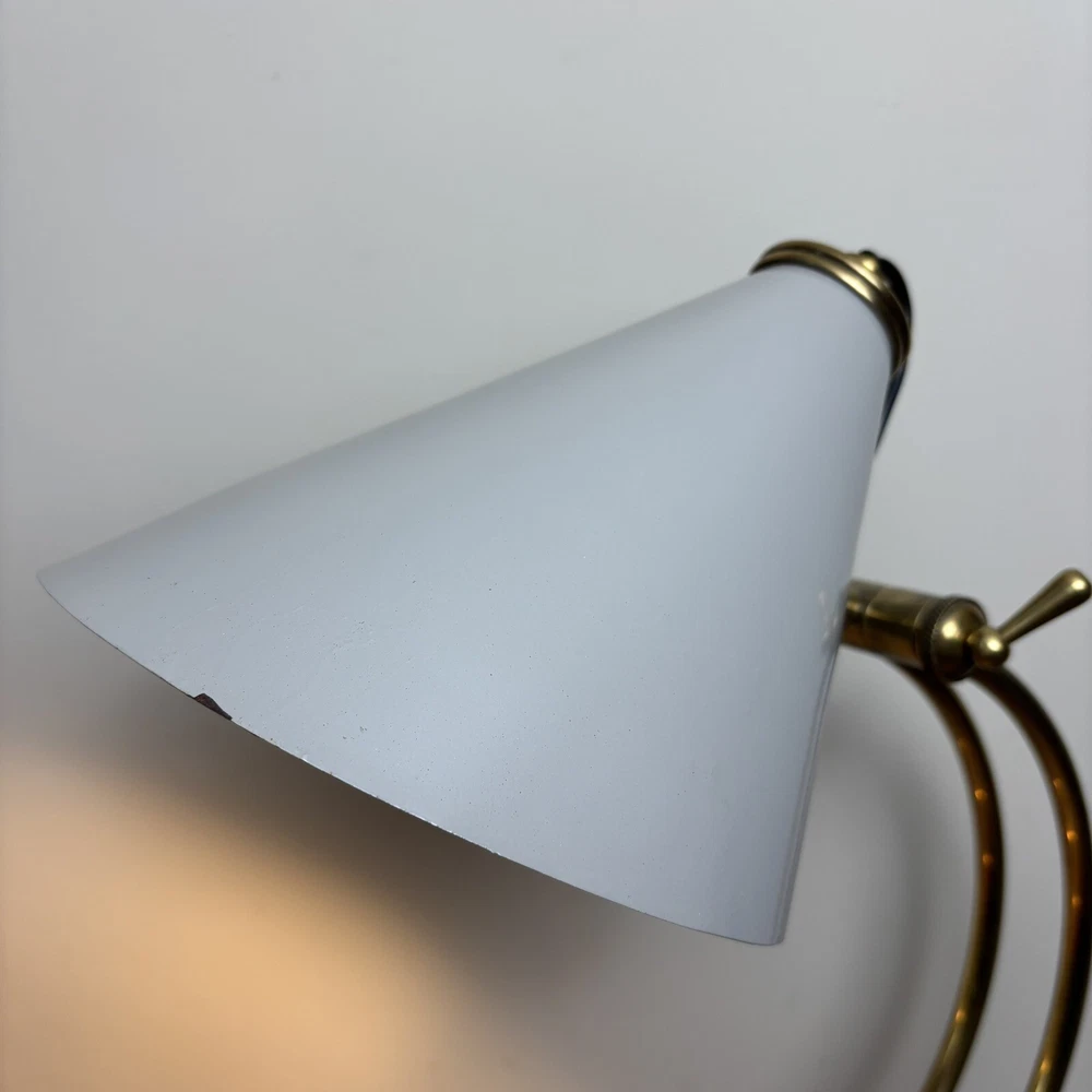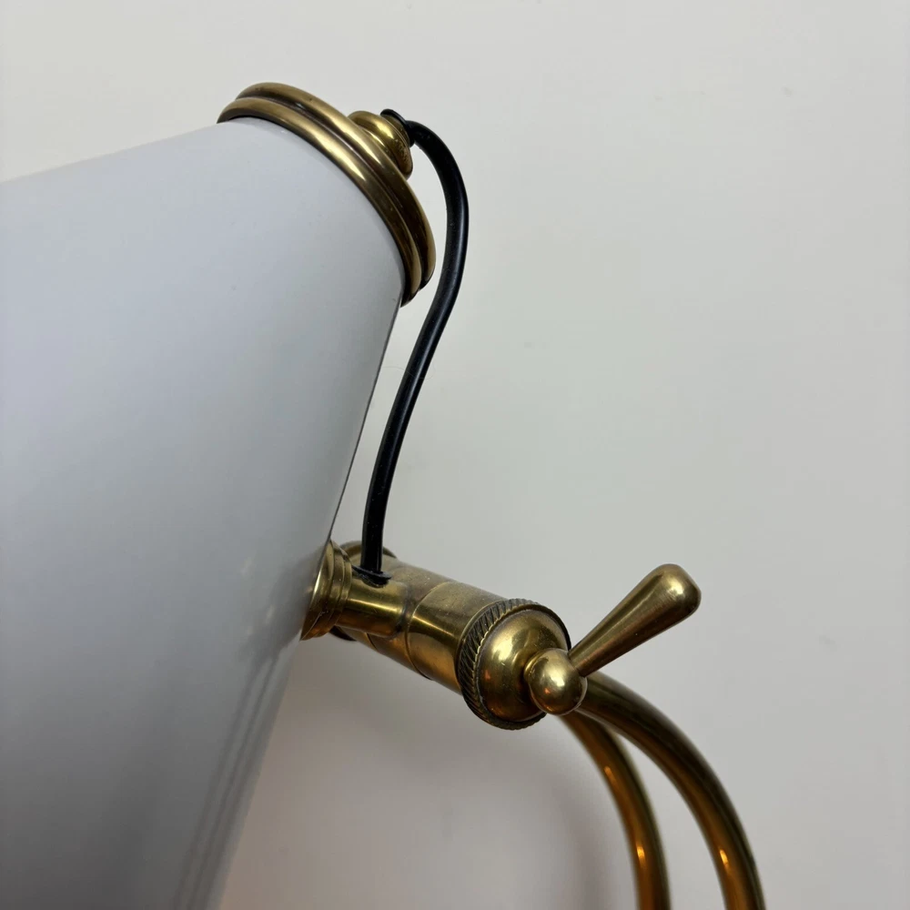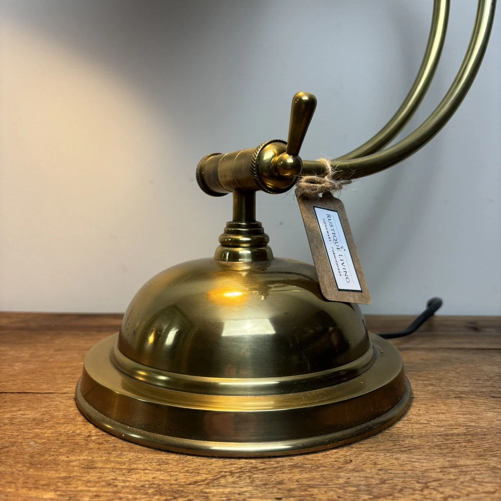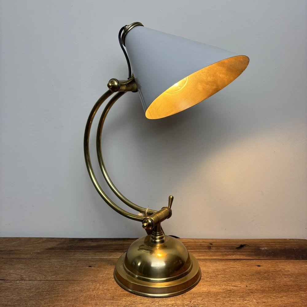 Brass Desk Lamp An incredibly aesthetic desk lamp that blends an antique brass look with a contemporary shade. The main body has a traditional and somewhat vintage look that is contasted with the more modern style shade. This contrast creates a lamp that feels homely and unique. There are two levers to adjust the lamp. One adjusts the angle of the arm and the other adjusts the angle of the shade. These are super tactile and a great feature to adjust the lamp to any space. These come complete with LED bulb and built in, in-line switch. *Please note that this lamp is ex-display. This does have a small imperfection where the paintwork on the shade is chipped. This is therefore offered at a heavily discounted rate. So if you can live with this imperfection, you’ll be grabbing a bargain!* Measurements: Height: 50cm Base Diameter: 18cm Shade Diameter: 20cm Free U.K. delivery via Royal Mail. Please enquire for more details.