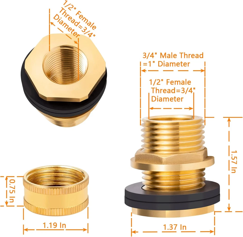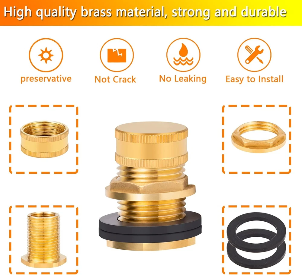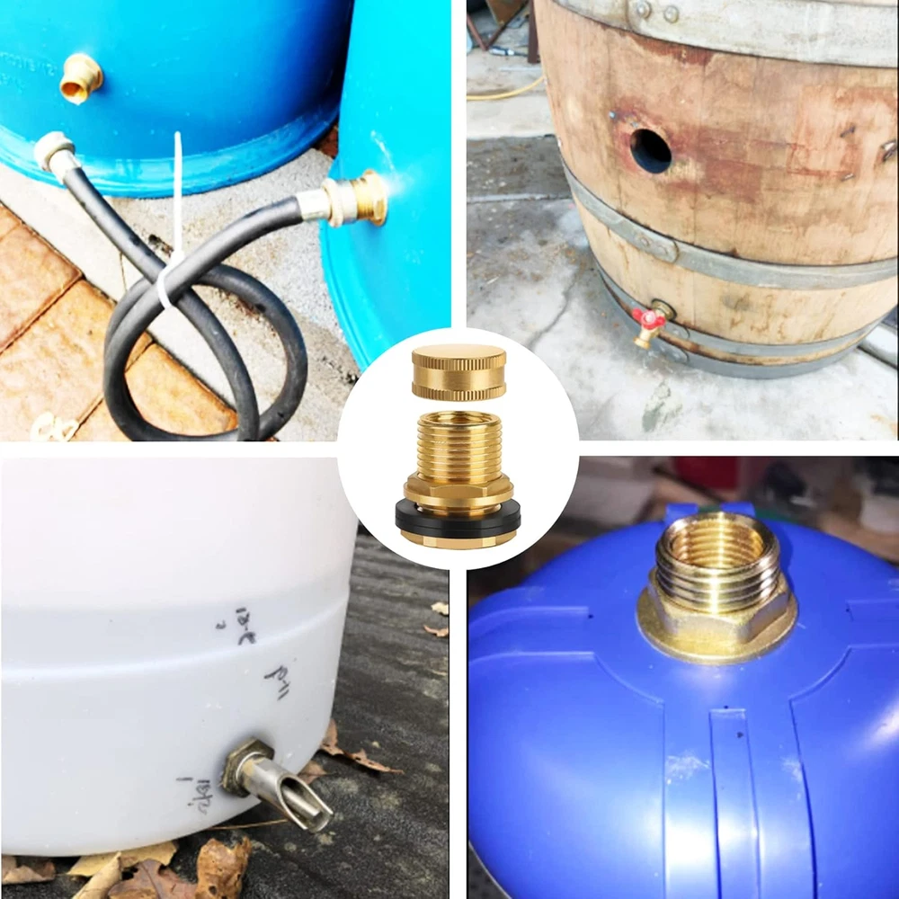 Notice:The thread size on the title is not the fitting's OD,please check the size you need before ordering. The fittings are solid brass,so are much more hard wearing than plastic systems,and are rust resistant. Male thread brass quick connector,female thread inside.Embeded gasket provides strong seal without slipping.The Bulkhead Fitting is precision engineered to be long lasting and leak free. Using thread linking to make connection more firmly Not easy to leak with 2 Rubber Ring,double sided protection. It can be used in plastic water towers,water inlet and outlet,and self-made water storage barrels,which can be used for various pipes,faucets,hoses,fittings,etc. Water Tank Connector Easy to install. Stable construction.. Solid brass construction for unsurpassed durability. Using thread linking to make connection more firmly Not easy to leak with 2 Rubber Rings,double sided protection. Embeded gasket provides strong seal without slipping. It can be used in water towers, water inlet and outlet, and self-made water storage barrels, which can be used for various pipes, faucets, hoses, fittings, etc.  Garden Hose Plug Caps Female threads for use with male threaded pipes Include rubber gasket,it could provide strong seal without slipping This fitting is made of brass for corrosion resistance,ductility at high temperatures,and low magnetic permeability It can be used for connecting, terminating, controlling flow, and changing the direction of piping in many different industries
