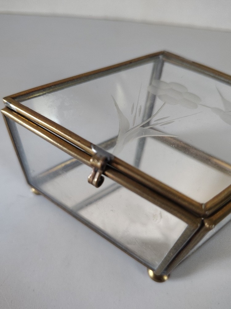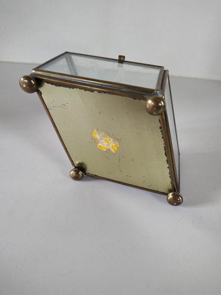 This trinket box features a unique design with a mirrored bottom showcasing an etched hummingbird and flower pattern. Made of brass and glass, the diamond-shaped box is small in size, making it perfect for all occasions. The press fastening closure ensures your trinkets are secure, while adding a touch of elegance to any room decor. Ideal for collectors or anyone looking to add a decorative piece to their home.