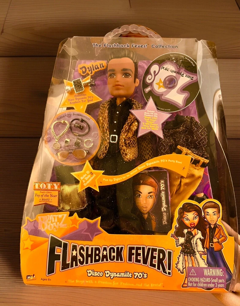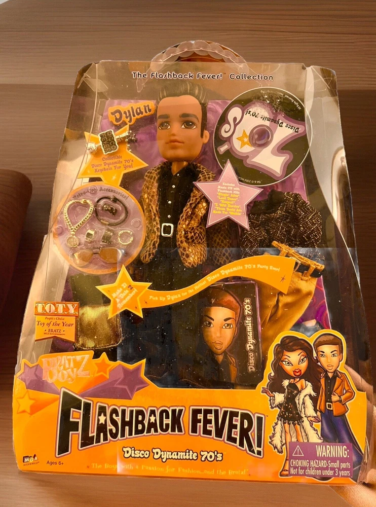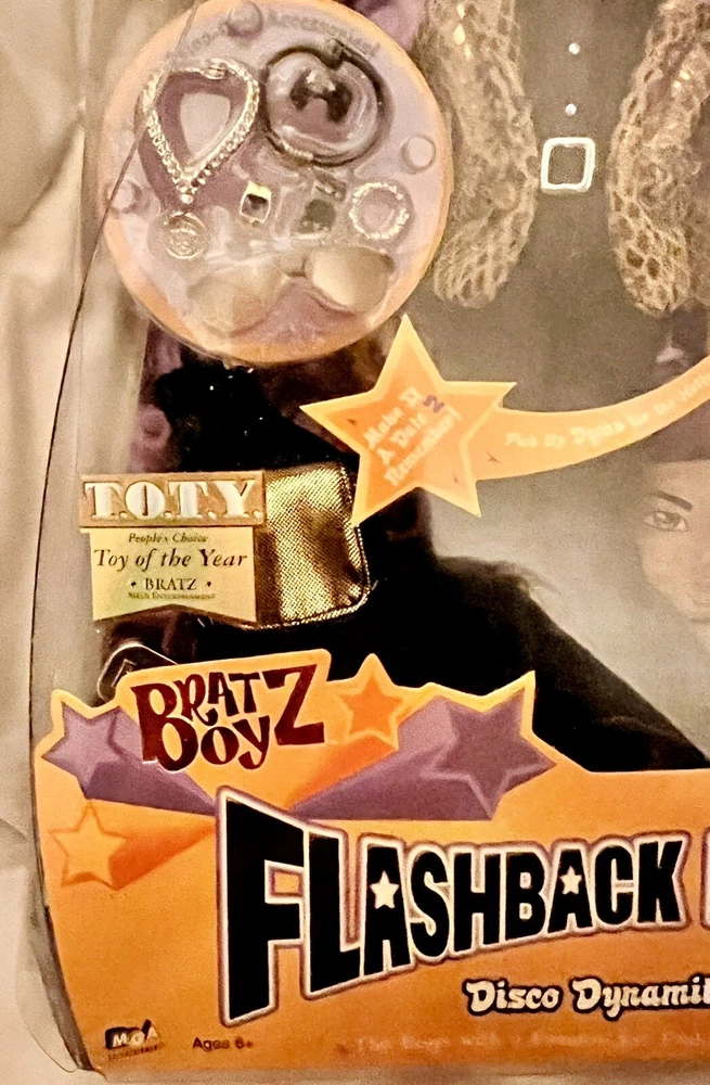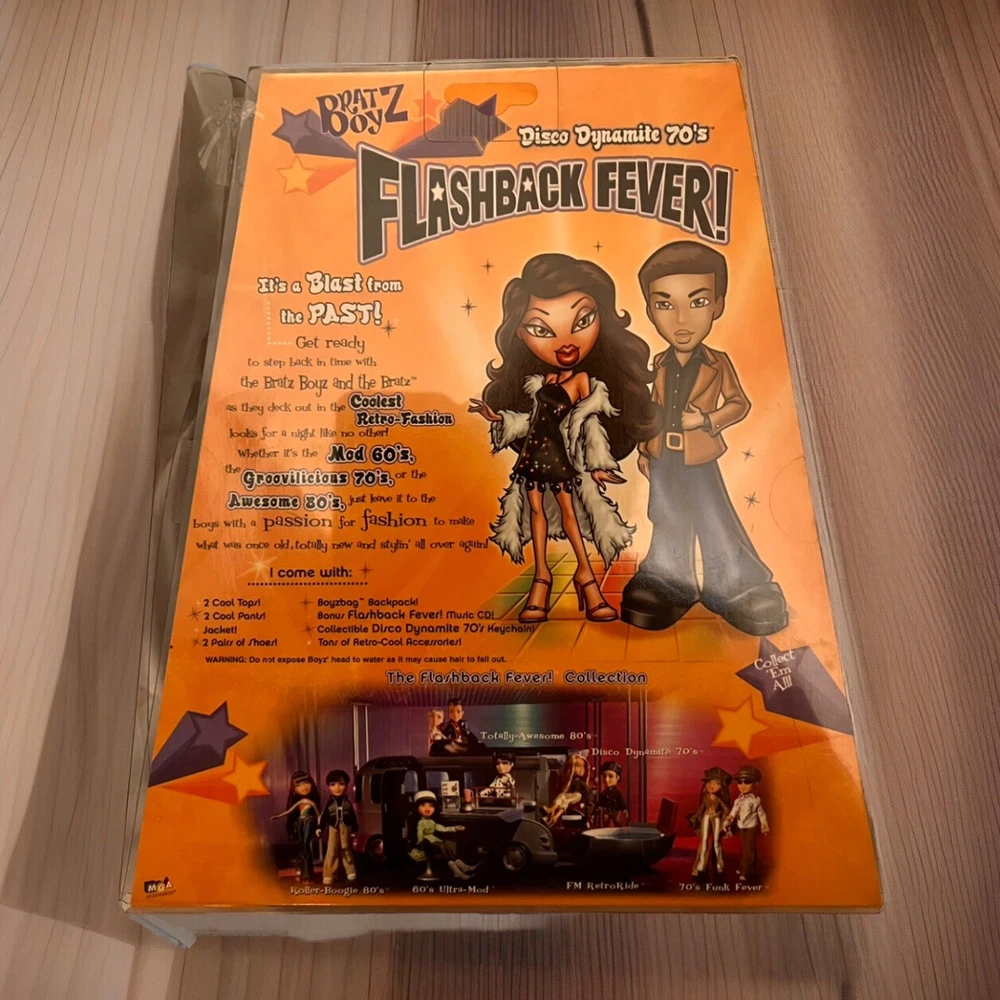 RARE 2004 Bratz Boy “Flashback Fever Disco Dynamite70’s” Collector Doll with Accessories - NEW IN BOX - NEVER OPENED. T.O.T.Y. People’s Choice Toy Of The Year. Includes: Music C.D. With Flashback Hits; “Stayin Alive”, “Last Dance”, “Respect”, “I Will Survive”, “These Boots Are Made For Walking”. A Collectible Disco Dynamite 70’s Keychain Tons of Retro Cool Accessories A Second Outfit A Backpack A Gold Bratz Comb A Pair of Black Boots A Jacket All items included in box. I’ve stored this box in a dry climate controlled room, Non- Smoking! The box has some age and wear due to the age but it’s never been opened! Item will be professionally packaged and shipped immediately upon payment.