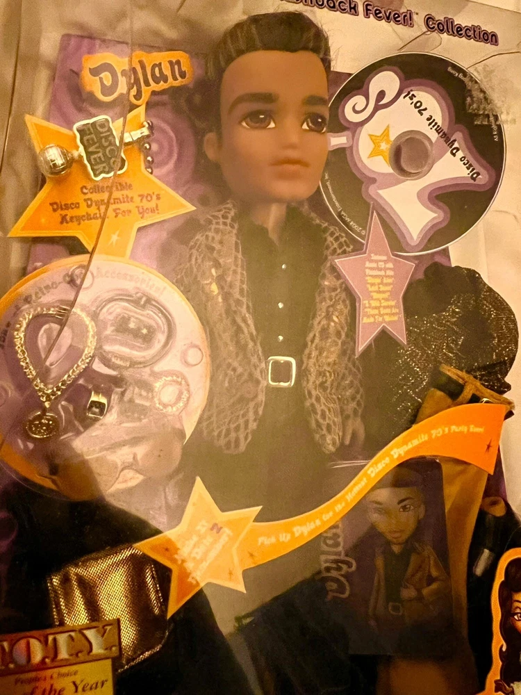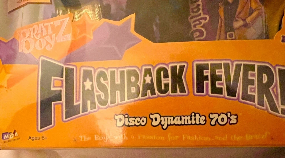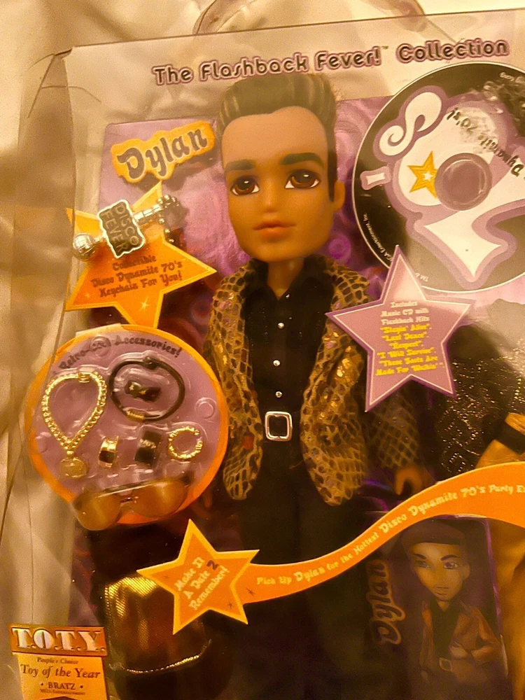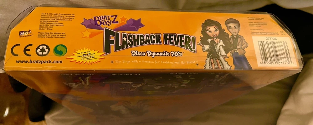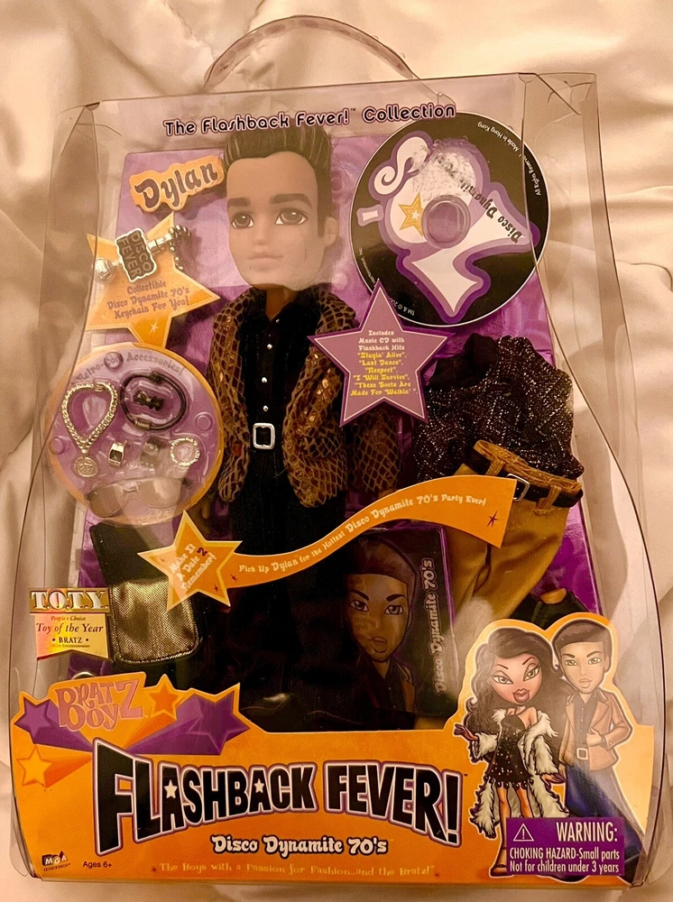 RARE 2004 Bratz Boy “Flashback Fever Disco Dynamite70’s” Collector Doll with Accessories - NEW IN BOX - NEVER OPENED. T.O.T.Y. People’s Choice Toy Of The Year. Includes: Music C.D. With Flashback Hits; “Stayin Alive”, “Last Dance”, “Respect”, “I Will Survive”, “These Boots Are Made For Walking”. A Collectible Disco Dynamite 70’s Keychain Tons of Retro Cool Accessories A Second Outfit A Backpack A Gold Bratz Comb A Pair of Black Boots A Jacket All items included in box. I’ve stored this box in a dry climate controlled room, Non- Smoking! The box has some age and wear due to the age but it’s never been opened! Item will be professionally packaged and shipped immediately upon payment.