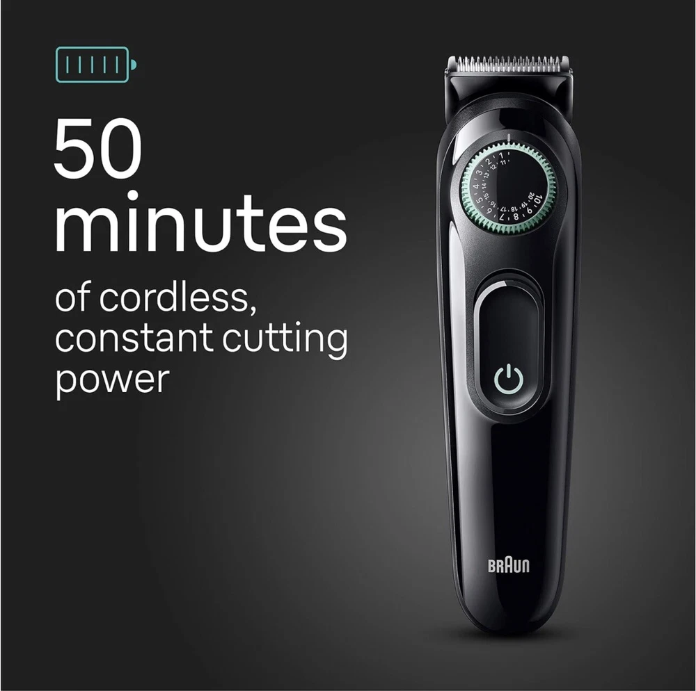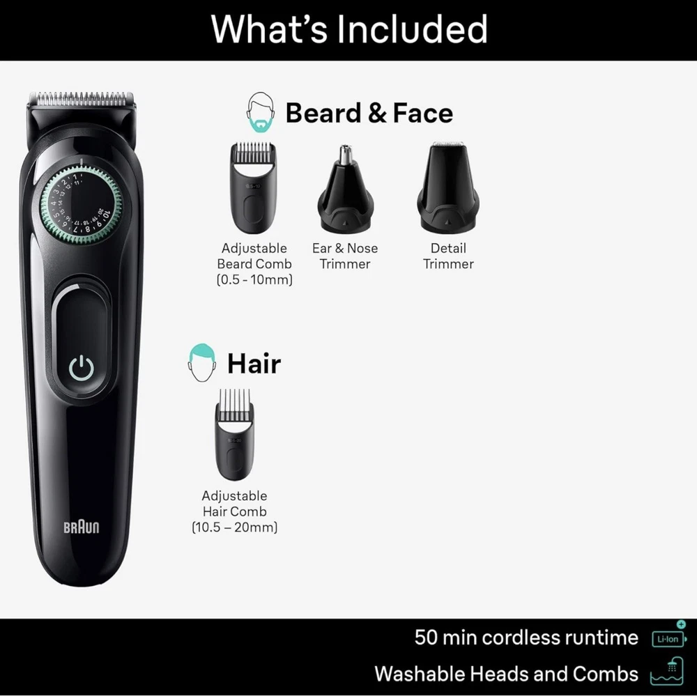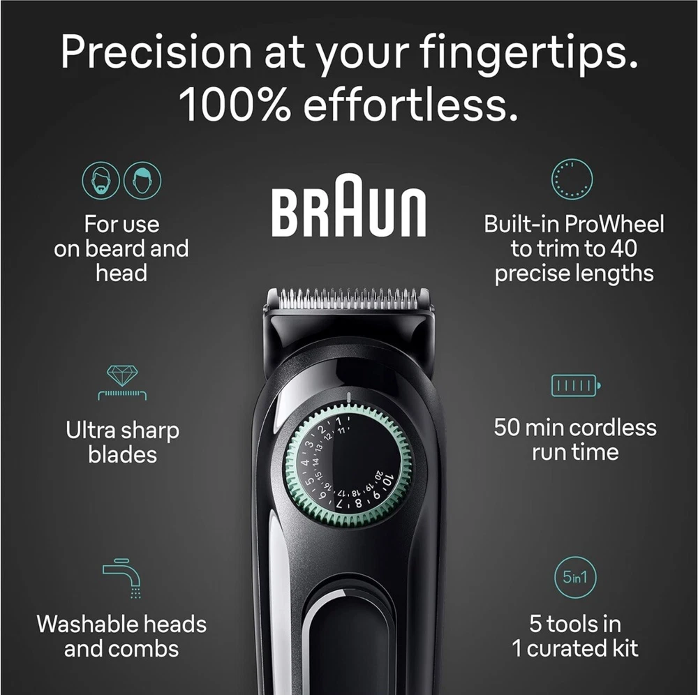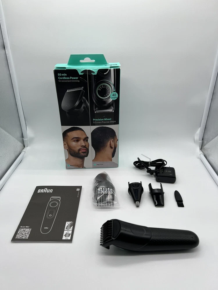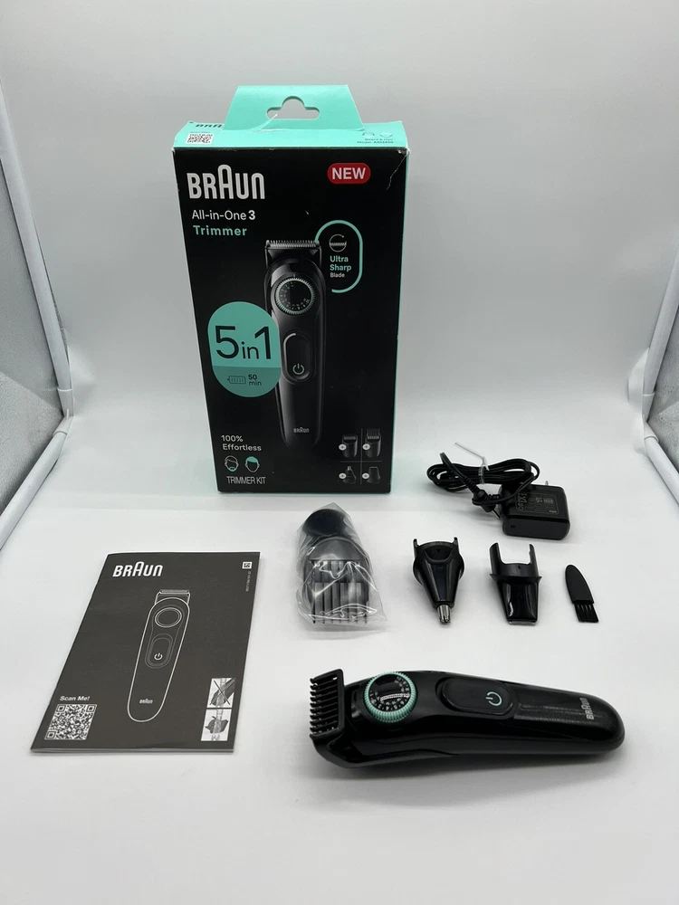 Braun Series 3 All-In-One Style Kit Grooming Hair & Beard Trimmer Q4(13) It’s brand new, open box! THIS 5-IN-1 CURATED style kit meets all your needs: trim your beard and hair, detail, and trim your ears and nose UNLIMITED VERSATILITY, ULTIMATE PRECISION: the Precision Wheel features 20 length settings in 0.02” steps and an adjustable beard comb EASY GROOMING: the ultra sharp blade is efficient for fast grooming all over BUILT TO LAST: this trimmer for men has a powerful batterywith 50-min cordless runtime, long-lasting blades and comes with a washable head and combs EASY CLEANING: this men's trimmer comes with a washable head and combs