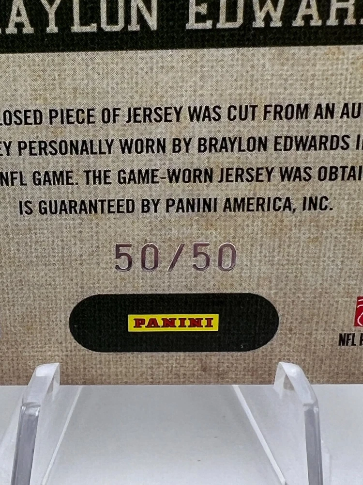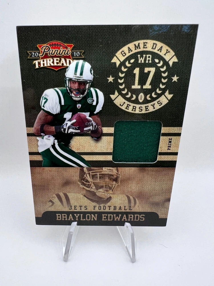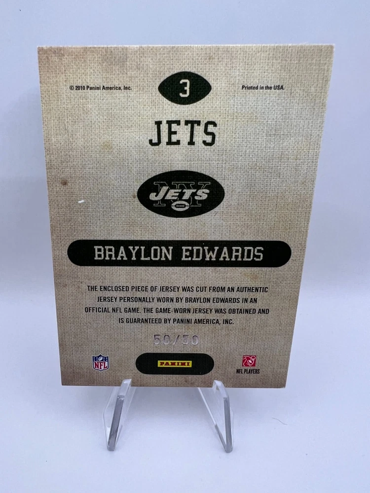 This listing contains a card featuring Braylon Edwards of the New York Jets. The card is number 3 in the 2010 Panini Threads Game Day Jerseys set and includes a prime patch, serial numbered out of 50.