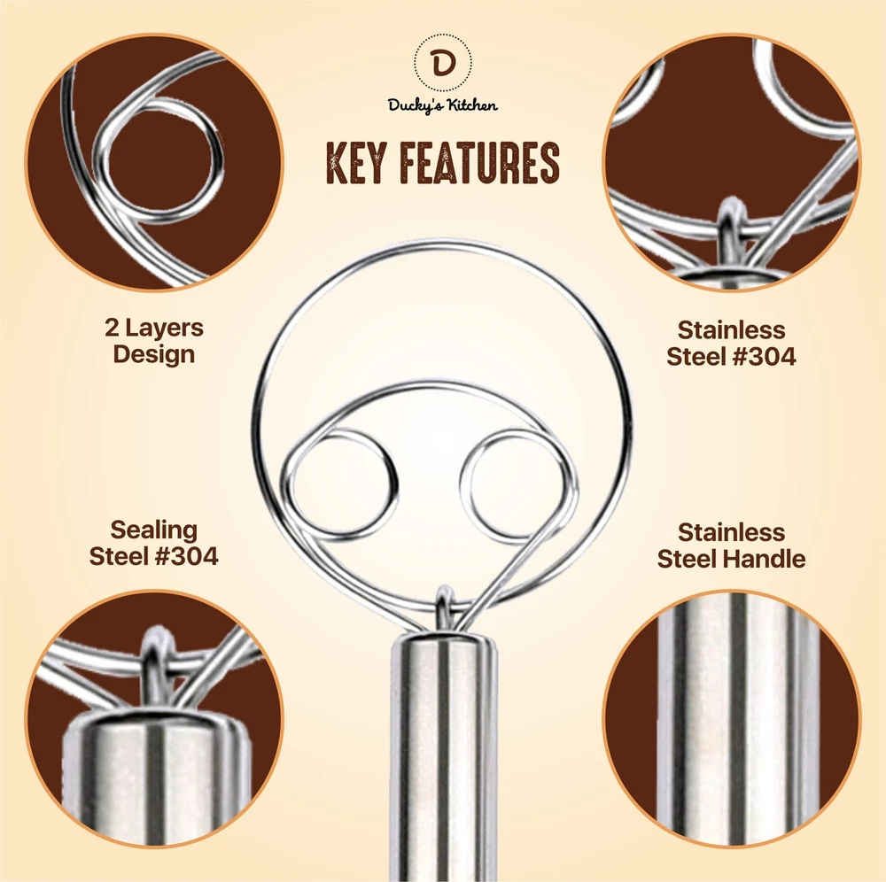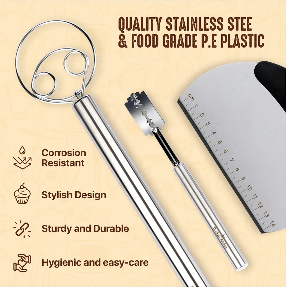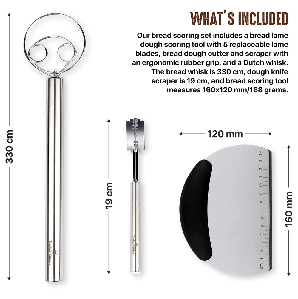 Bread Baking Supplies: Make the perfect loaf of bread with our dough scraper for baking, lame bread tool, and Danish whisk. Our bakers tool set is made with stainless steel for a durable design with easy clean up. This dough kitchen set is a must-have tool in restaurants, hotels, rental properties, and home kitchens. What’s Included: Our bread scoring set includes a bread lame dough scoring tool with 5 replaceable lame blades, bread dough scraper with an ergonomic rubber grip, and a Dutch whisk. The bread whisk is 330 cm, dough scraper is 19 cm, and bread scoring tool measures 160x120 mm/168 grams. Premium Quality: These bread making tools are made of high-grade stainless steel that is rust-resistant. Our bread scraper, bread razor lame, and Dutch dough whisk are easy to clean, safe, and durable. Your Bread, Your Style: Our scoring knife holds the sharp blade at a curved angle allowing you to create deep, smooth, and detailed cuts. This bread lame dough tool makes your bread uniquely yours. Perfect Gift for Bakers: This bread scorer and baking set is a unique gift for anyone who likes to bake! Our bread baker tools set is a perfect gift for holidays, weddings, birthdays and anniversaries.