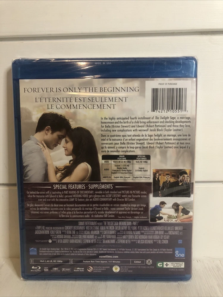 Non-Domestic Product: No Director: unknown Modified Item: No Rating: PG-13 Actor: unknown Genre: Children's & Family, Horror, Action & Adventure Sub-Genre: Supernatural Type: Movie Studio: unknown Format: Blu-ray Disc Movie/TV Title: The Twilight Saga: Breaking Dawn Part 1 Language: English Edition: Special Edition Season: n/a Features: special edition