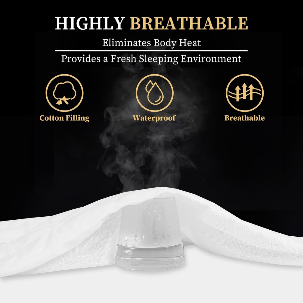 100% WATERPROOF MATTRESS PAD: Our twin size mattress pad has a 100% noiseless TPU waterproof membrane backing. It effectively prevents urine, sweat, body fluids, spilled drink, or any other accidents. You won't hear any plastic sound when you sleep on it. Ideal for home, dorm, hospital, etc. ULTRA-SOFT & BREATHABLE: The twin waterproof mattress pad has fluffy fillings to create a relaxing sleep environment. The hexagonal quilted design keeps the filling amount of each box equally and evenly distributed to provide maximum softness and comfort. The air can easily pass through the microfiber top surface to eliminate the body heat. DEEP POCKET DESIGN: Fitted sheet style with stretchable elastic band perfectly fits 8-21 inches in depth. The side knitted material makes installation easier than other brands. Queen mattress cover (60"x80") offers full protection for the mattress and is always fixed in place when you move or slip all night. SAFEGUARD BED PAD COVER: Our waterproof mattress pad has OEKO-TEX certification. It proves that our product is free from vinyl, BPA, phthalate, or other harmful chemicals. With our twin waterproof mattress pad, you can enjoy your sleep without runny eyes or stuffy noses. MACHINE WASH & WARRANTY: Machine washable and dryer friendly. Easy to clean with cold water on a gentle cycle, and tumble dry low to extend the function of waterproof TPU. Do not iron, do not bleach. We offer a 90-day refund with no questions asked and 24 hour customer service. Please try our product without hesitation!