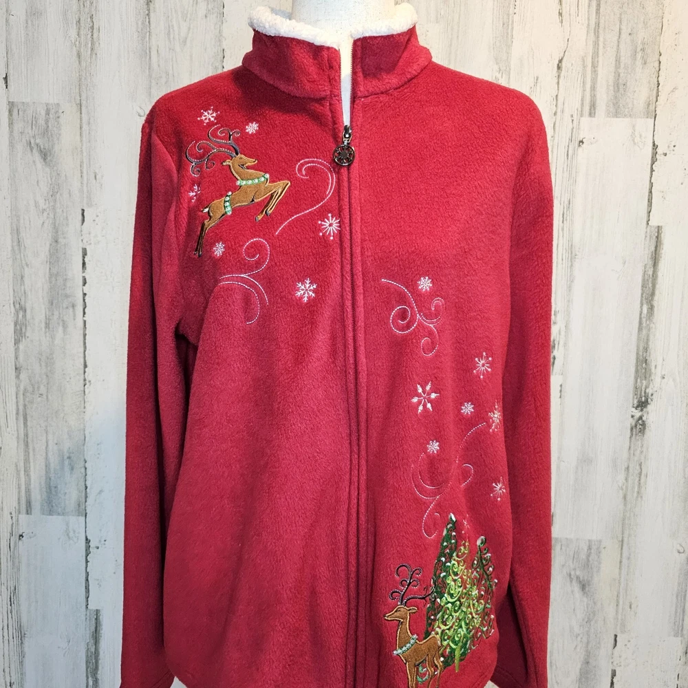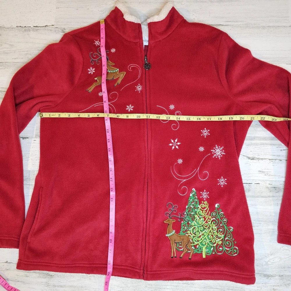 Celebrate the holiday season in style with this festive Breckenridge red fleece jacket. Designed for warmth and charm, it features a cozy sherpa-lined collar and intricate embroidered details, including a prancing reindeer, Christmas trees, and snowflakes. Perfect for holiday gatherings or casual winter outings. Brand: Breckenridge Size: Large (Women's) Material: 100% Polyester Color: Red Features: Sherpa-lined collar for added warmth Full-zip front with decorative pull charm Embroidered reindeer, Christmas trees, and swirling snowflakes Side pockets Measurements: Bust (pit to pit): Approx. 21 inches Length (shoulder to hem): Approx. 26 inches Condition: Pre-owned, gently worn, in excellent condition with no noticeable flaws. #BreckenridgeJacket #ChristmasJacket #RedFleeceJacket #SherpaCollar #HolidayFashion #ReindeerEmbroideredJacket #ChristmasGiftIdea #WinterWardrobe #WomenLarge
