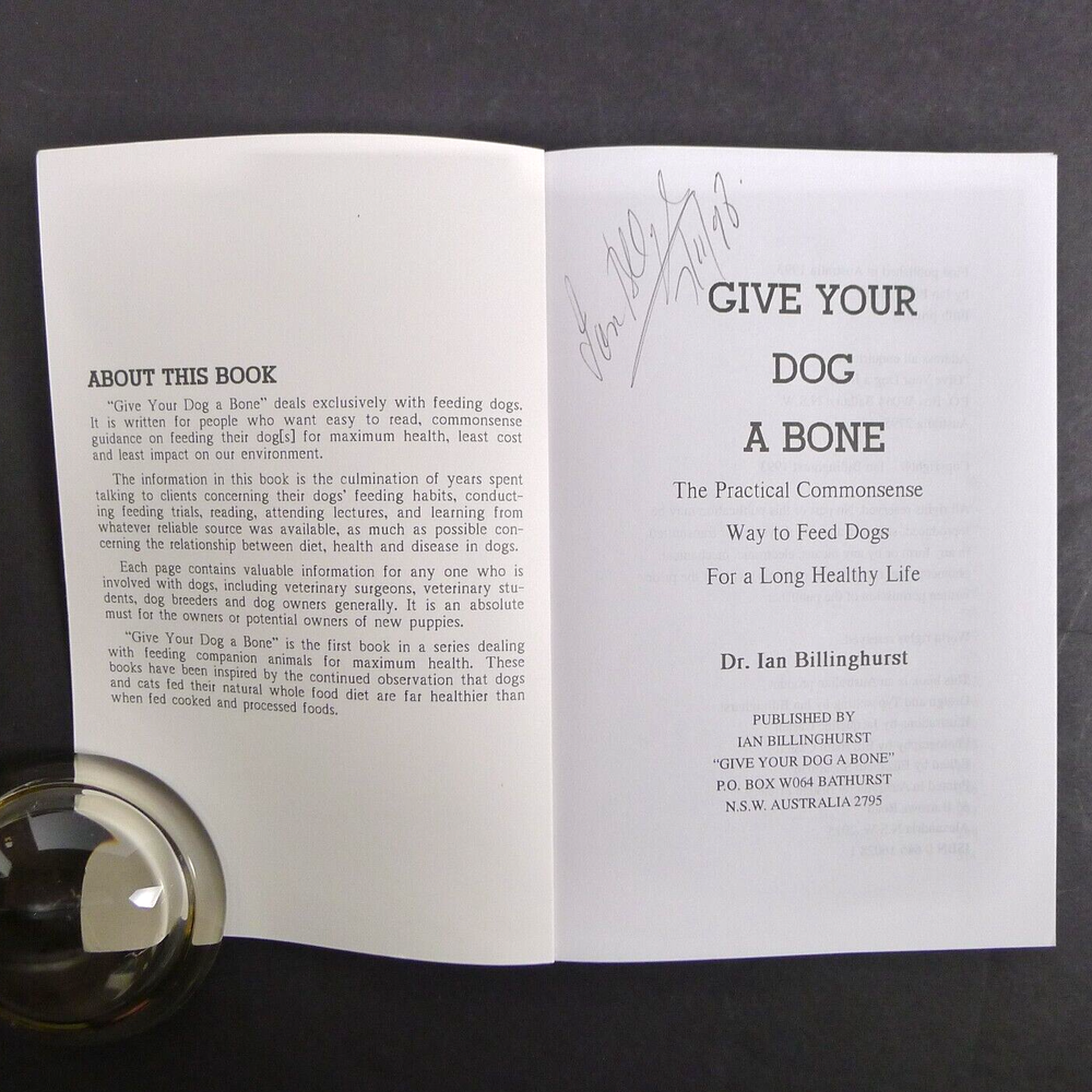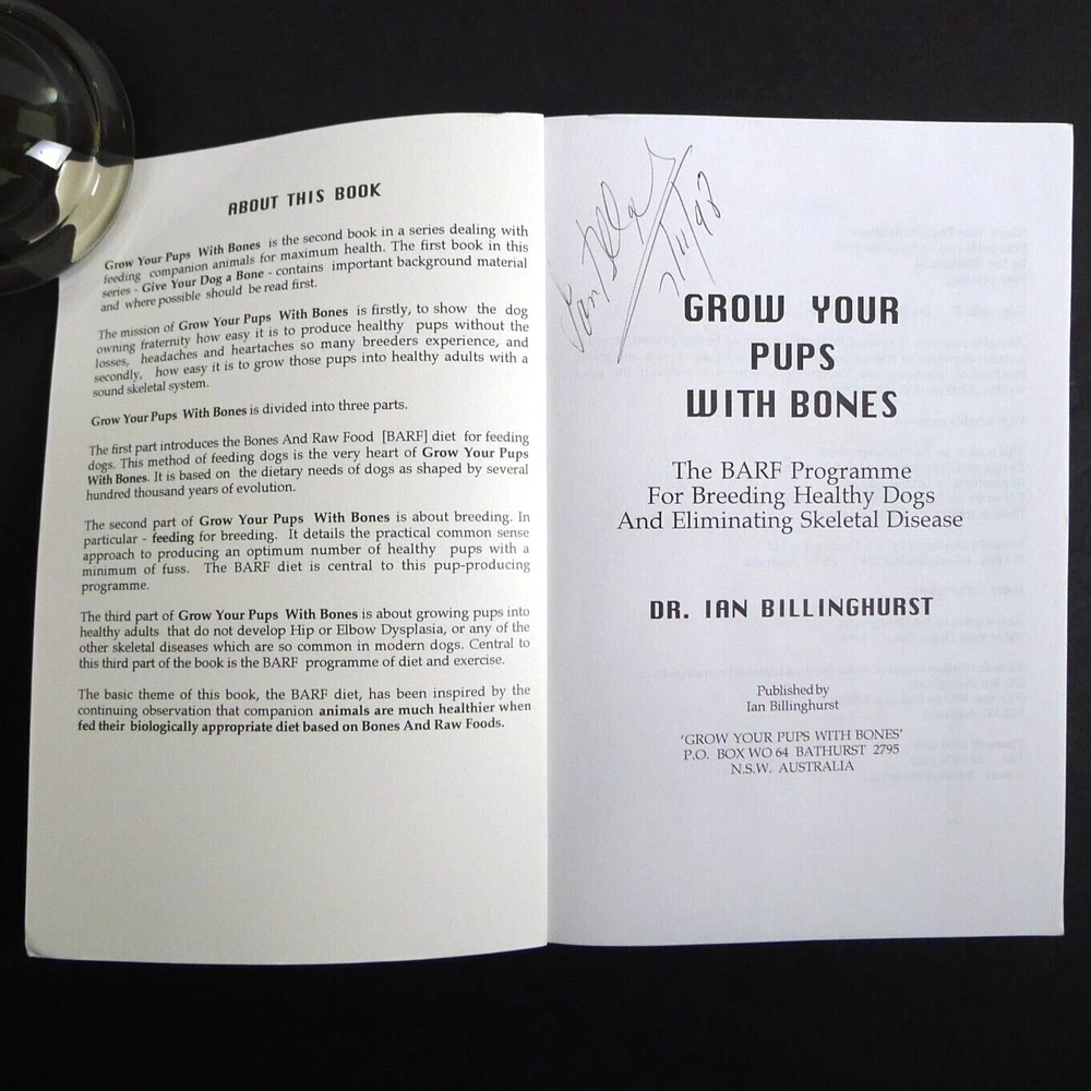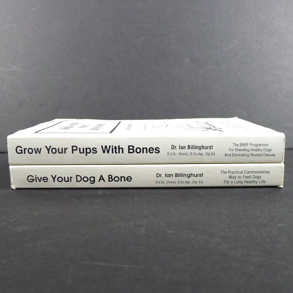 "Grow Your Pups with Bones" and "Give Your Dog a Bone" by Dr. Ian Billinghurst are groundbreaking books that challenge conventional pet nutrition. They introduce the BARF (Bones and Raw Food) diet, emphasizing natural, raw ingredients for optimal canine health. These books offer practical guidance for dog owners and breeders, promising improved vitality and reduced skeletal issues through evolutionary-based feeding principles. Grow Your Pups with Bones The BARF Programme for Breeding Healthy Dogs and Eliminating Skeletal Disease Give Your Dog a Bone The Practical Commonsense Way to Feed Dogs for a Long Healthy Life These books are in great condition, both signed. ~ ~ ~ Please examine the photos closely. They are an important part of the description and represent the exact item you will receive. I am happy to provide more photos and answer specific questions about this book or any item in my shop. I ship daily and all orders are wrapped with care including cardboard for protection.