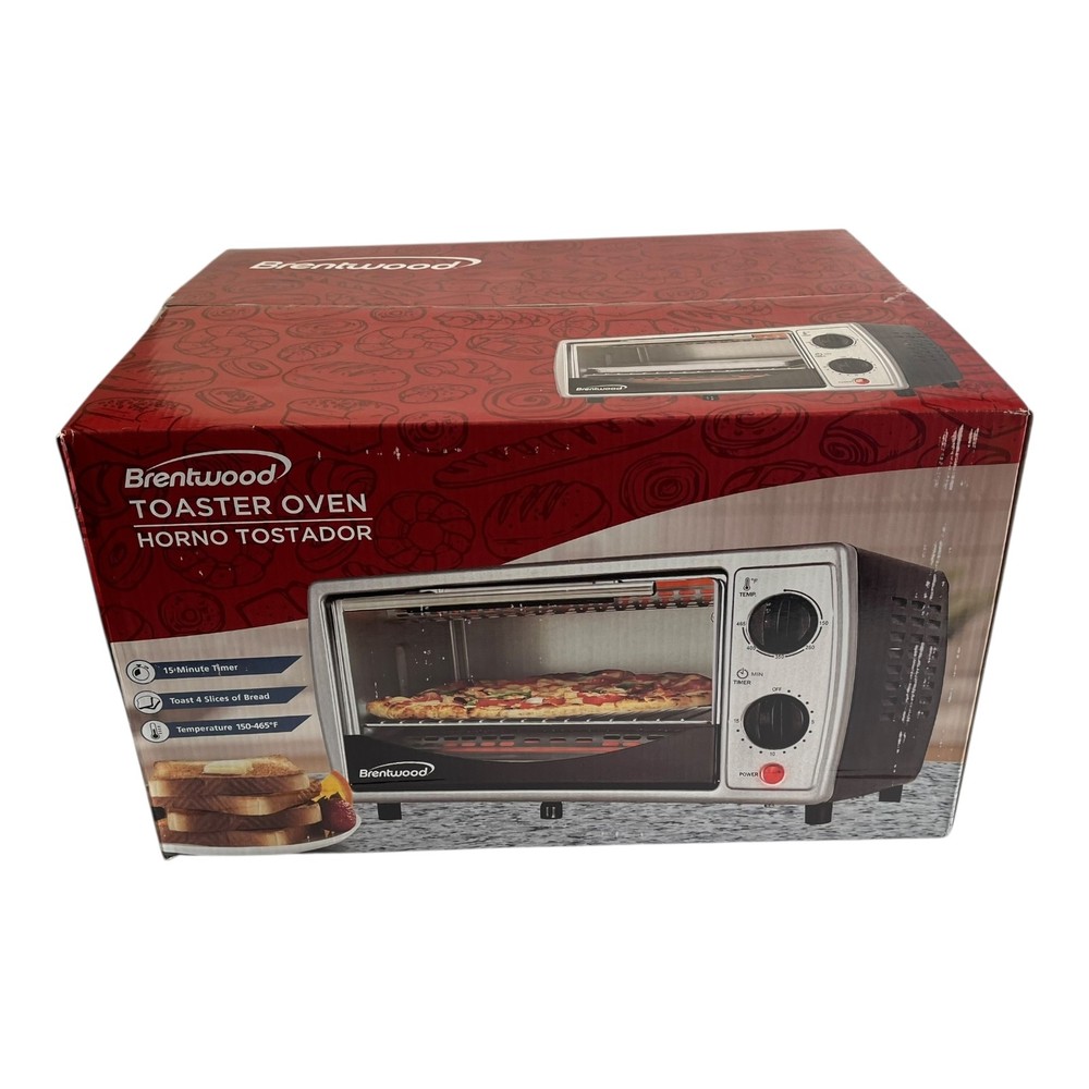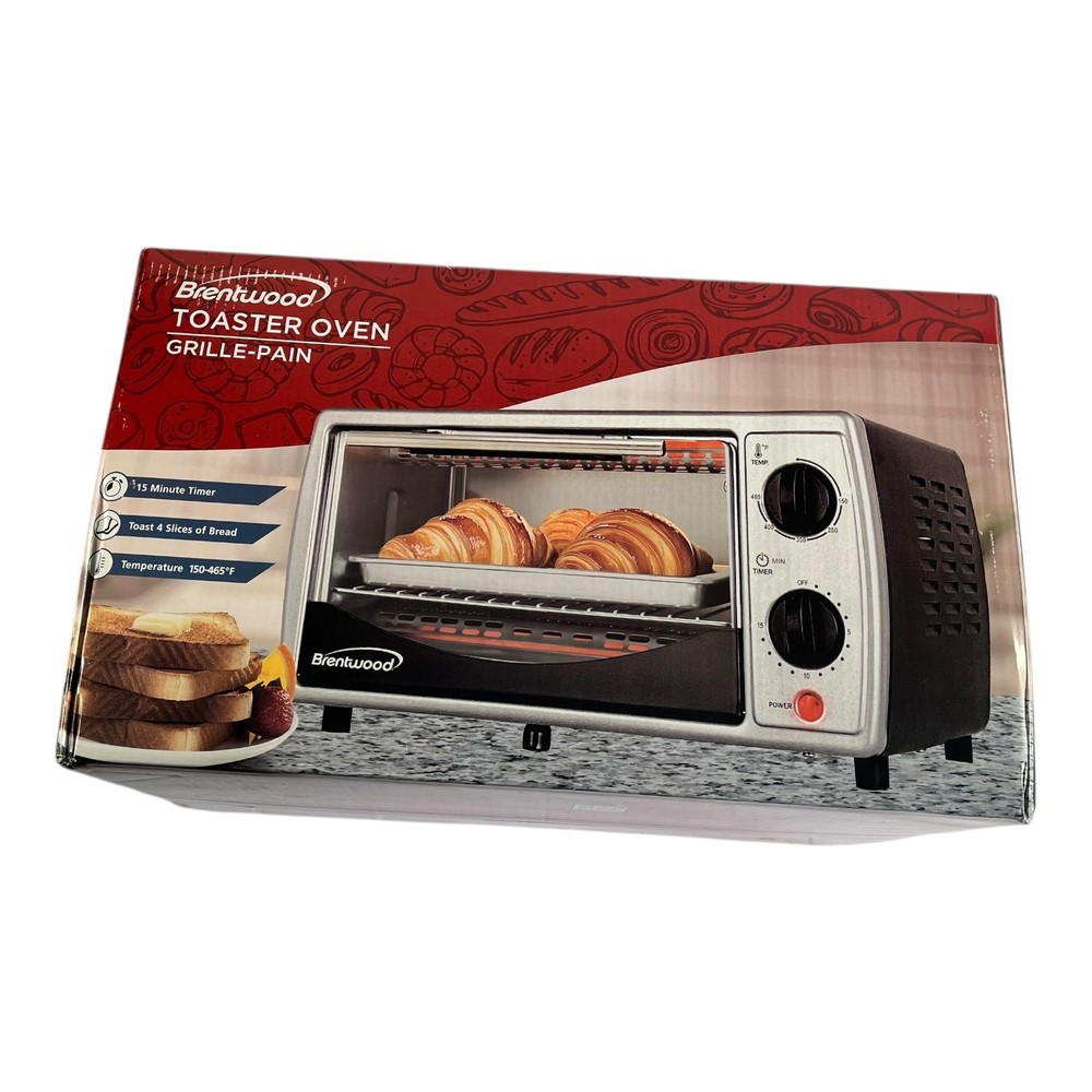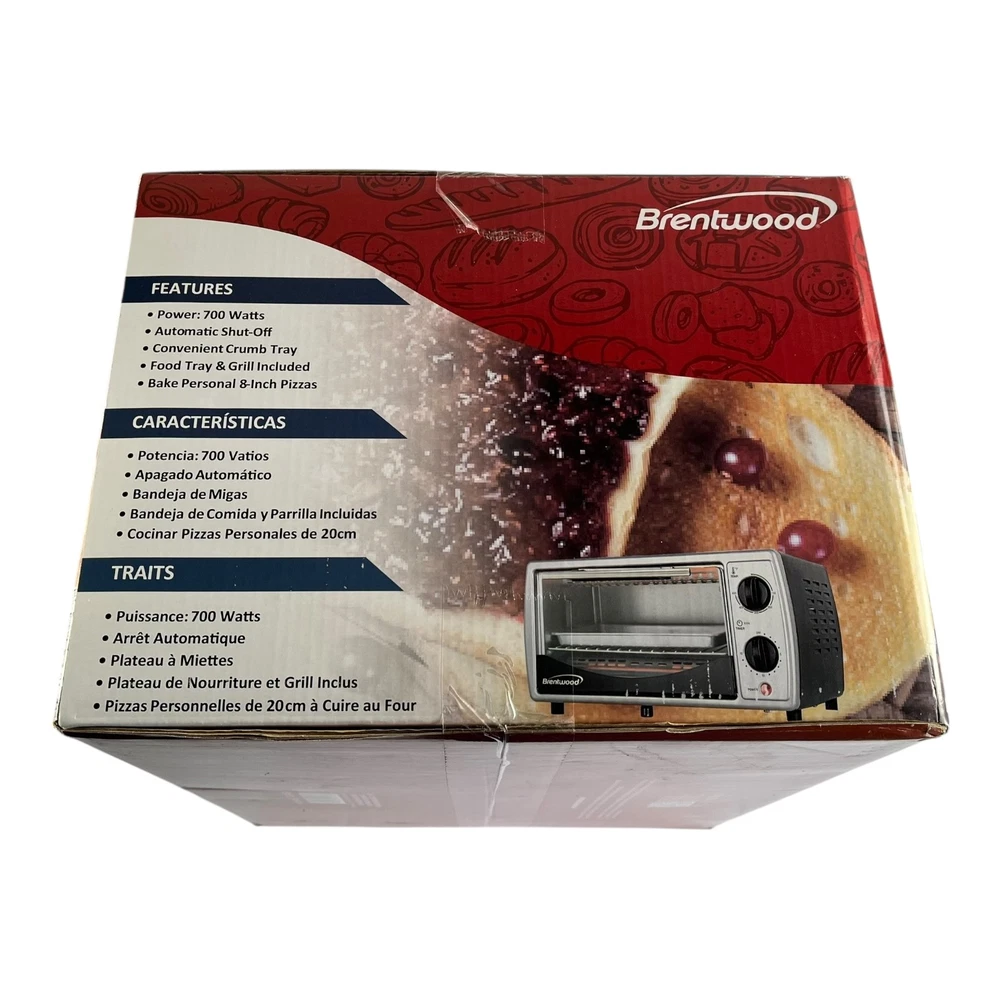 Brentwood TS-345B Toaster Oven - Bake, Toast, and Grill! This brand new Brentwood TS-345B Toaster Oven is perfect for your kitchen. It offers versatile cooking options including toasting, baking, and grilling, making it ideal for a variety of meals and snacks. Key Features: 15-Minute Timer: Easily set cooking times with the convenient 15-minute timer. Adjustable Temperature: Control your cooking with a temperature range from 150°F to 465°F. Toast 4 Slices: Perfect for breakfast, toast up to 4 slices of bread at once. 700 Watts Power: Efficiently cooks and toasts your food. Automatic Shut-Off: For safety and convenience. Convenient Crumb Tray: Makes cleanup a breeze. Food Tray & Grill Included: Comes with essential accessories for immediate use. Bake Personal Pizzas: Can bake personal 8-inch pizzas. Multilingual Packaging: Features information in English, Spanish, and French. Condition: This item is brand new and has never been used. It is in its original sealed packaging, ensuring it arrives to you in perfect condition.