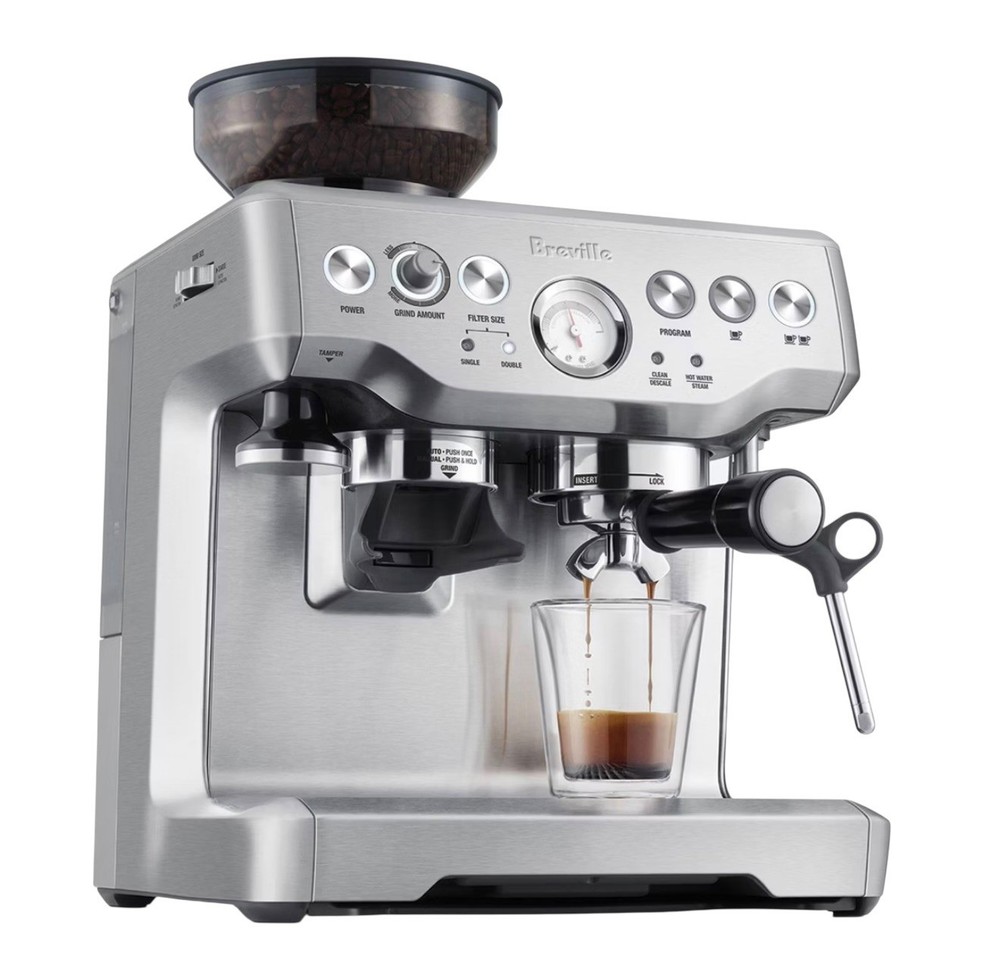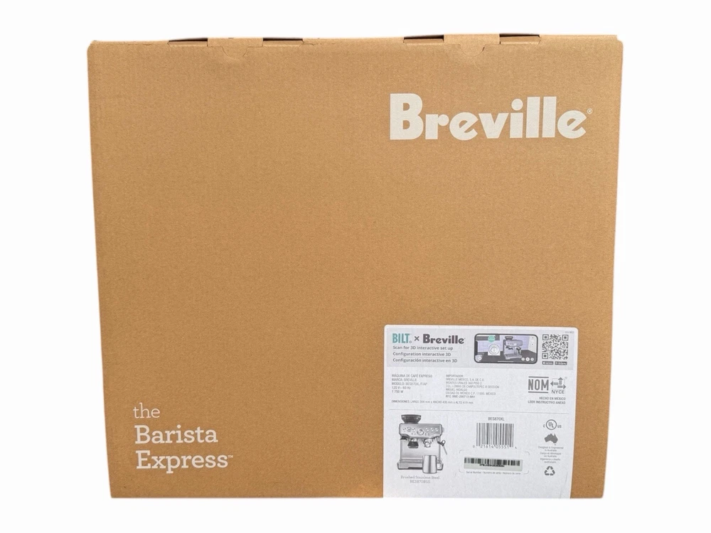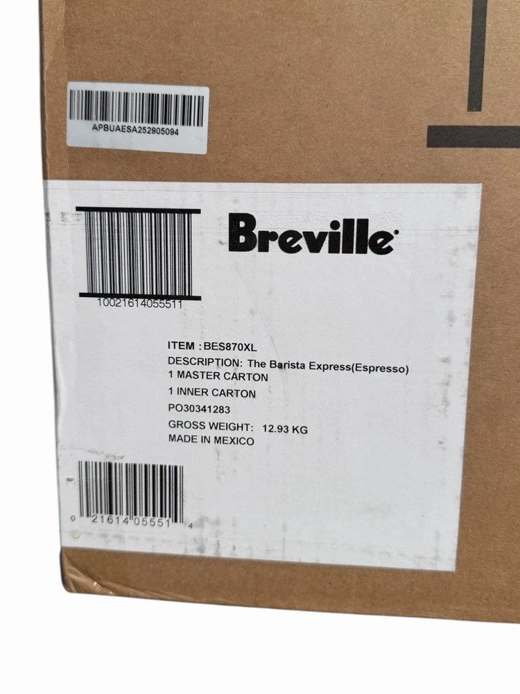 Brand New – in original shipping and retail cartons DESCRIPTION: Breville Barista Express espresso machine Model: BES870XL / Brushed Stainless Steel BES870BSS Built-in conical burr grinder with 16 grind settings Thermocoil heating system 54mm portafilter Hands-free grinding cradle Made in Mexico Designed and engineered in Australia WHAT’S INCLUDED (per retail box contents): – BES870XL espresso machine – Portafilter – Filter baskets – Water tank with filter – Tamper – Milk jug – Manuals also included in box UPC: 021614055514 Power: 120V / 60Hz / 1750W