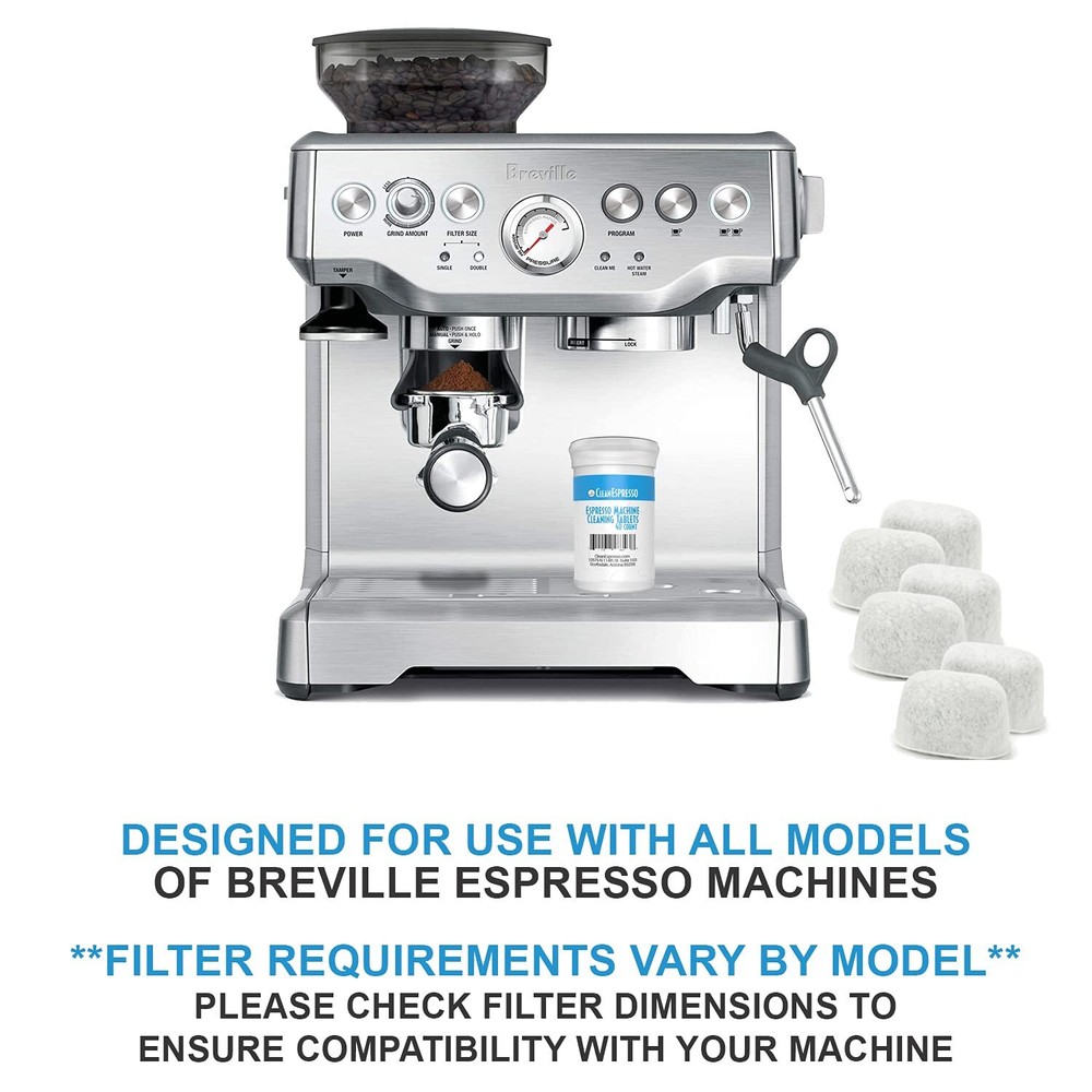 Better Tasting Espresso & Longer Machine Life! Clean your Breville Espresso Machine with ease using these espresso machine cleaning tablets from . They are designed for use with all models of Breville machinesThese are what you need to clean your machine of it's oils and remove any built up residue. They are what you need at half the price of the store! This 40 pack will come in a white small tube and needs to be used along with the factories recommendations.We have sold thousands of these to happy customers that have saved money to clean their machines over the store prices. Since Breville has different models, and sometimes different instructions, you need to follow the instructions for your machine with these tablets. There will not be any instructions provided with this orderIf you don't have the manual, download it online to use the cleaning cycle properly. Our Tablets may vary in size from the sample pack provided by Breville, but they are made specifically to clean their machines. ENJOY OUR MONEY BACK GUARANTEE - If you are for any reason unsatisfied, send the tablets back to us and get a full refund! We earn our 100% customer satisfaction! Directions for Use: 1. Place the filter cartridge in water & soak for 10 minutes. It is NORMAL for black charcoal dust to seep into the water. This is the reason we soak the filters! 2. While the filter soaks, clean your machine with the tablet. Remove the old water filter first and clean as instructed in your manual (cleaning cycles vary by model number) 3. Rinse the filter in fresh water and insert the new filter into your machine. BETTER TASTE: Get better tasting espresso & cappuccino by removing oily buildup inside your machine and keeping its parts clean 2 GRAM TABLETS: Effectively cleans Breville espresso machines without hassle or waste, offering double the cleaning power compared to 1 gram tablets that cannot hold up to the cleaning cycle pressure DESIGNED FOR BREVILLE MACHINES: Breville Brewer Cleaning Tablets Designed For Use With Most Models: Including Barista Express, bes860xl, bes870xl, bes900xl, 800esxl, bes980xl Oracle and More. Does NOT fit BES880 (Barista Touch) or BES990 - Batch 1747 and newer (Does Fit Older Models) QUALITY CLEANING: cleaner tablets automatically clean inner machine parts and provide a precise cleaning experience. These cleaning tablets are essential espresso machine accessories PLUS REPLACEMENT FILTERS: For even better tasting coffee. Filter dimensions approximately: 2 in x 1.25 in x 1.25 in (Base x Width x Height) - 5.3 cm x 3.5 cm x 3.5 cm. Replaces model BWF 100. Follow included instructions for prepping filters