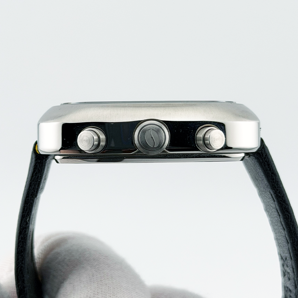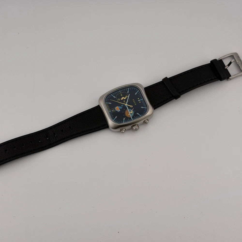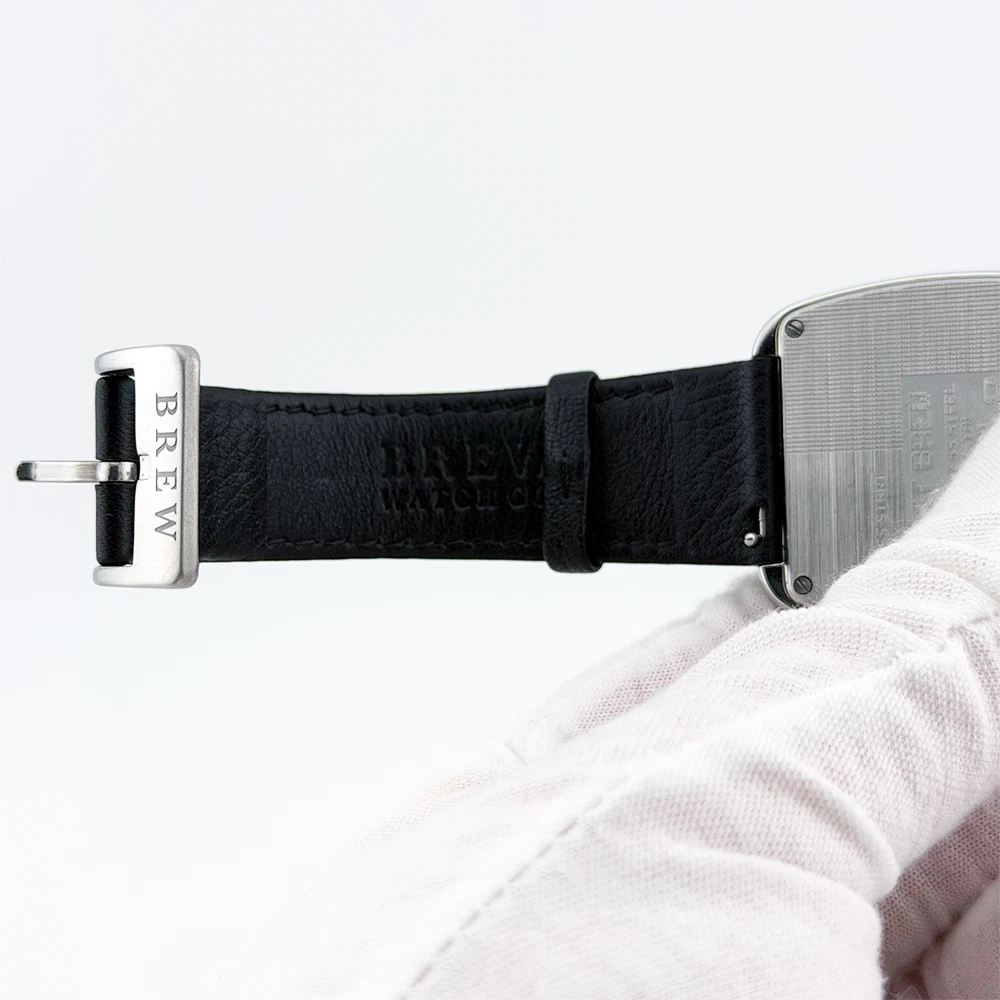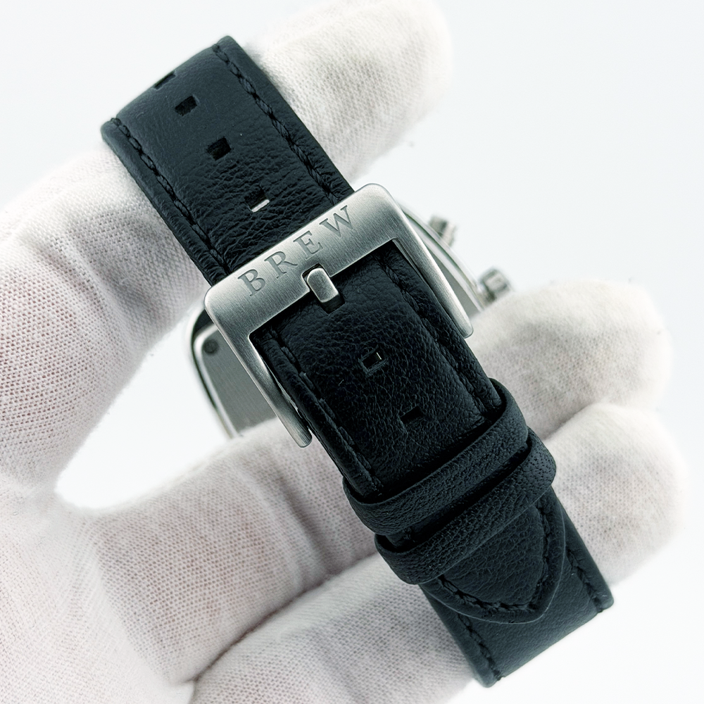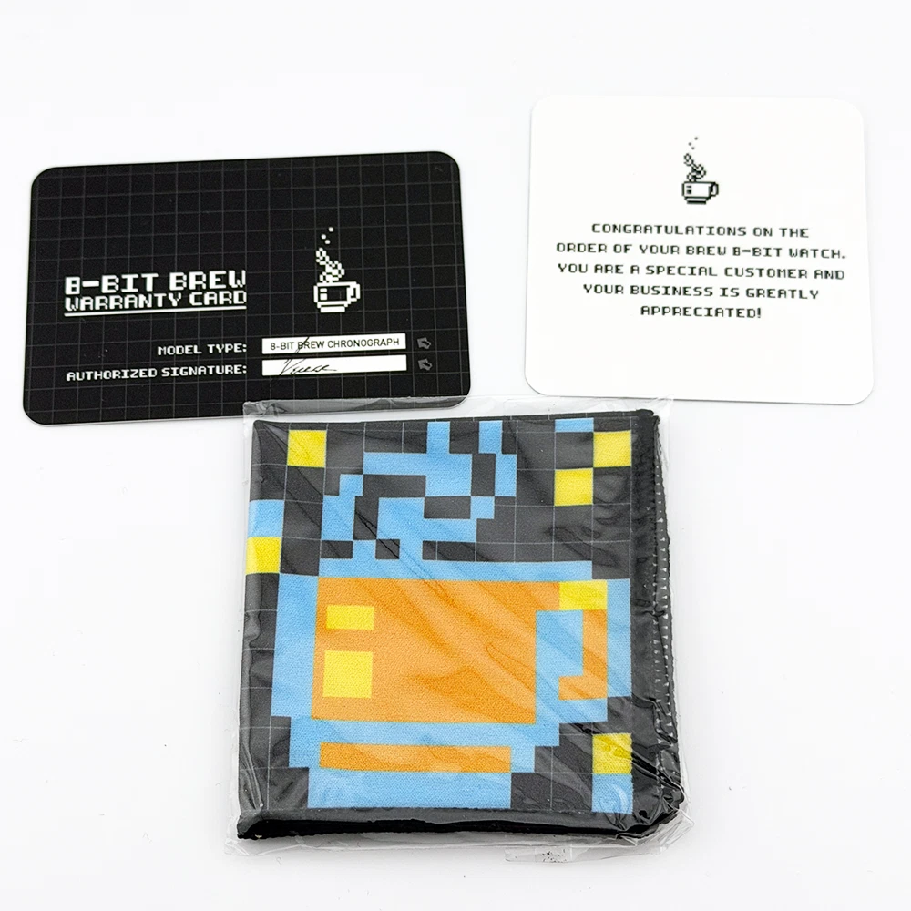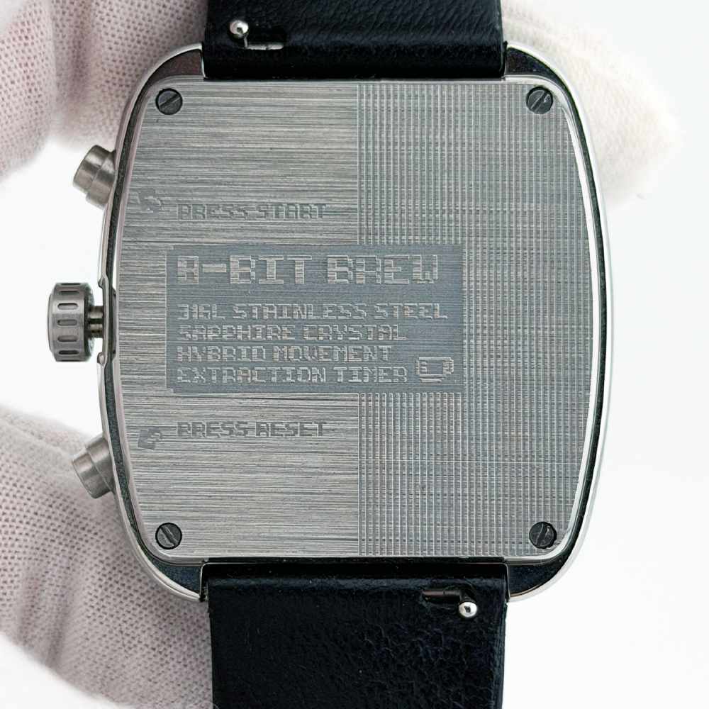 What's Included: Brew 8-Bit Brew Chronograph watch Original outer shipping box 8-Bit Brew metal presentation tin Warranty card (signed, model: 8-Bit Brew Chronograph) Microfiber cloth (pixel coffee design) Thank you card Why Buy From Us: Discontinued model, increasingly hard to find In-stock and ships same business day 100% authenticity guaranteed Key Details: Brand & Model: Brand: Brew Watch Co. Model: 8-Bit Brew Chronograph Condition: Pre-owned, excellent Size & Measurements: Case Diameter: 38mm Case Shape: Cushion/TV-style Case Material: 316L stainless steel Case Finish: Brushed top, polished sides Movement: Type: Hybrid movement Functions: Hours, minutes, seconds, date, chronograph, extraction timer Features: Crystal: Sapphire Dial: Black with retro 8-bit pixel art Dial Details: Pixel coffee cup with steam at 6 o'clock, pixel globe subdial at 3 o'clock, 60-second chronograph counter at 9 o'clock Hour Markers: Blue/cyan applied indices with orange accents Hands: Yellow hour/minute, blue chronograph seconds Date: Window at 6 o'clock Caseback: Solid, brushed finish with 8-bit engraving, "Press Start" and "Press Reset" markings Strap: Material: Black leather Buckle: Stainless steel, Brew-signed Strap Branding: Brew Watch Co. embossed Condition Notes: Crystal: Perfect, no marks Case: Clean with minimal wear Pushers/Crown: Function smoothly Strap: Good condition, light use All chronograph functions working Shipping: Ships same business day via insured shipping UK-based seller with tracking provided Questions? Message us anytime!